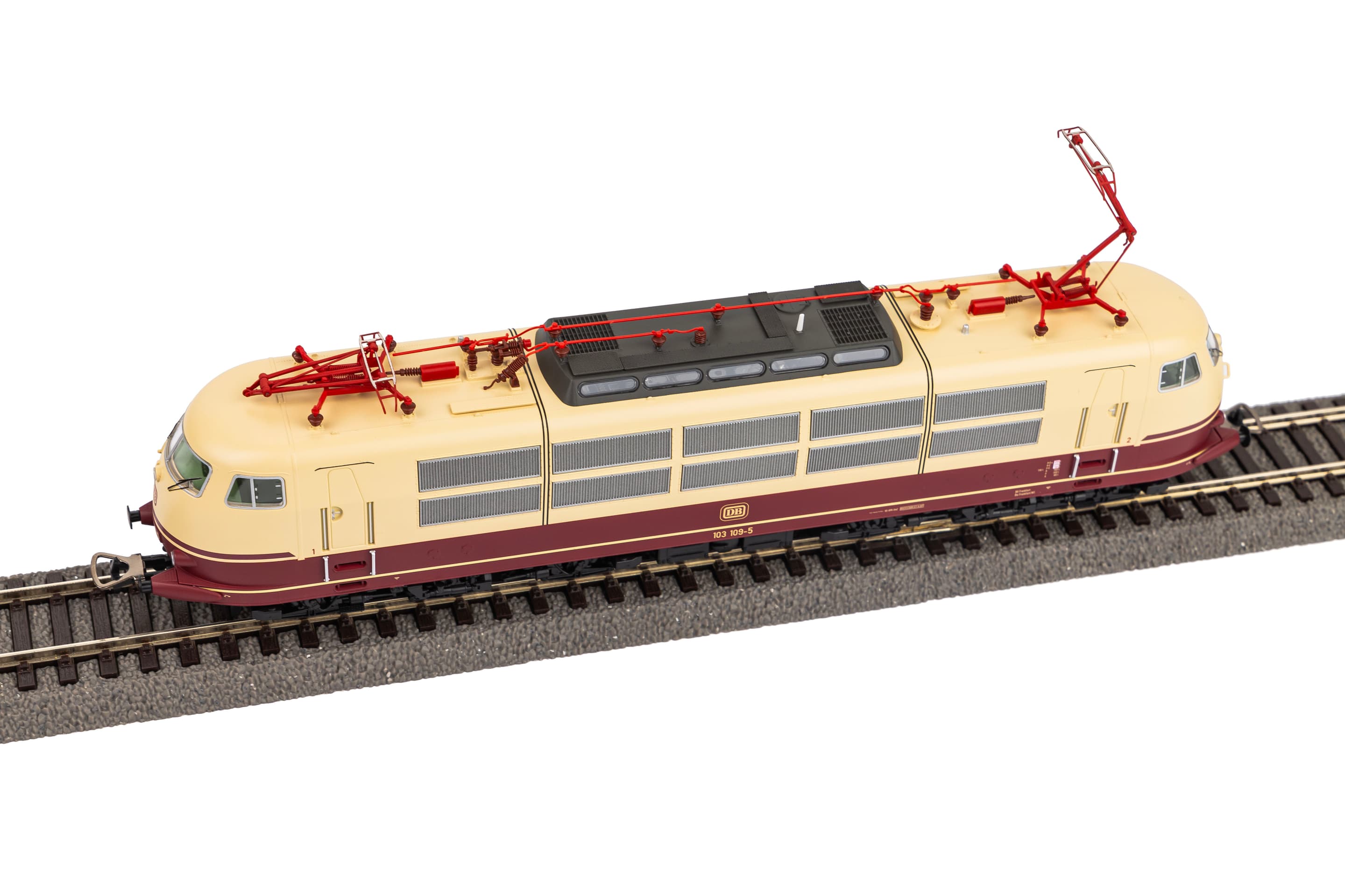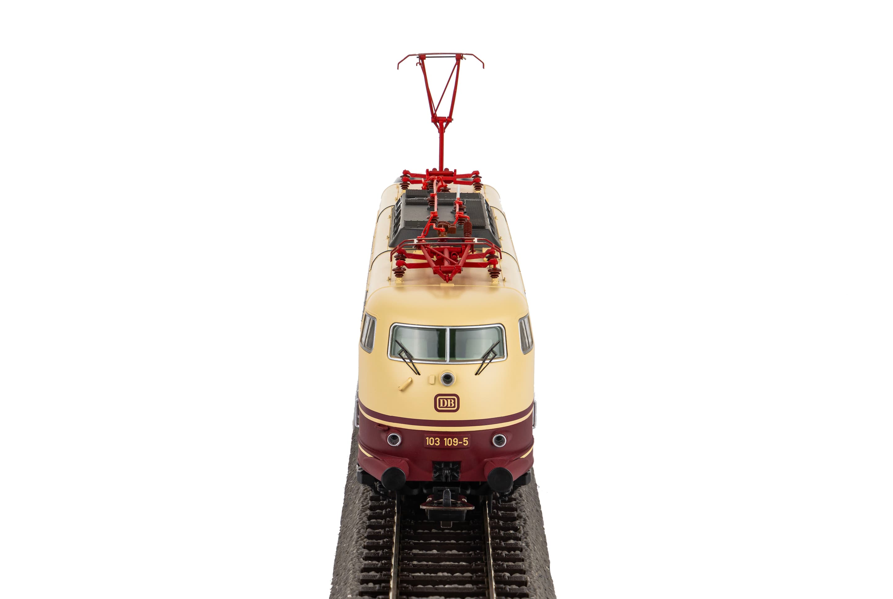 Neuheit 2024: Formvariante der BR 103 als kurze Ausführung der DB in Epoche IV. Das Modellüberzeugt durch einen schweren Metalldruckgussrahmen mit fein detailliertem Gehäuse, feinster Lackierung und Bedruckung und filigranen Metall-Einholmstromabnehmern. Der fünfpolige, kugelgelagerte Motor sorgt mit zwei Schwungmassen für ausgezeichnete Fahreigenschaften. Der LED-Lichtwechsel erfolgt fahrtrichtungsabhängig weiß/rot und ist wie die Führerstandsinnenbeleuchtung mit einem PluX22-Decoder digital schaltbar. Das Modell besitzt ab Werk einen passenden PSD XP Sound-Decoder mit größtmöglichem Lautsprecher.