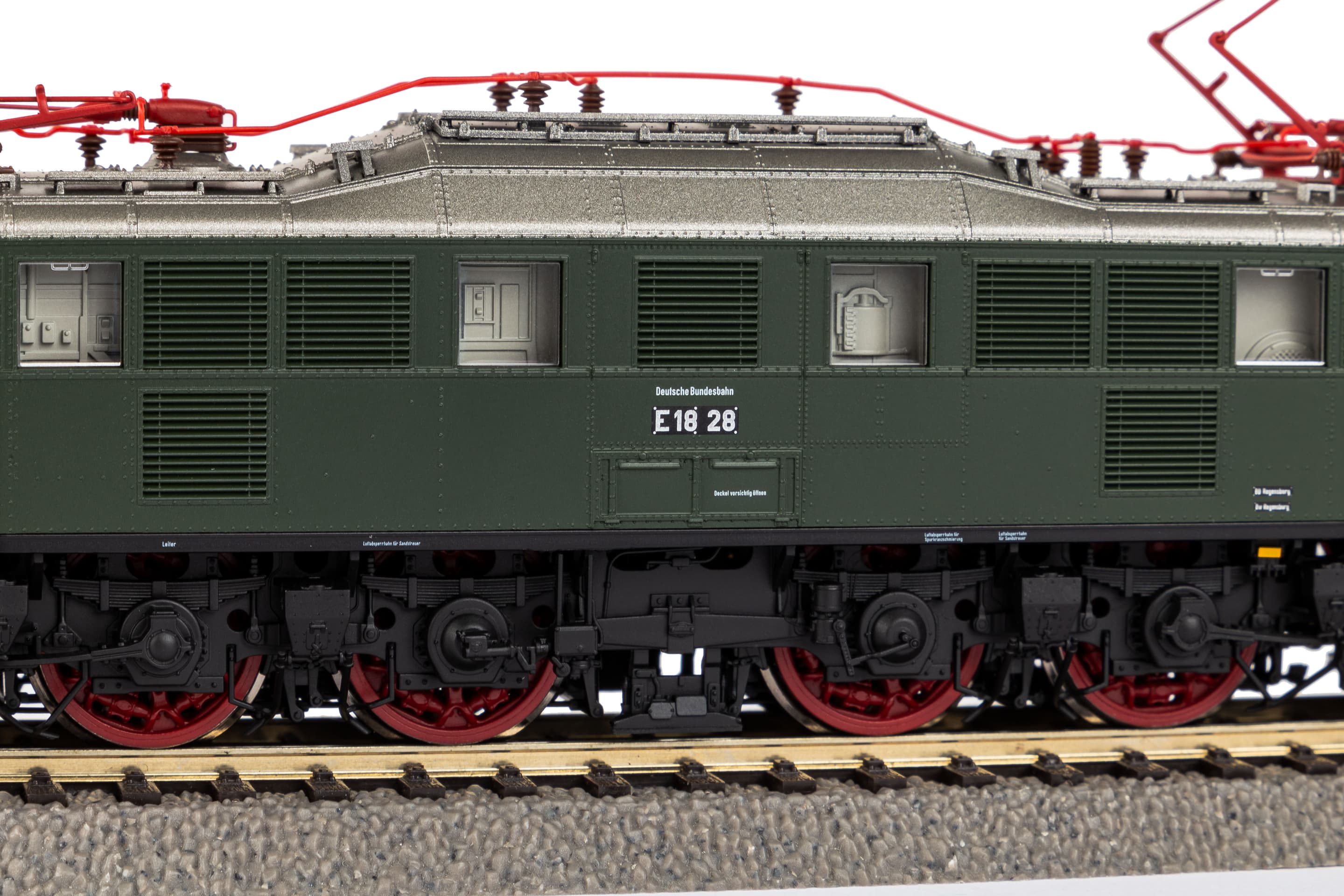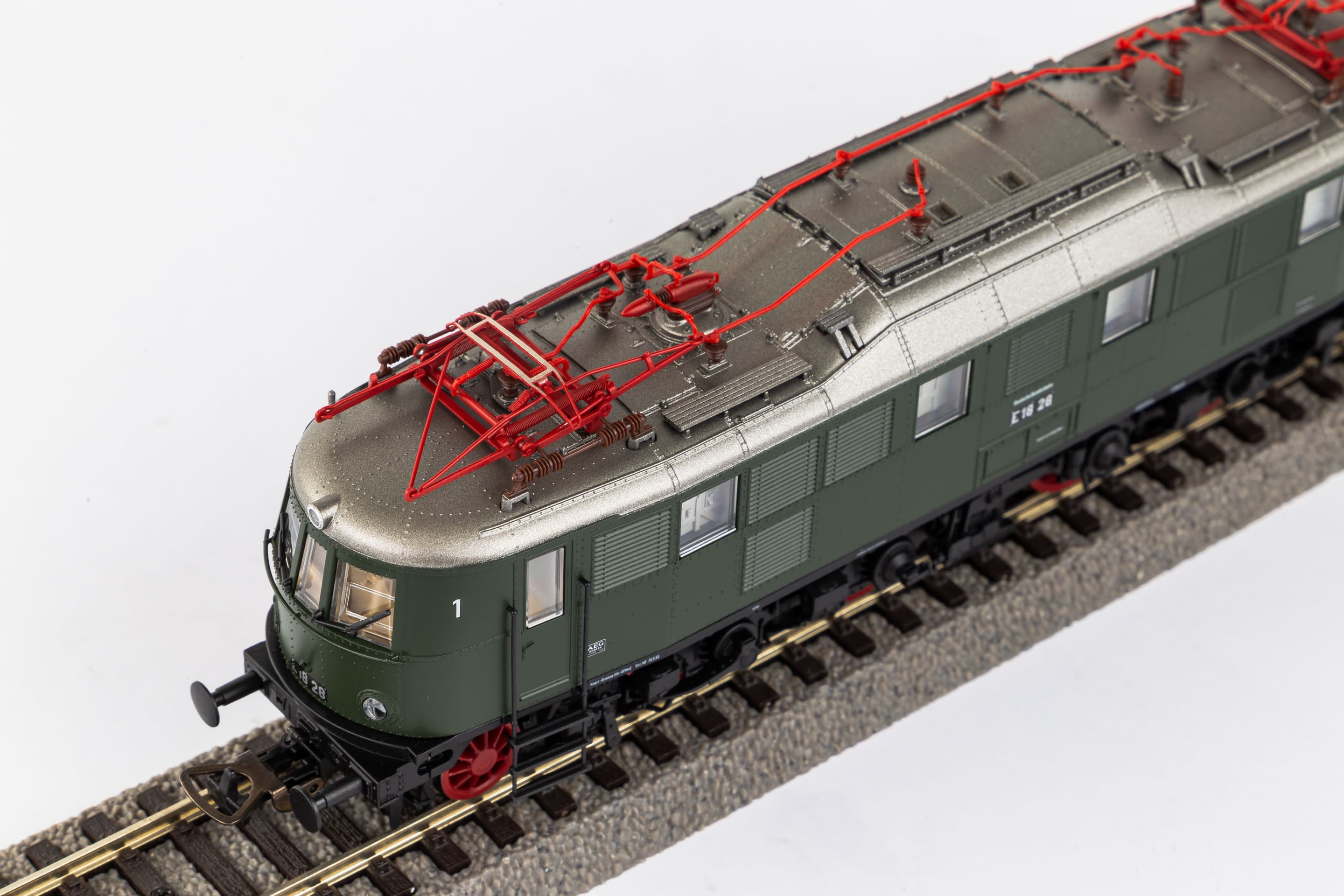 Neuheit 2023: Druckvariante der Kultlokomotive der BR 118 in der Ausführung als E 18 der DB in Epoche III. Das PIKO Modell überzeugt durch die stimmige Umsetzung ihrer Vorbildmaschine der Bundesbahn. Hervorzuheben sind die feinen Radsätze, die exakte Nachbildung der vorbildgerechten Dachausrüstung mit filigranen Stromabnehmer und die exakte Nachbildung der Frontpartien. Die Führerstand- und die Maschinenraumbeleuchtungen sowie die fahrtrichtungsabhängig funktionierenden Front- und Schlusslichter sind digital schaltbar. Das mit einem Zinkdruckgussrahmen versehene Modell besitzt hervorragende Fahreigenschaften und hohe Zugkräfte. Das Modell verfügt in der Soundausführung über einen PIKO Sound-Decoder mit größtmöglichem Lautsprecher.Eigenschaften:Sound ja/nein: 1WEEE-Registrierungsnummer: DE 24216800Stromsystem: WechselstromBahnverwaltung: DBEpoche: IIIMaßbezeichnung: LüP / Länge über PufferMaß [mm]: 195Mindestradius [mm]: 358Digitale Schnittstelle: NEM 658 PluX22Verbauter Decoder: PluX22 Sounddecoder(Innen-)Beleuchtung: Digital schaltbare Führerstandsbeleuchtung (mit PluX22 Decoder)Anzahl Haftreifen: 2Kupplung: NEM Schacht + KurzkupplungskulisseSound: PIKO Sound-Decoder werkseitig ausgerüstetLichtwechsel: Fahrtrichtungsabhängiger Lichtwechsel weiß / rot
