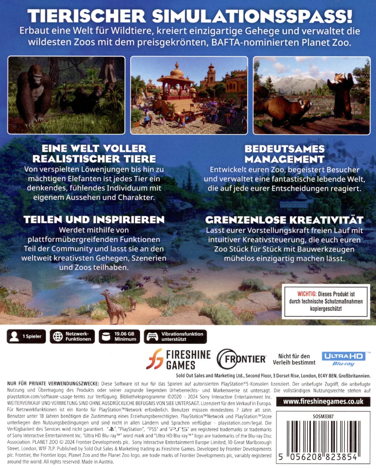 Planet Zoo: Console Edition bietet eine unglaubliche Vielfalt an authentischen Tieren, die denken, fühlen und die Welt erkunden, die ihr kreiert. Erschafft einzigartige Gehege und riesige Landschaften, trefft bedeutsame Entscheidungen und pflegt eure Tiere, während ihr die wildesten Zoos der Welt mithilfe einer intuitiven Konsolensteuerung erbaut und verwaltet. Nehmt den Controller in die Hand und spielt einen von vier packenden Spielmodi: Erlebt im weltumspannende Karriere-Modus eine Kampagne, kreiert im Franchise-Modus ein Netzwerk aus verbundenen Zoos, testet im Herausforderungs-Modus eure Fähigkeiten oder lasst im Sandbox-Modus eurer Vorstellungskraft freien Lauf.