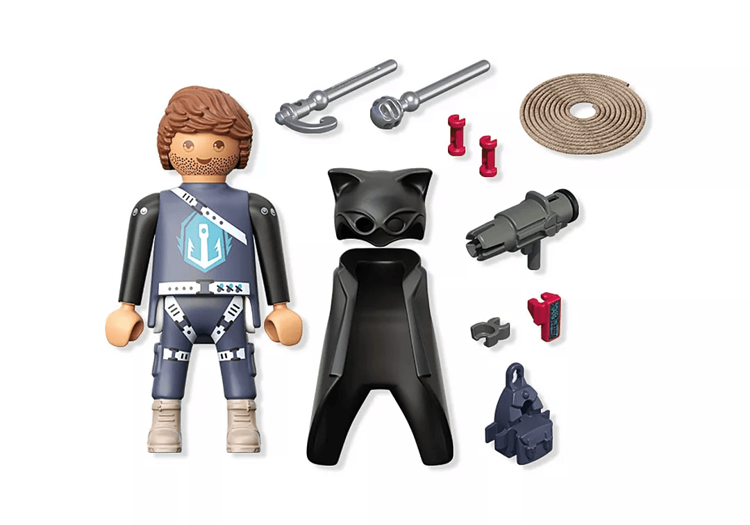 Wenn die Nacht über PLAYMOPOLIS fällt, beginnt die Mission des geheimnisvollen Schatten-Helden Silver Hook! Als einer von vier Sammelhelden der PLAYMOBIL Heroes-Serie ist er ein Meister der Tarnung und Strategie. Mit seinem tragbaren Geschütz, Enterhaken und Kugel-Geschoss trickst er Gegner aus und überwindet Hindernisse mit Leichtigkeit.