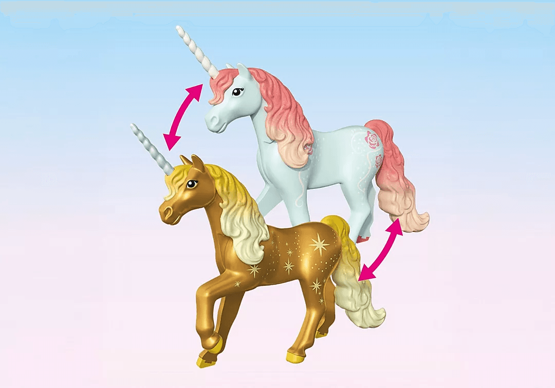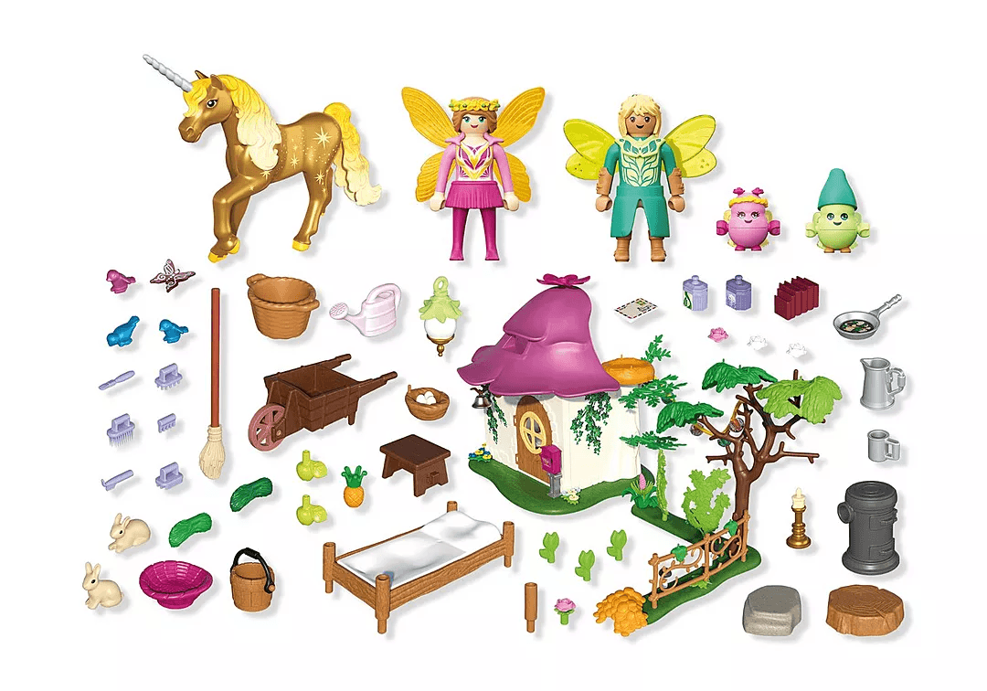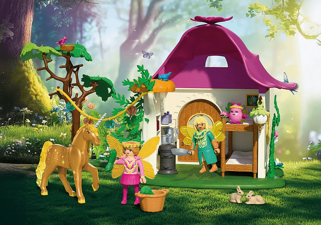 Willkommen im magischen Feenwald! Das Gemütliche Feenzuhause mit Goldeinhorn und Stall aus der Playmobil Magic Unicorns-Serie entführt Kinder ab 4 Jahren in eine fantasievolle Welt voller Zauber, Natur und Freundschaft. Das liebevoll gestaltete Feenhaus bietet mit blattförmigen Betten, schimmernden Flügeln, Mini-Briefkasten und verspieltem Pflegezubehör alles, was kleine Feenherzen höherschlagen lässt.