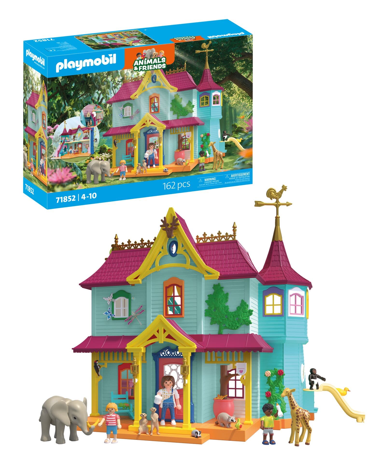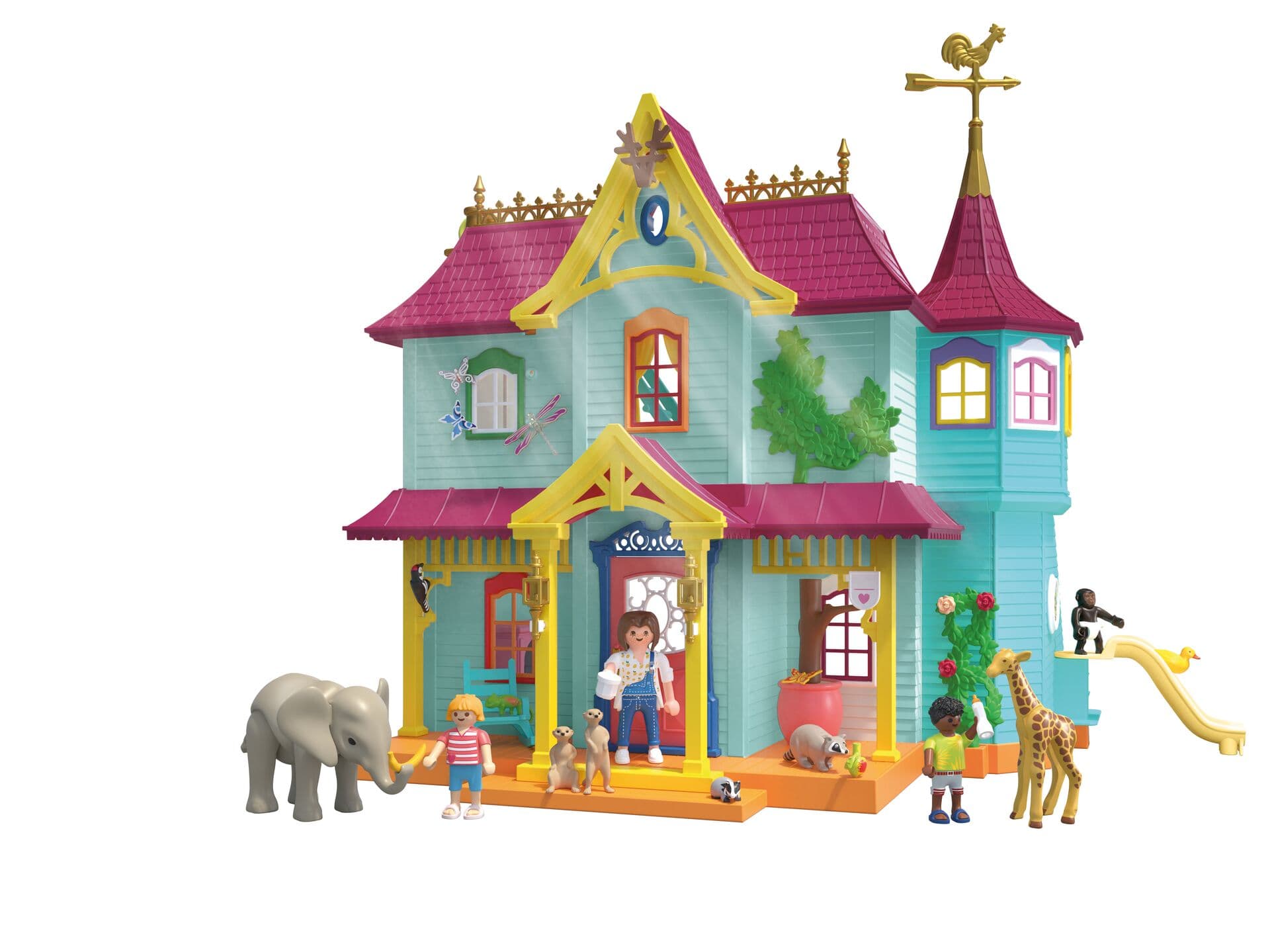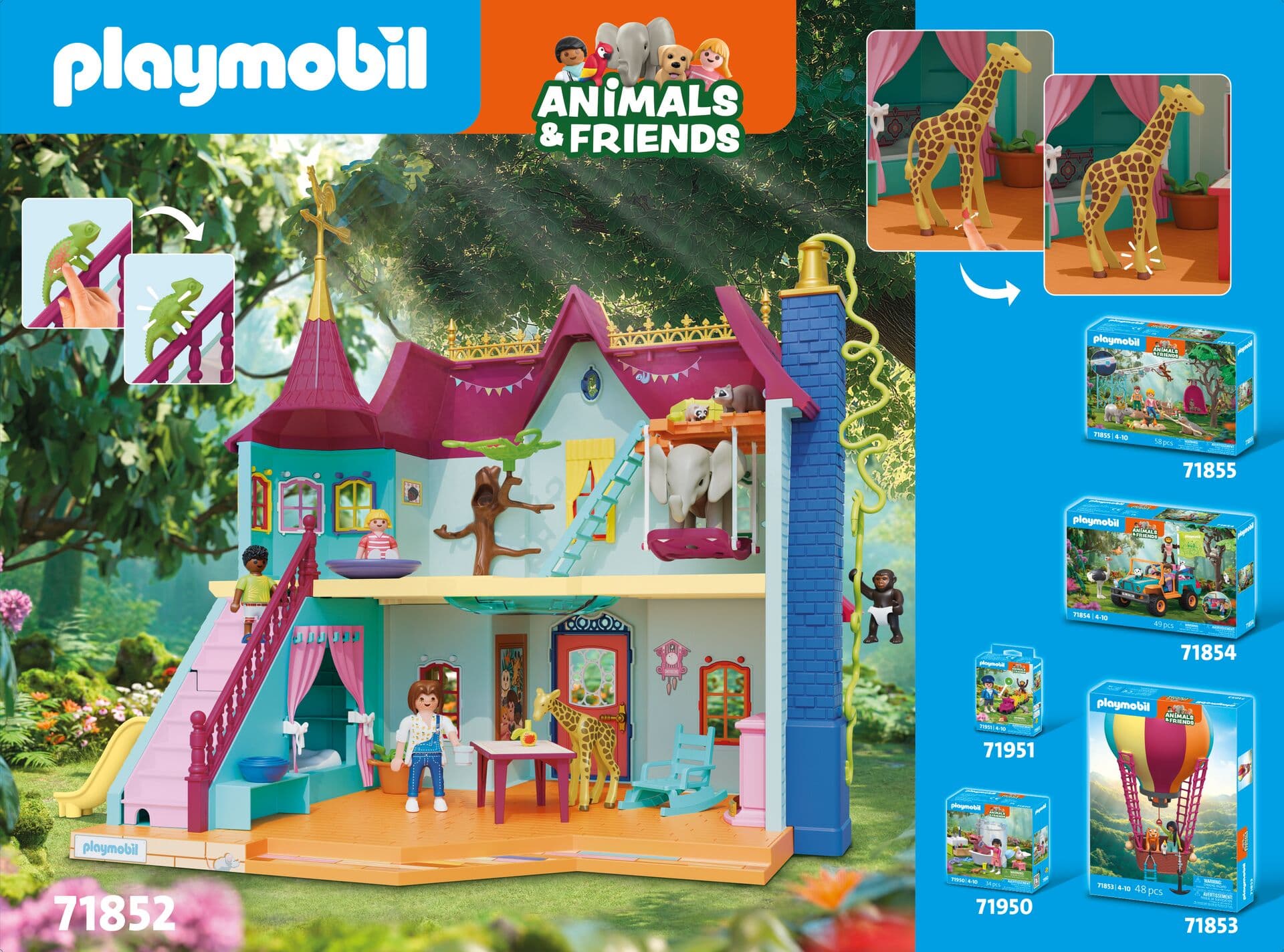 Willkommen in der bunten Animals & Friends Welt - wo das Wunderbare zum Alltag gehört und der Fantasie keine Grenzen gesetzt sind. Die kunterbunte fröhliche Villa ist der Lebensmittelpunkt der Tierfreundin mit ihren beiden Kindern und den liebevollen tierischen Mitbewohnern. Hier haben alle jede Menge Spaß und können sich immer aufeinander verlassen. Der kleine Elefant hilft fleißig beim Tischdecken, dabei mopst die Babygiraffe frech Leckereien im ganzen Haus. Die Waschbären tollen auf dem Dachboden, das Gepardenbaby liebt das Schaukeln, das Äffchen klettert und relaxt am liebsten im Baum, der von der Veranda ins Haus gewachsen ist. Suchst du die kleine Ente? Die vergnügt sich ausgiebig im Zimmerteich während die Erdmännchen ihren Lieblingsplatz im geheimen Versteck im vorderen Teil unter der imposanten Treppe gefunden haben. Der begehrteste Platz im ganzen Haus ist jedoch: die Kuschelhöhle mit Bett im hinteren Teil unter der Treppe.