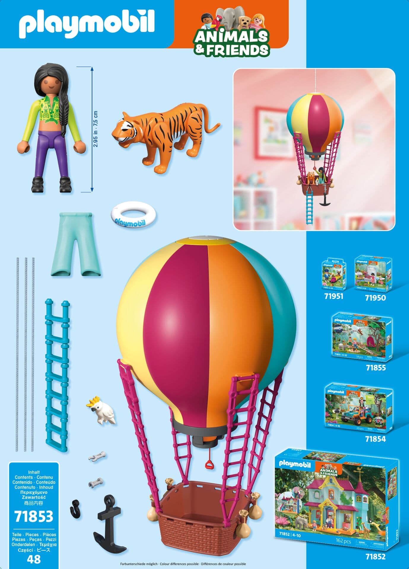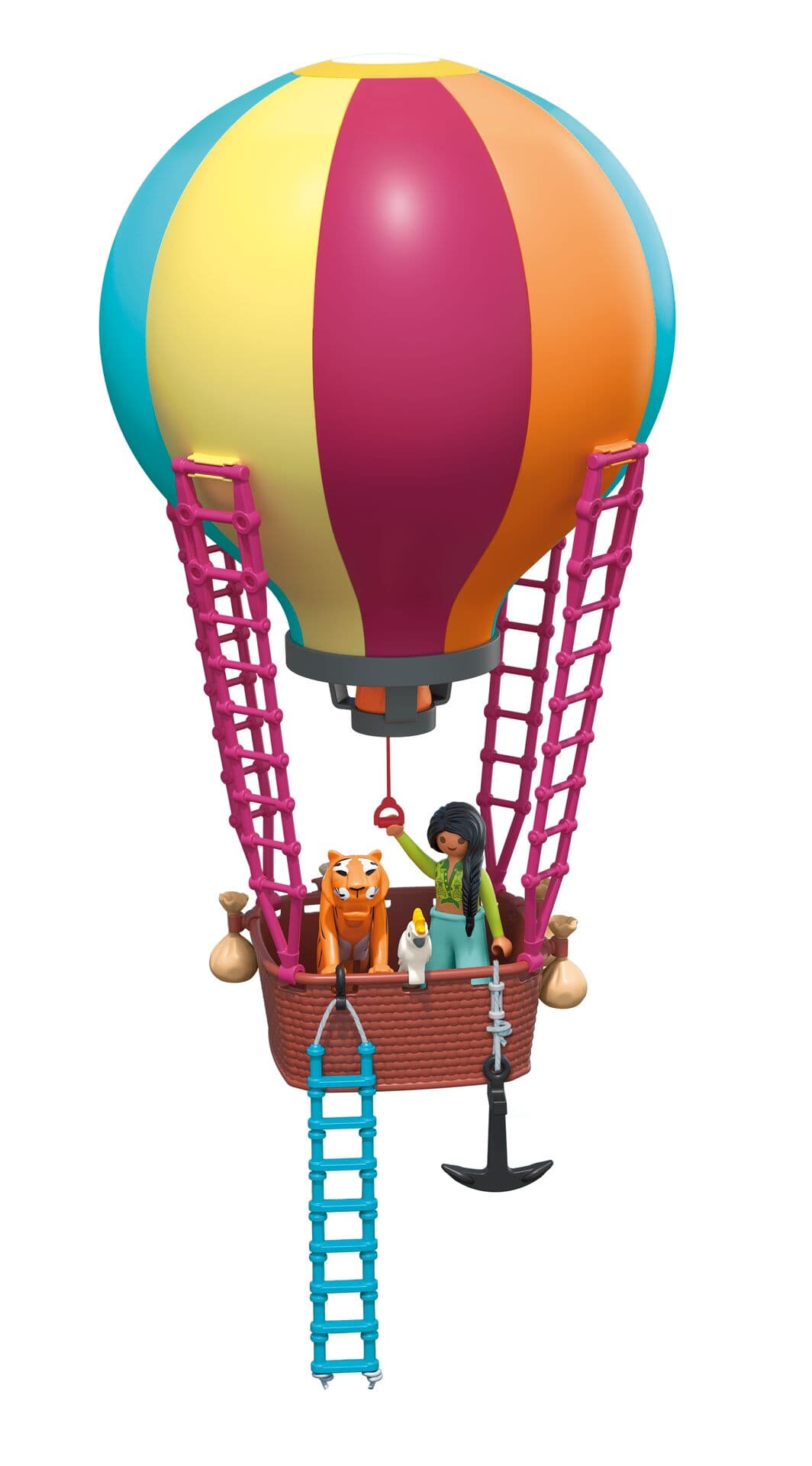 Figuren: 1 Frau Tiere: 1 Tiger, 1 Kakadu Zubehör: 1 Heißluftballon mit Korb und 4 Außenleitern, 1 Hängestrickleiter, 1 Anker an Schnur, 4 Sandsäcke
