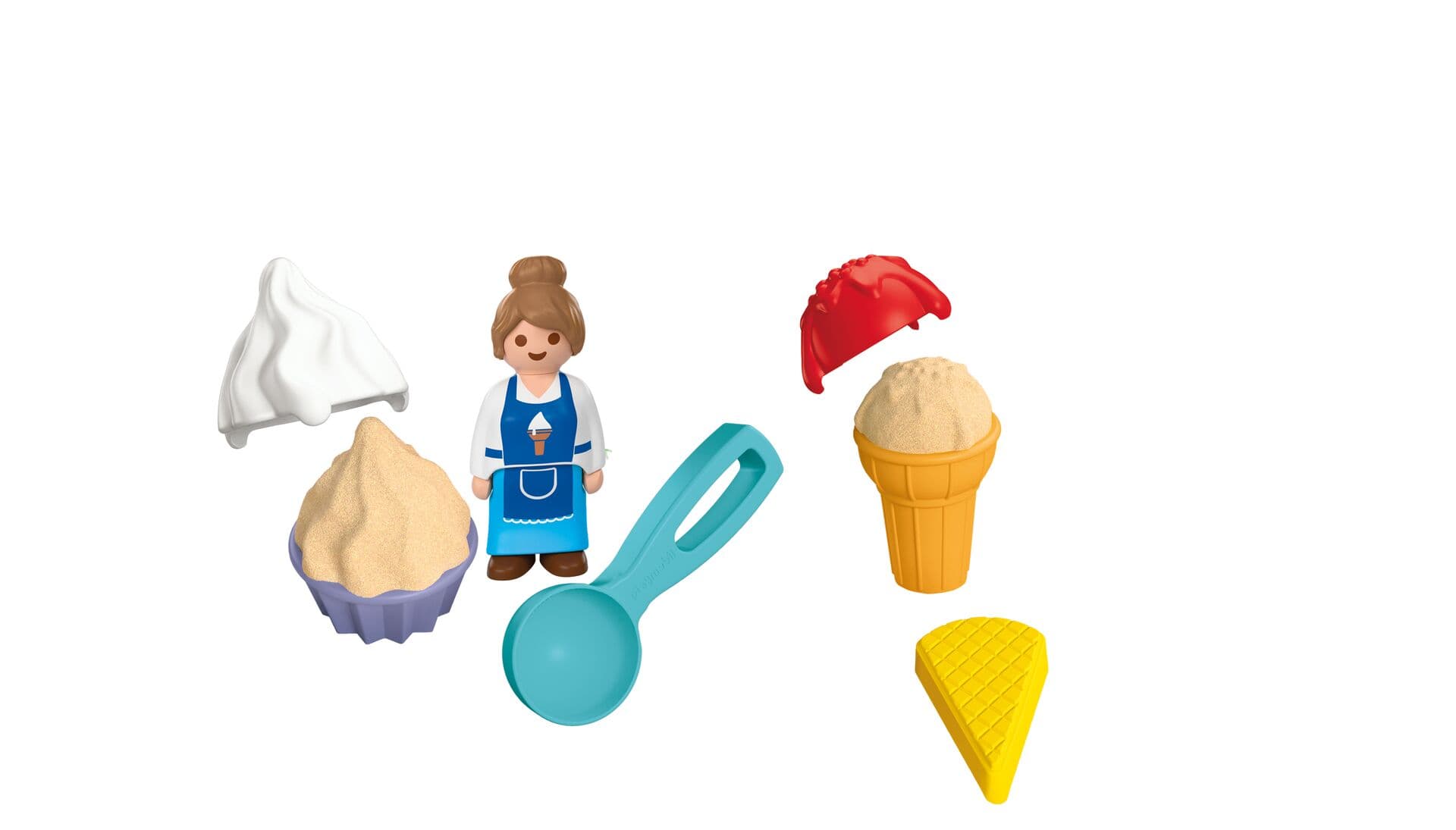 Die einzelnen Förmchen in Form von Waffeln, Becher und Toppings laden zum Nachspielen des Eisverkaufs ein. Mit dem Eisportionierer können Sandkugeln geformt und in den Waffeln oder dem Becher serviert werden. Die PLAYMOBIL JUNIOR Figur der Eisverkäuferin rundet das Spielerlebnis ab. Alle Teile sind speziell für kleine Hände gestaltet und fördern spielerisch die Feinmotorik sowie die Kreativität.