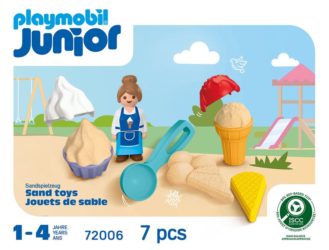 Mit der PLAYMOBIL JUNIOR Sand-Eisdiele lassen sich kreative Eiskreationen aus Sand formen und fantasievolle Rollenspiele im Sandkasten oder am Strand erleben. Das Spielset ist für Kinder von 1 bis 4 Jahren geeignet.