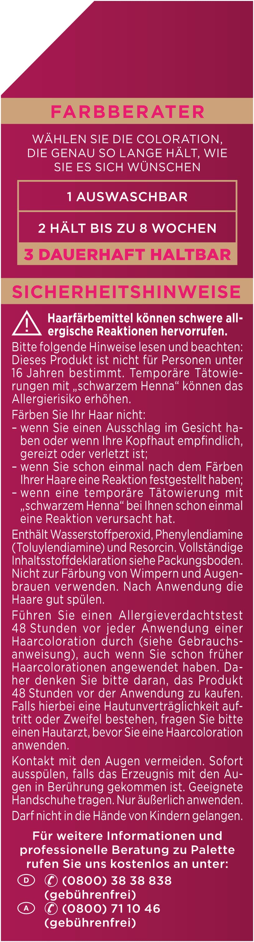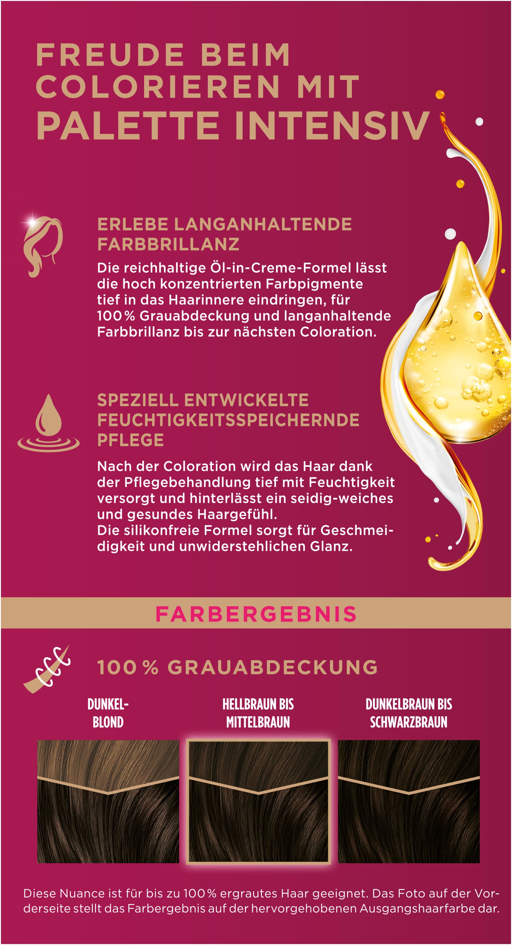 Palette Intensiv Creme Coloration – Color-Creme für leuchtende und langanhaltende FarbergebnisseDie Palette Intensiv Creme Coloration sorgt für leuchtende, langanhaltende Farbergebnisse, intensiven Farbglanz sowie perfekte Grauabdeckung. Die Color-Creme mit reichhaltiger Öl-in-Creme-Formel lässt die hoch konzentrierten Farbpigmente tief in das Haarinnere eindringen, für 100 % Grauabdeckung und eine langanhaltende Farbbrillanz bis zur nächsten Coloration.Zusätzlich ist die speziell entwickelte, feuchtigkeitsspendende Pflege der Haarfarbe silikonfrei und sorgt für Geschmeidigkeit und unwiderstehlichen Glanz. Das Haar wird dank der Pflegebehandlung tief mit Feuchtigkeit versorgt und hinterlässt ein seidig-weiches und gesundes Haargefühl.Die Produktvorteile im Detail:Leuchtende, langanhaltende FarbeAusdrucksstarkes Farbergebnis bis zur nächsten Coloration100 % GrauabdeckungFeuchtigkeitsspeichernde Pflege für Geschmeidigkeit&GlanzAnwendung:1. Den Inhalt der Palette Color-Creme in die Applikatorflasche mit Entwicklerlotion geben und gut mischen.2. Trage die Mischung mit der Applikatorflasche auf das trockene Haar auf und lasse das Produkt 30 Minuten einwirken (für die Farbtöne 11-11, 10-91, 10-1, 10-0: 35-45 Minuten)3. Mit lauwarmem Wasser gut ausspülen, bis das Wasser klar ist. Anschließend die in der Packung enthaltene Pflegebehandlung verwenden.