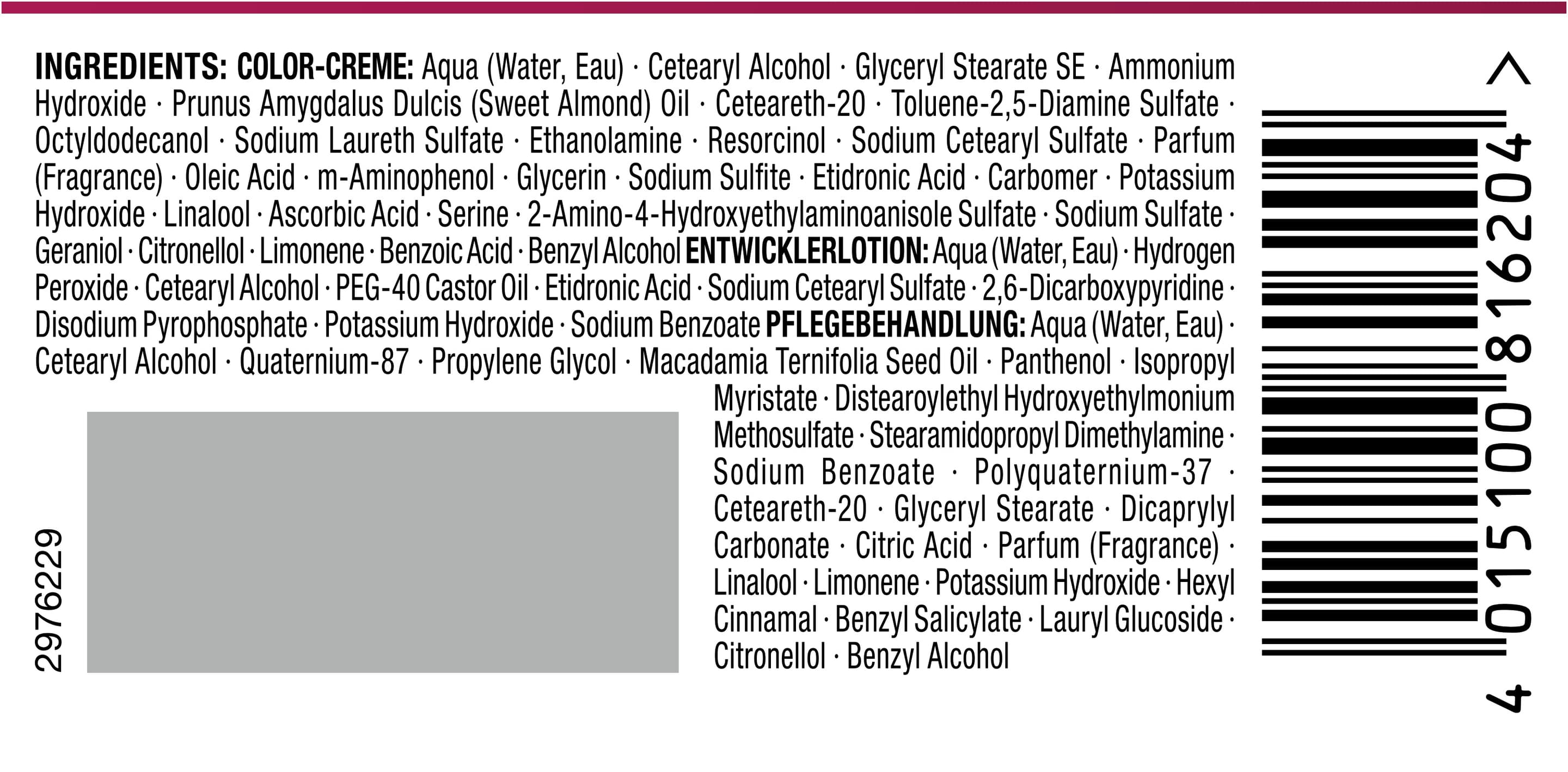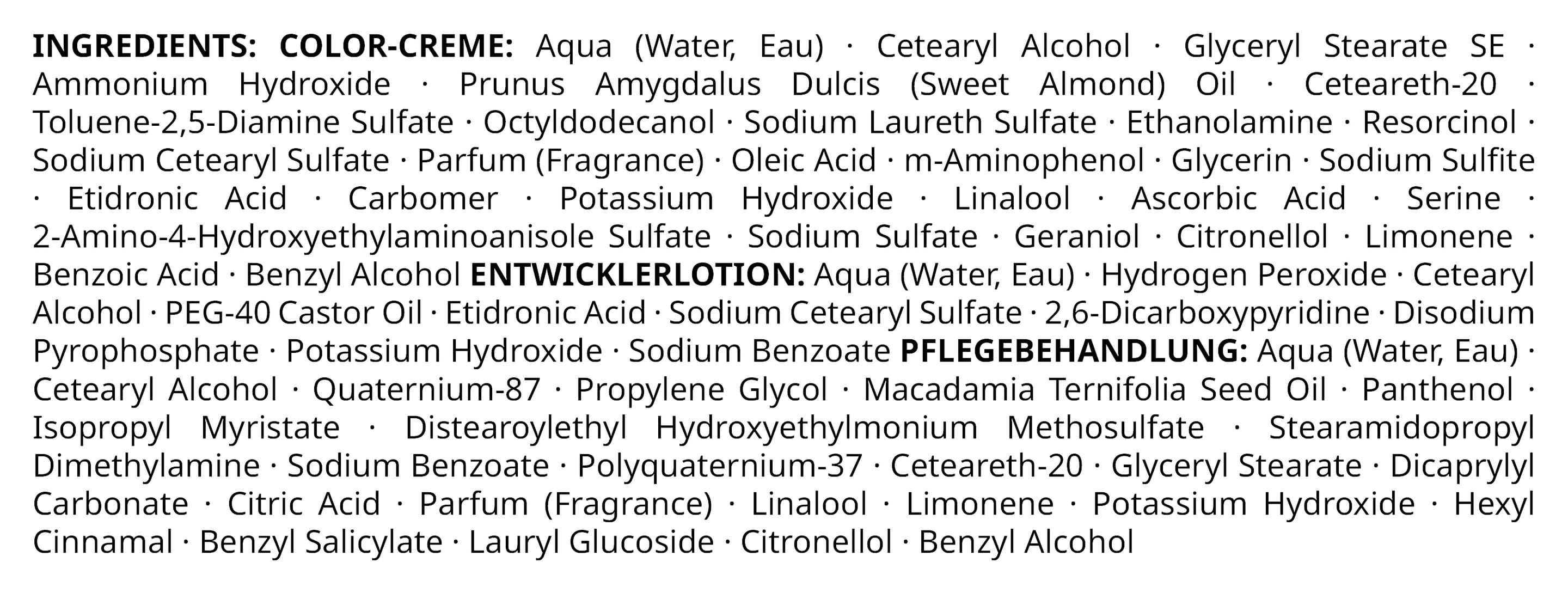 | Inhaltsstoffe | Color-Creme: Aqua (Water, Eau), Cetearyl Alcohol, Glyceryl Stearate SE, Ammonium Hydroxide, Prunus Amygdalus Dulcis (Sweet Almond) Oil, Ceteareth-20, Toluene-2,5-Diamine Sulfate, Octyldodecanol, Sodium Laureth Sulfate, Ethanolamine, Resorcinol, Sodium Cetearyl Sulfate, Parfum (Fragrance), Oleic Acid, m-Aminophenol, Glycerin, Sodium Sulfite, Etidronic Acid, Carbomer, Potassium Hydroxide, Linalool, Ascorbic Acid, Serine, 2-Amino-4-Hydroxyethylaminoanisole Sulfate, Sodium Sulfate, Geraniol, Citronellol, Limonene, Benzoic Acid, Benzyl Alcohol|Entwicklerlotion: Aqua (Water, Eau), Hydrogen Peroxide, Cetearyl Alcohol, PEG-40 Castor Oil, Etidronic Acid, Sodium Cetearyl Sulfate, 2,6-Dicarboxypyridine, Disodium Pyrophosphate, Potassium Hydroxide, Sodium Benzoate|Pflegebehandlung: Aqua (Water, Eau), Cetearyl Alcohol, Quaternium-87, Propylene Glycol, Macadamia Ternifolia Seed Oil, Panthenol, Isopropyl Myristate, Distearoylethyl Hydroxyethylmonium Methosulfate, Stearamidopropyl Dimethylamine, Sodi |
