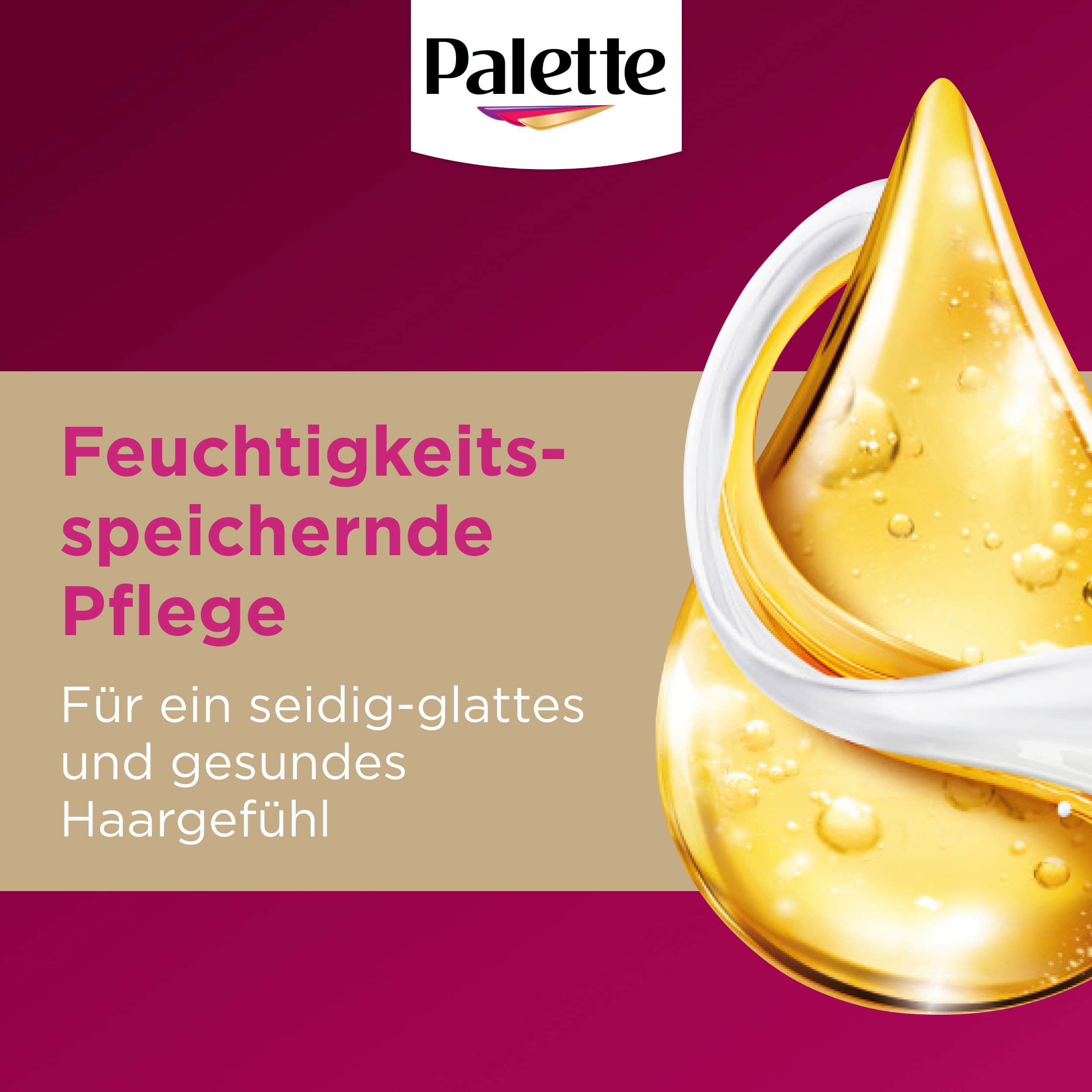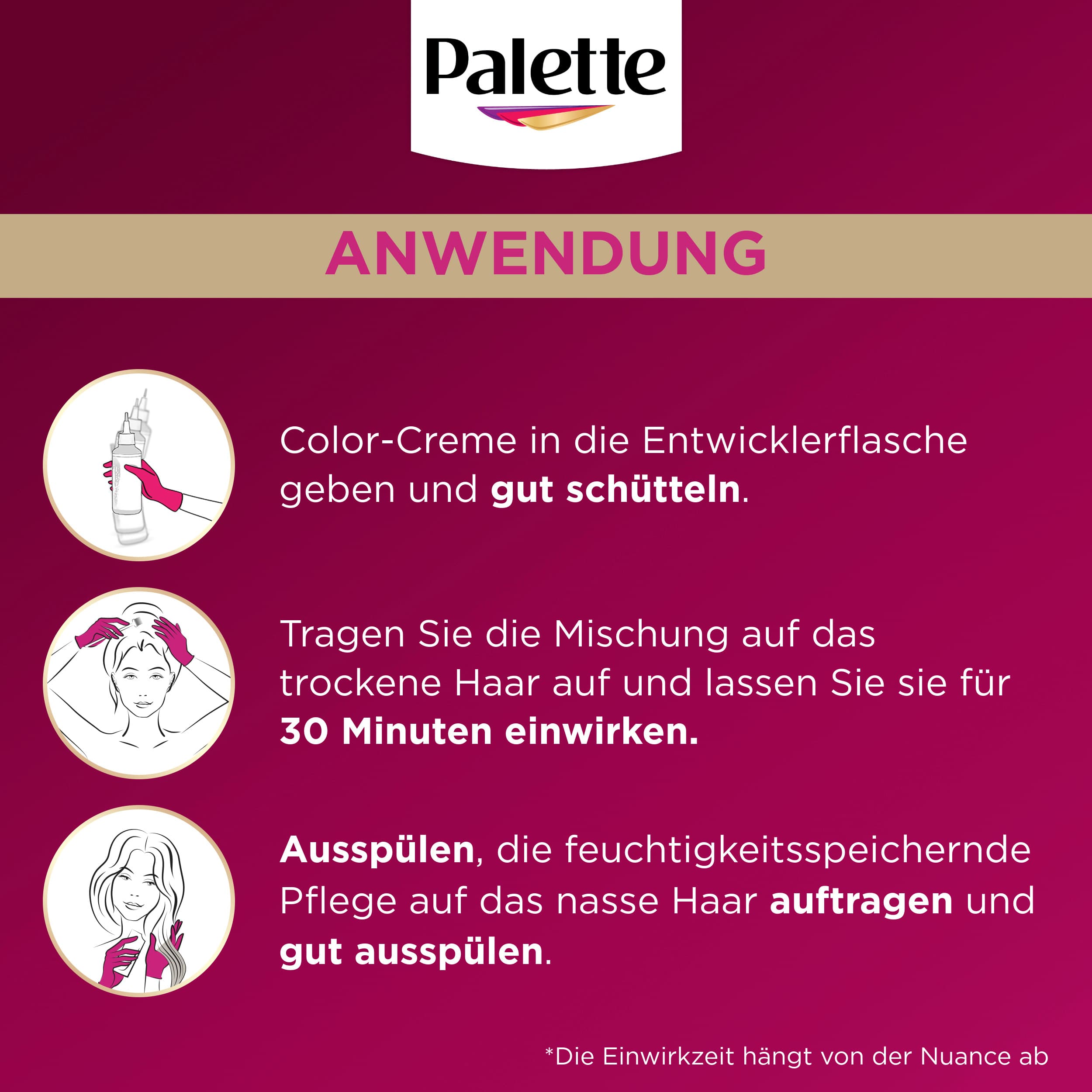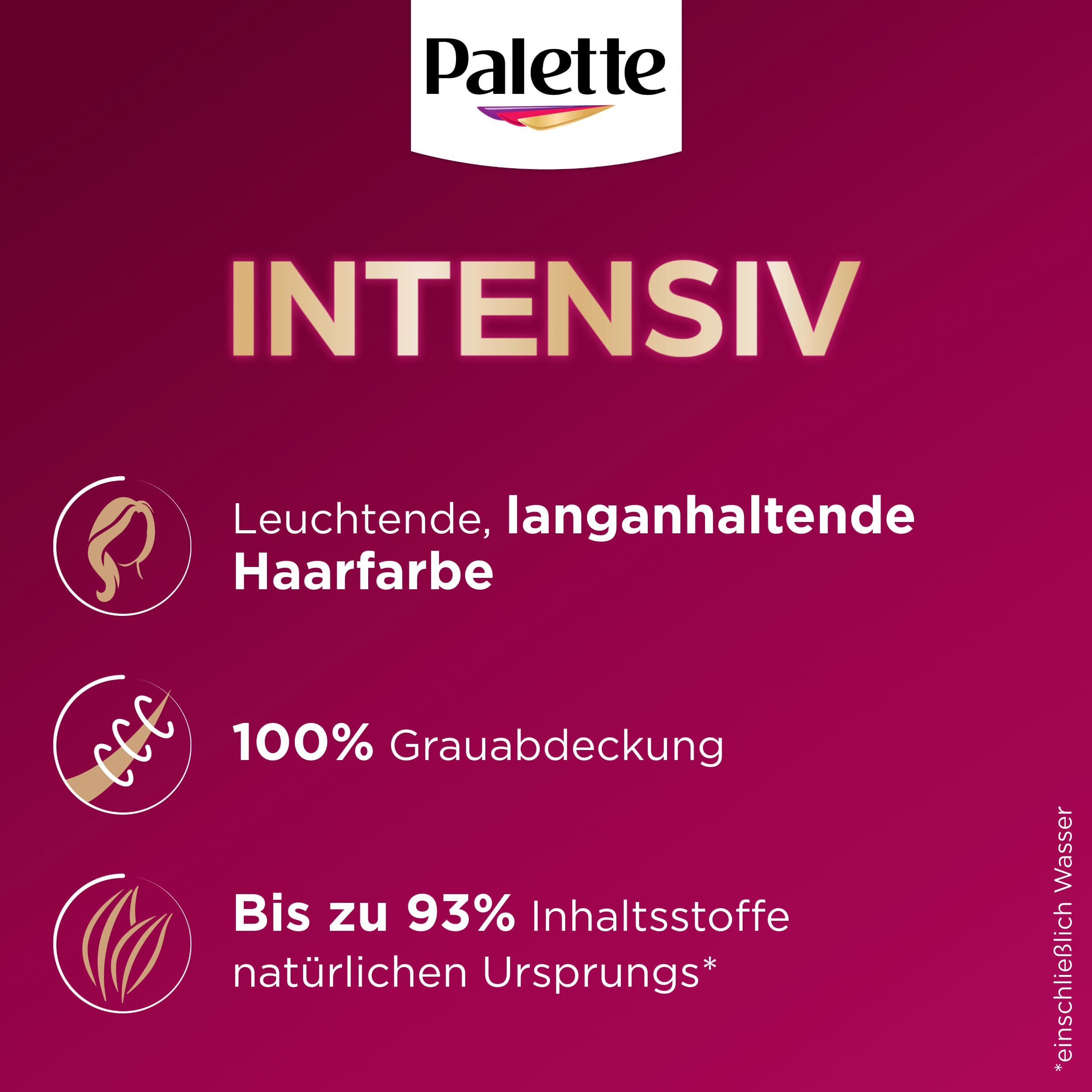Palette Intensiv Creme Coloration – Color-Creme für leuchtende und langanhaltende FarbergebnisseDie Palette Intensiv Creme Coloration sorgt für leuchtende, langanhaltende Farbergebnisse, intensiven Farbglanz sowie perfekte Grauabdeckung. Die Color-Creme mit reichhaltiger Öl-in-Creme-Formel lässt die hoch konzentrierten Farbpigmente tief in das Haarinnere eindringen, für 100 % Grauabdeckung und eine langanhaltende Farbbrillanz bis zur nächsten Coloration.Zusätzlich ist die speziell entwickelte, feuchtigkeitsspendende Pflege der Haarfarbe silikonfrei und sorgt für Geschmeidigkeit und unwiderstehlichen Glanz. Das Haar wird dank der Pflegebehandlung tief mit Feuchtigkeit versorgt und hinterlässt ein seidig-weiches und gesundes Haargefühl.Die Produktvorteile im Detail:Leuchtende, langanhaltende FarbeAusdrucksstarkes Farbergebnis bis zur nächsten Coloration100 % GrauabdeckungFeuchtigkeitsspeichernde Pflege für Geschmeidigkeit&GlanzAnwendung:1. Den Inhalt der Palette Color-Creme in die Applikatorflasche mit Entwicklerlotion geben und gut mischen.2. Trage die Mischung mit der Applikatorflasche auf das trockene Haar auf und lasse das Produkt 30 Minuten einwirken (für die Farbtöne 11-11, 10-91, 10-1, 10-0: 35-45 Minuten)3. Mit lauwarmem Wasser gut ausspülen, bis das Wasser klar ist. Anschließend die in der Packung enthaltene Pflegebehandlung verwenden.