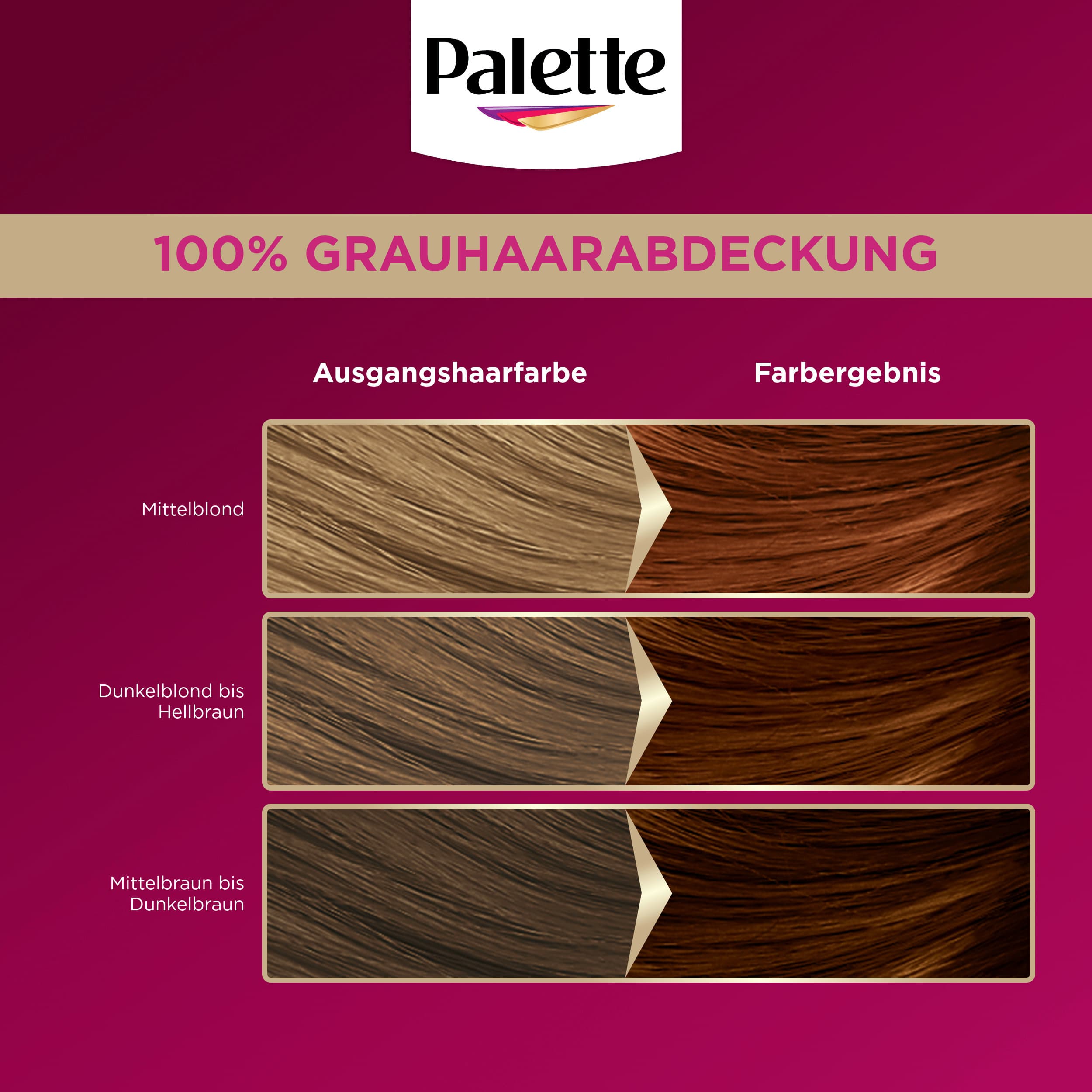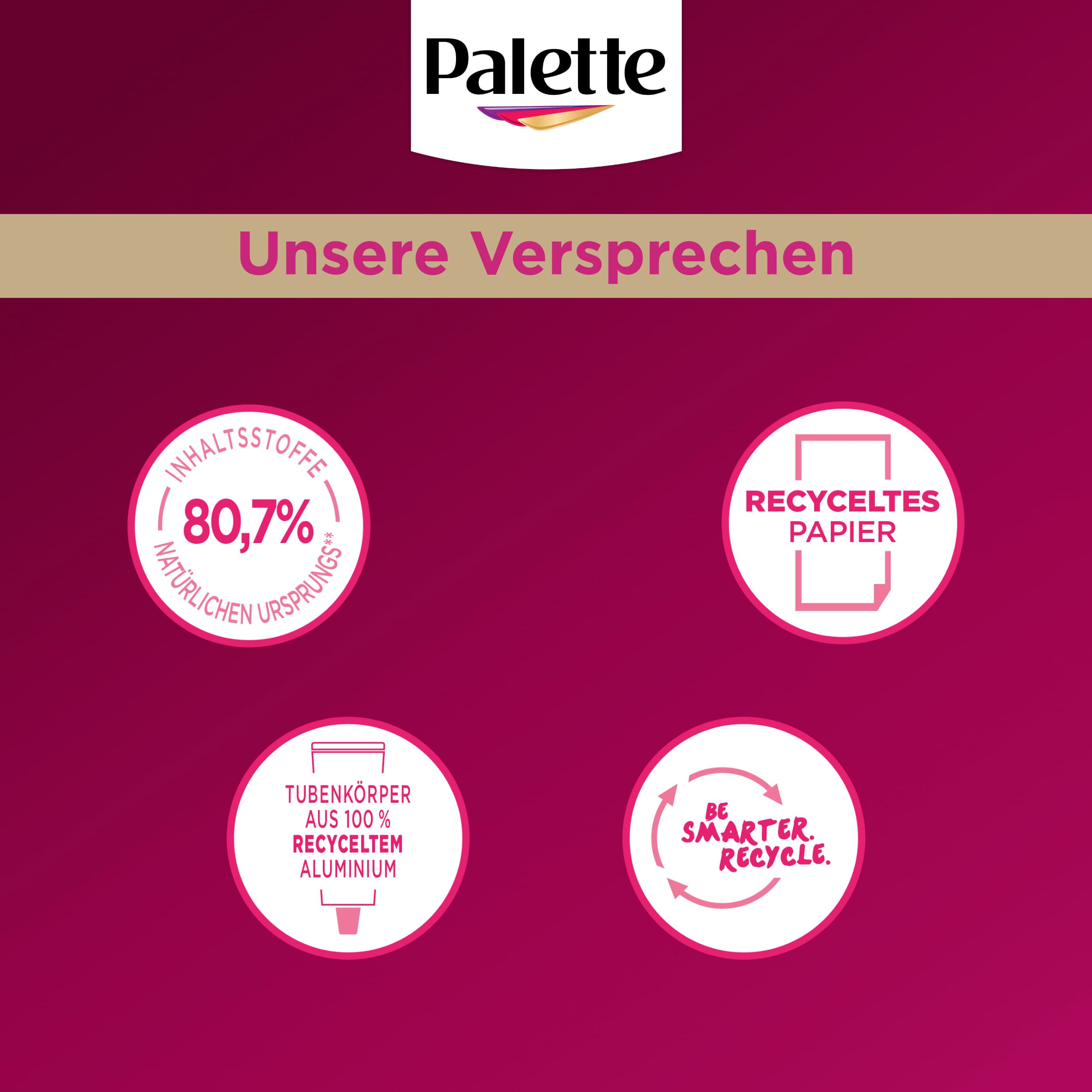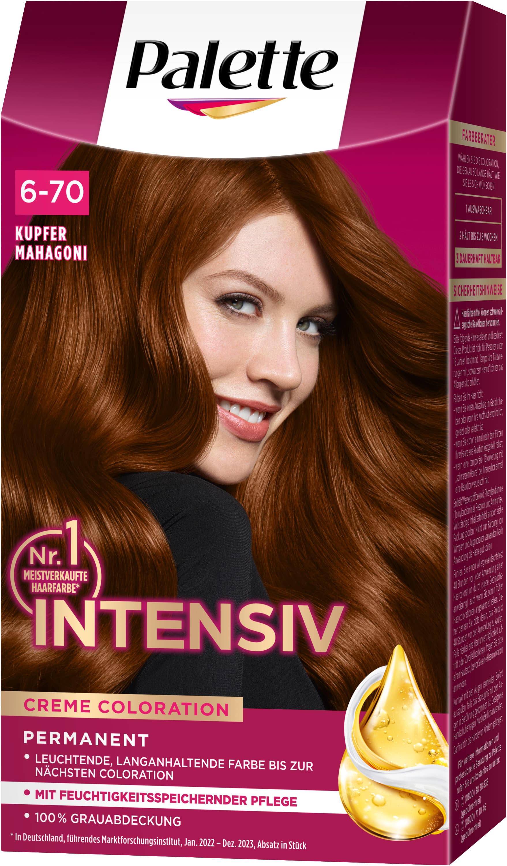 Palette Intensiv Creme Coloration – Color-Creme für leuchtende und langanhaltende FarbergebnisseDie Palette Intensiv Creme Coloration sorgt für leuchtende, langanhaltende Farbergebnisse, intensiven Farbglanz sowie perfekte Grauabdeckung. Die Color-Creme mit reichhaltiger Öl-in-Creme-Formel lässt die hoch konzentrierten Farbpigmente tief in das Haarinnere eindringen, für 100 % Grauabdeckung und eine langanhaltende Farbbrillanz bis zur nächsten Coloration.Zusätzlich ist die speziell entwickelte, feuchtigkeitsspendende Pflege der Haarfarbe silikonfrei und sorgt für Geschmeidigkeit und unwiderstehlichen Glanz. Das Haar wird dank der Pflegebehandlung tief mit Feuchtigkeit versorgt und hinterlässt ein seidig-weiches und gesundes Haargefühl.Die Produktvorteile im Detail:Leuchtende, langanhaltende FarbeAusdrucksstarkes Farbergebnis bis zur nächsten Coloration100 % GrauabdeckungFeuchtigkeitsspeichernde Pflege für Geschmeidigkeit&GlanzAnwendung:1. Den Inhalt der Palette Color-Creme in die Applikatorflasche mit Entwicklerlotion geben und gut mischen.2. Trage die Mischung mit der Applikatorflasche auf das trockene Haar auf und lasse das Produkt 30 Minuten einwirken (für die Farbtöne 11-11, 10-91, 10-1, 10-0: 35-45 Minuten)3. Mit lauwarmem Wasser gut ausspülen, bis das Wasser klar ist. Anschließend die in der Packung enthaltene Pflegebehandlung verwenden.