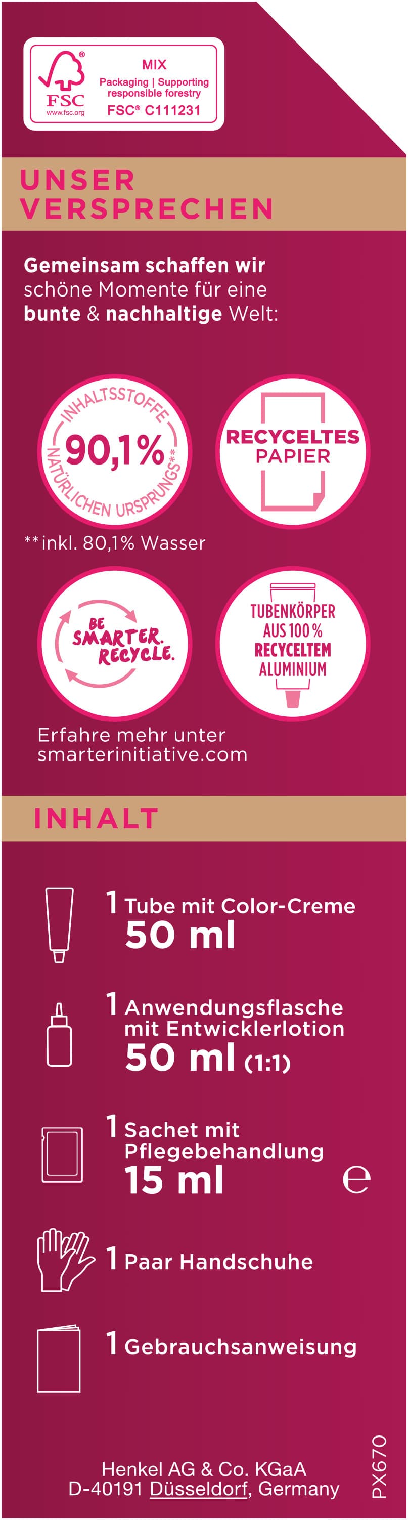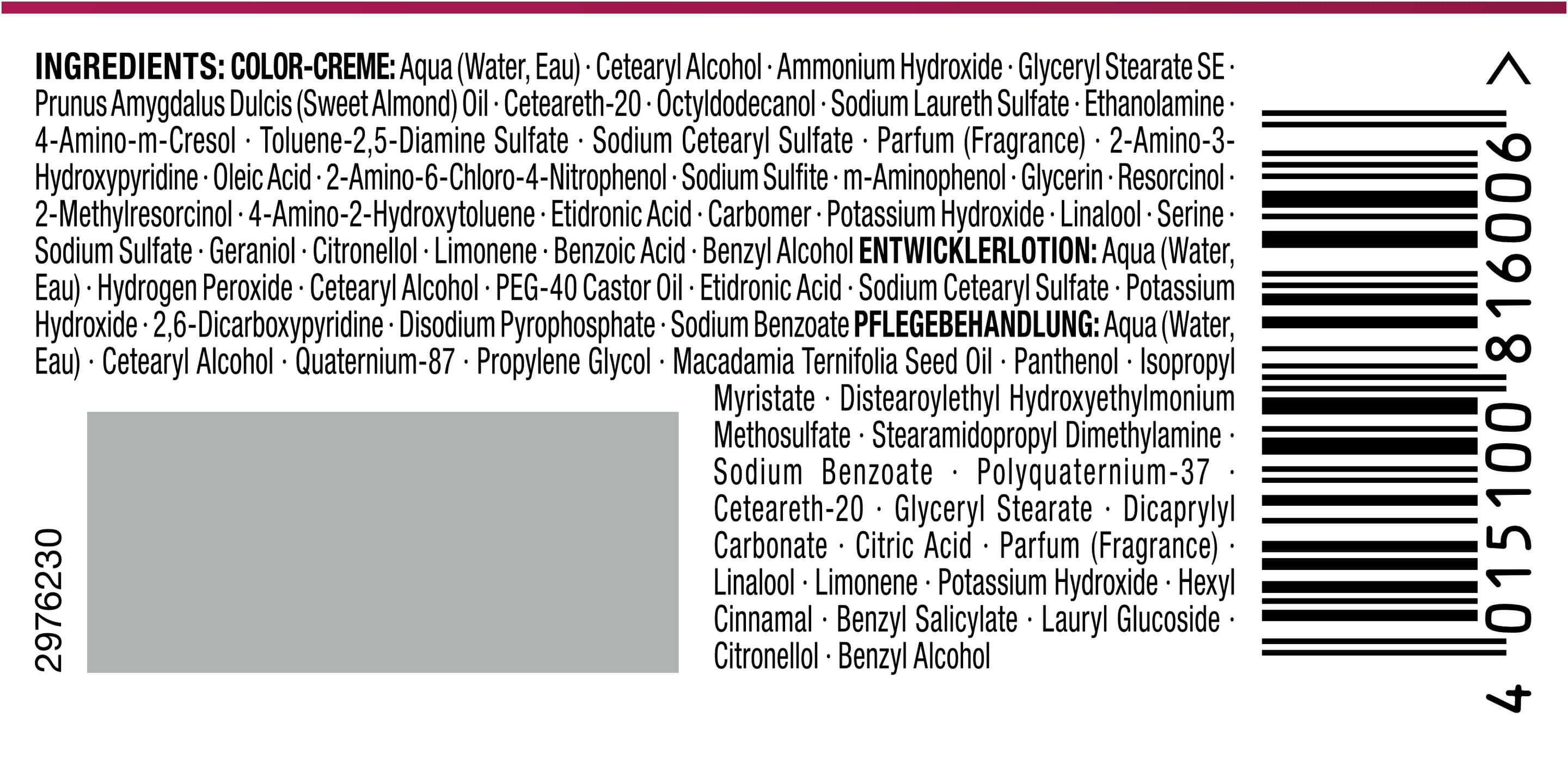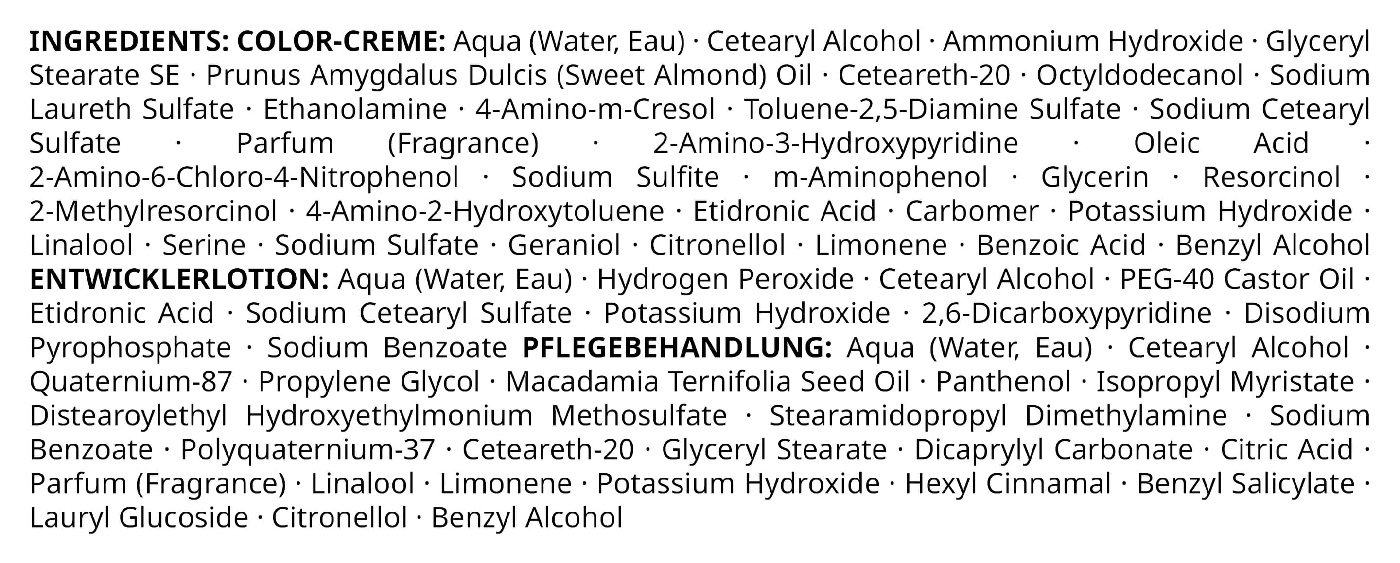 | Inhaltsstoffe | Color-Creme: Aqua (Water, Eau), Cetearyl Alcohol, Ammonium Hydroxide, Glyceryl Stearate SE, Prunus Amygdalus Dulcis (Sweet Almond) Oil, Ceteareth-20, Octyldodecanol, Sodium Laureth Sulfate, Ethanolamine, 4-Amino-m-Cresol, Toluene-2,5-Diamine Sulfate, Sodium Cetearyl Sulfate, Parfum (Fragrance), 2-Amino-3-Hydroxypyridine, Oleic Acid, 2-Amino-6-Chloro-4-Nitrophenol, Sodium Sulfite, m-Aminophenol, Glycerin, Resorcinol, 2-Methylresorcinol, 4-Amino-2-Hydroxytoluene, Etidronic Acid, Carbomer, Potassium Hydroxide, Linalool, Serine, Sodium Sulfate, Geraniol, Citronellol, Limonene, Benzoic Acid, Benzyl Alcohol|Entwicklerlotion: Aqua (Water, Eau), Hydrogen Peroxide, Cetearyl Alcohol, PEG-40 Castor Oil, Etidronic Acid, Sodium Cetearyl Sulfate, Potassium Hydroxide, 2,6-Dicarboxypyridine, Disodium Pyrophosphate, Sodium Benzoate|Pflegebehandlung: Aqua (Water, Eau), Cetearyl Alcohol, Quaternium-87, Propylene Glycol, Macadamia Ternifolia Seed Oil, Panthenol, Isopropyl Myristate, Distearoylethyl Hydro |