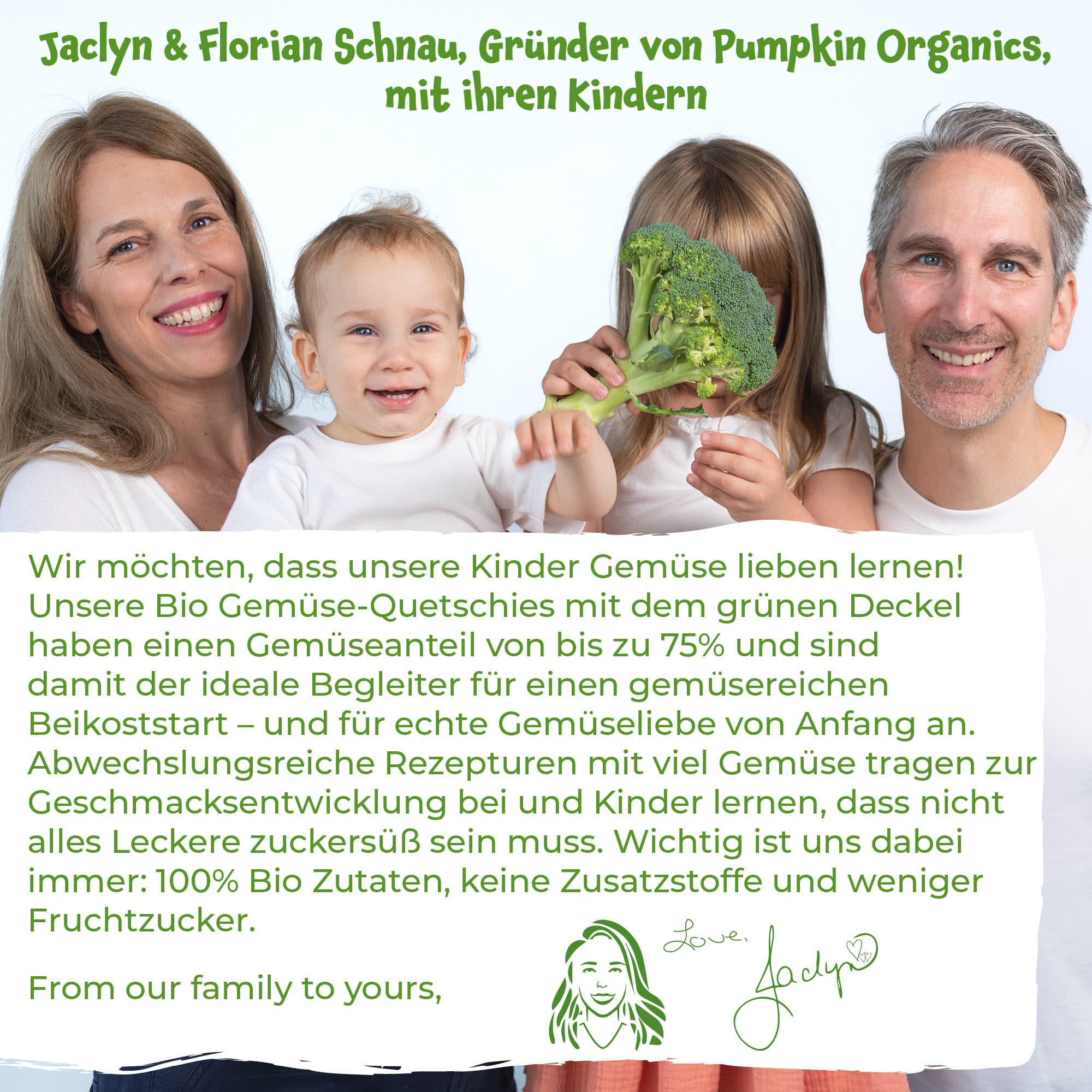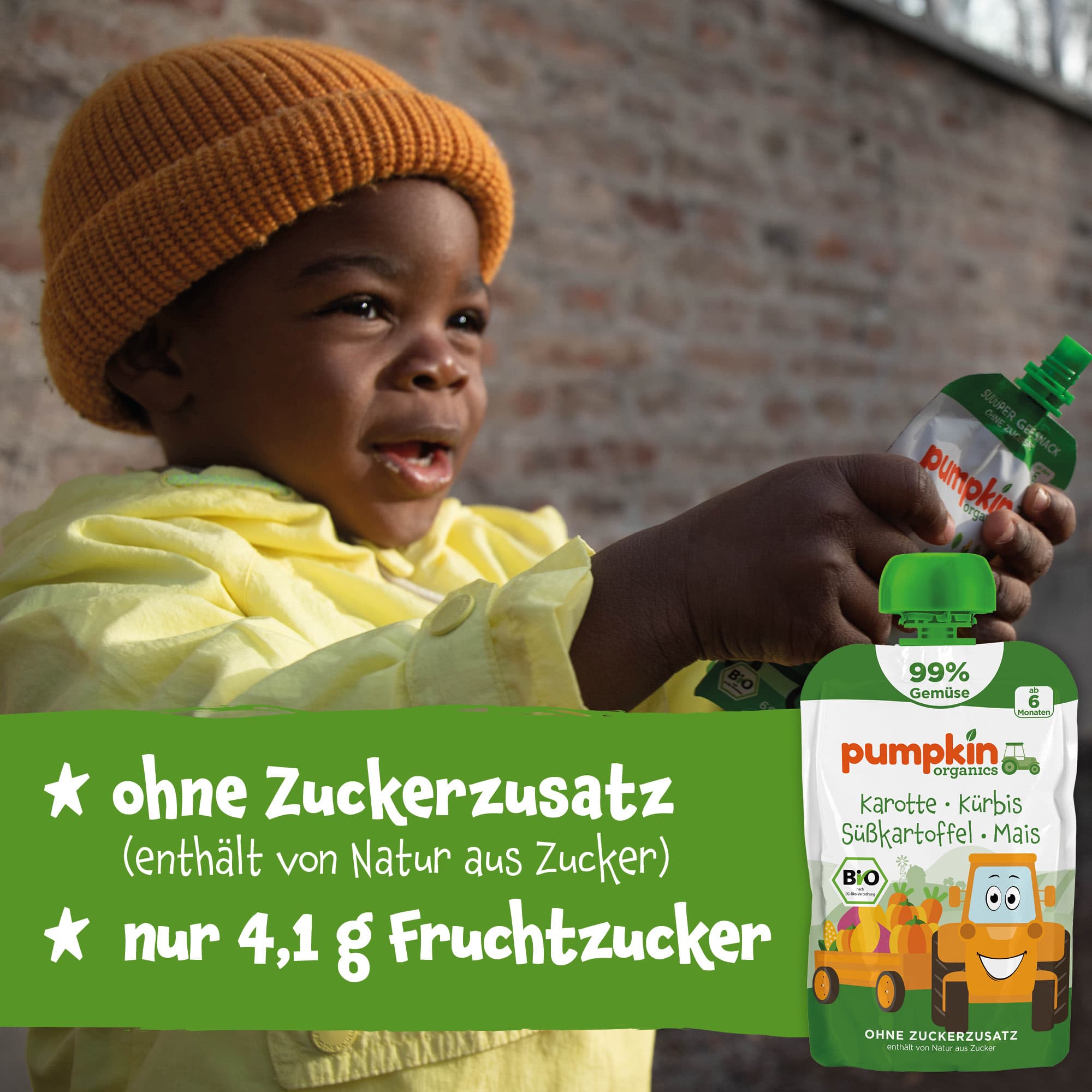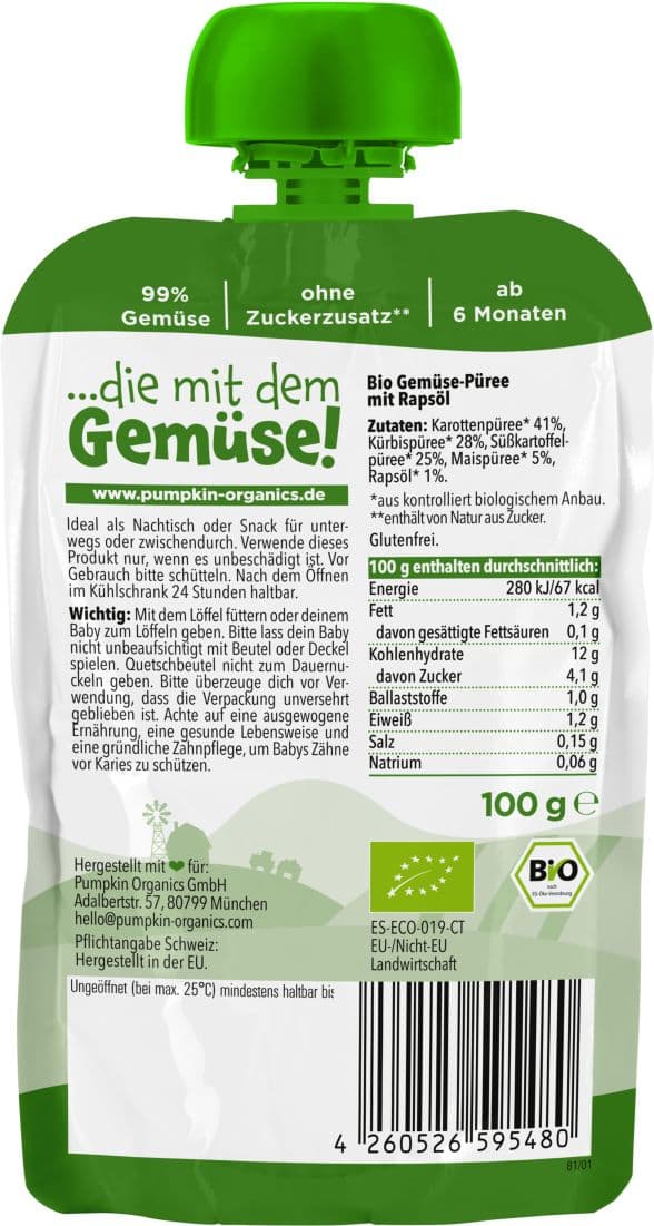 Der Pumpkin Organics Quetschbeutel mit Karotte, Kürbis, Süßkartoffel und Mais besteht zu 99% aus Gemüse und 1% Rapsöl und ist damit einzigartig auf dem Markt. Durch den extra hohen Gemüseanteil enthält der Quetschie weniger Fruchtzucker als marktübliche Quetschies. Der Gemüse-Quetschie ist die perfekte Wahl für Eltern, die ihren Kleinen ab 6 Monaten eine gemüsereiche und fruchtzuckerarme Ernährung aus 100% Bio Zutaten bieten und eine frühe Gemüseliebe wecken möchten. Karotte, Kürbis, Süßkartoffel und Mais sorgen für Gemüse-Power und dennoch schmeckt der Quetschie gleichzeitig leicht süßlich. Der Quetschie enthält keinen Zuckerzusatz (enthält von Natur aus Zucker) oder Zusatzstoffe, eignet sich hervorragend zum Beikoststart und als Zwischenmahlzeit für unterwegs. Die leicht dickflüssige Textur des Quetschies signalisiert dem Gehirn der Kleinen, dass sie gerade essen und nicht trinken. Perfekt für eine extra Portion Gemüse auf dem Spielplatz, in der Wickeltasche oder auf Reisen.