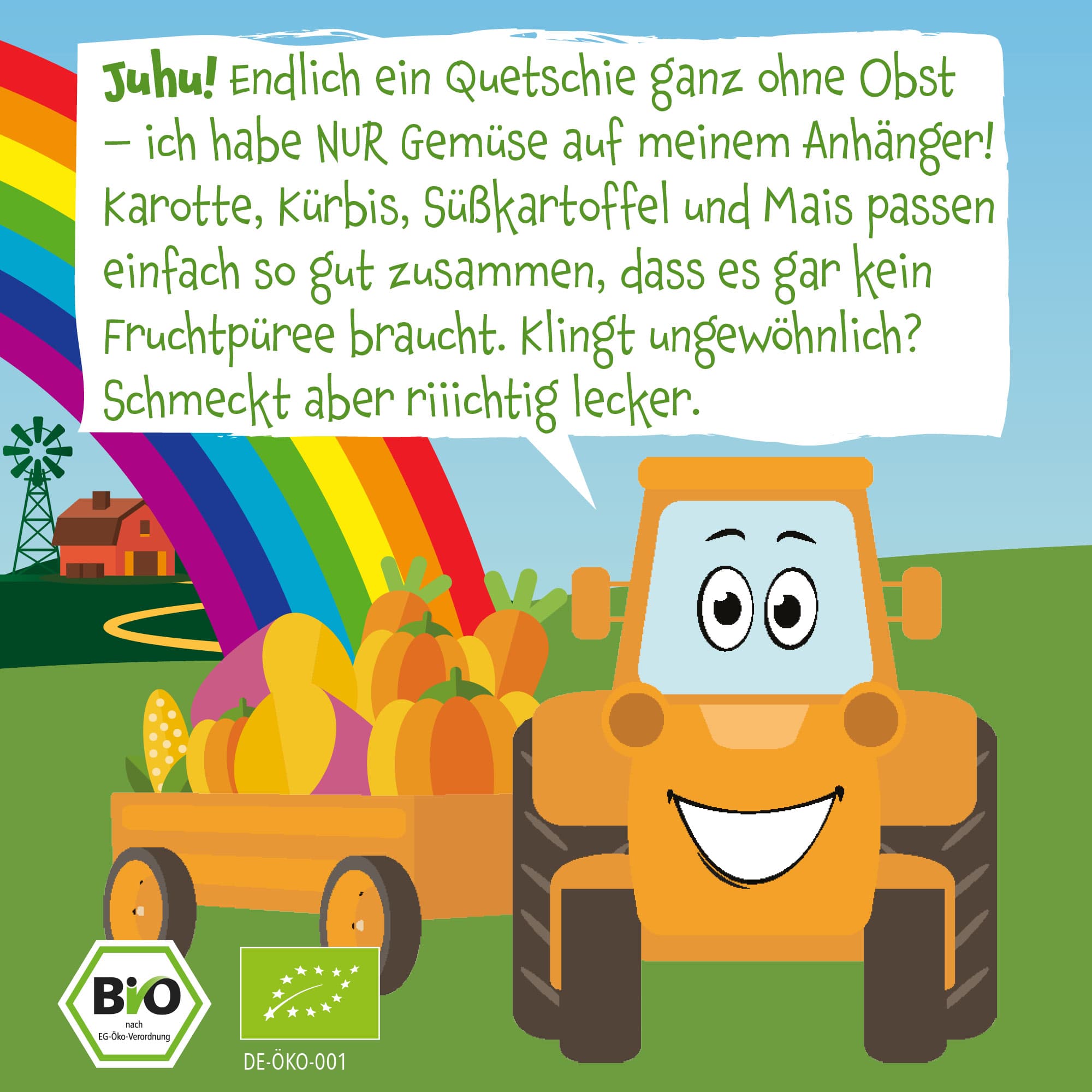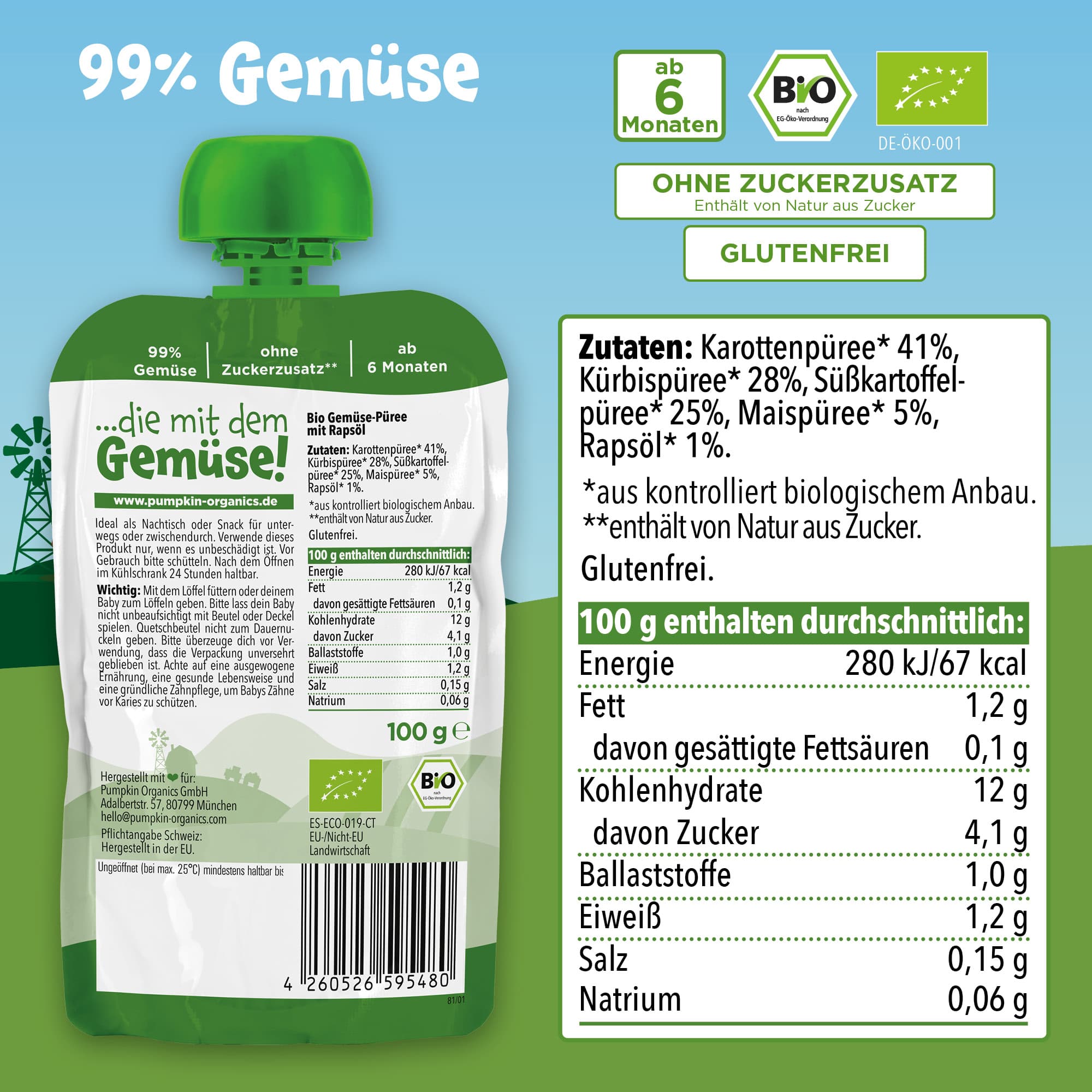 ZutatenKarottenpüree* 41%, Kürbispüree* 28%, Süßkartoffelpüree* 25%, Maispüree* 5%, Rapsöl* 1%. *aus kontrolliert biologischem Anbau. **enthält von Natur aus Zucker.