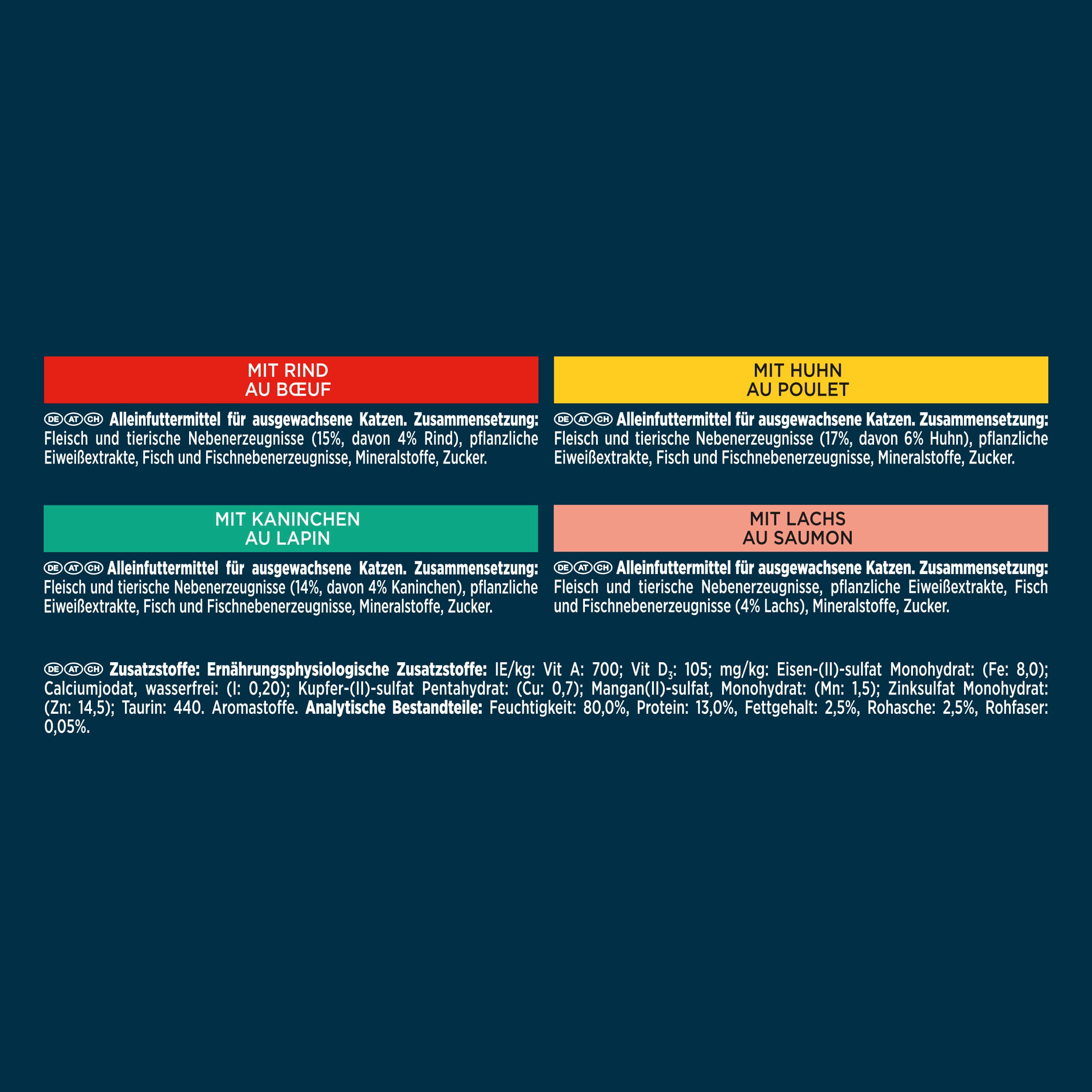 | Zusammensetzung (Futter) | Zusammensetzung: Mit Rind: Fleisch und tierische Nebenerzeugnisse (davon 4% Rind), pflanzliche Eiweißextrakte, Fisch und Fischnebenerzeugnisse, Mineralstoffe, Zucker. Mit Kaninchen: Fleisch und tierische Nebenerzeugnisse (davon 4% Kaninchen), pflanzliche Eiweißextrakte, Fisch und Fischnebenerzeugnisse, Mineralstoffe, Zucker. Mit Lachs: Fleisch und tierische Nebenerzeugnisse, pflanzliche Eiweißextrakte, Fisch und Fischnebenerzeugnisse (davon 4% Lachs), Mineralstoffe, Zucker. Mit Huhn: Fleisch und tierische Nebenerzeugnisse (davon 4% Huhn), pflanzliche Eiweißextrakte, Fisch und Fischnebenerzeugnisse, Mineralstoffe, Zucker. |