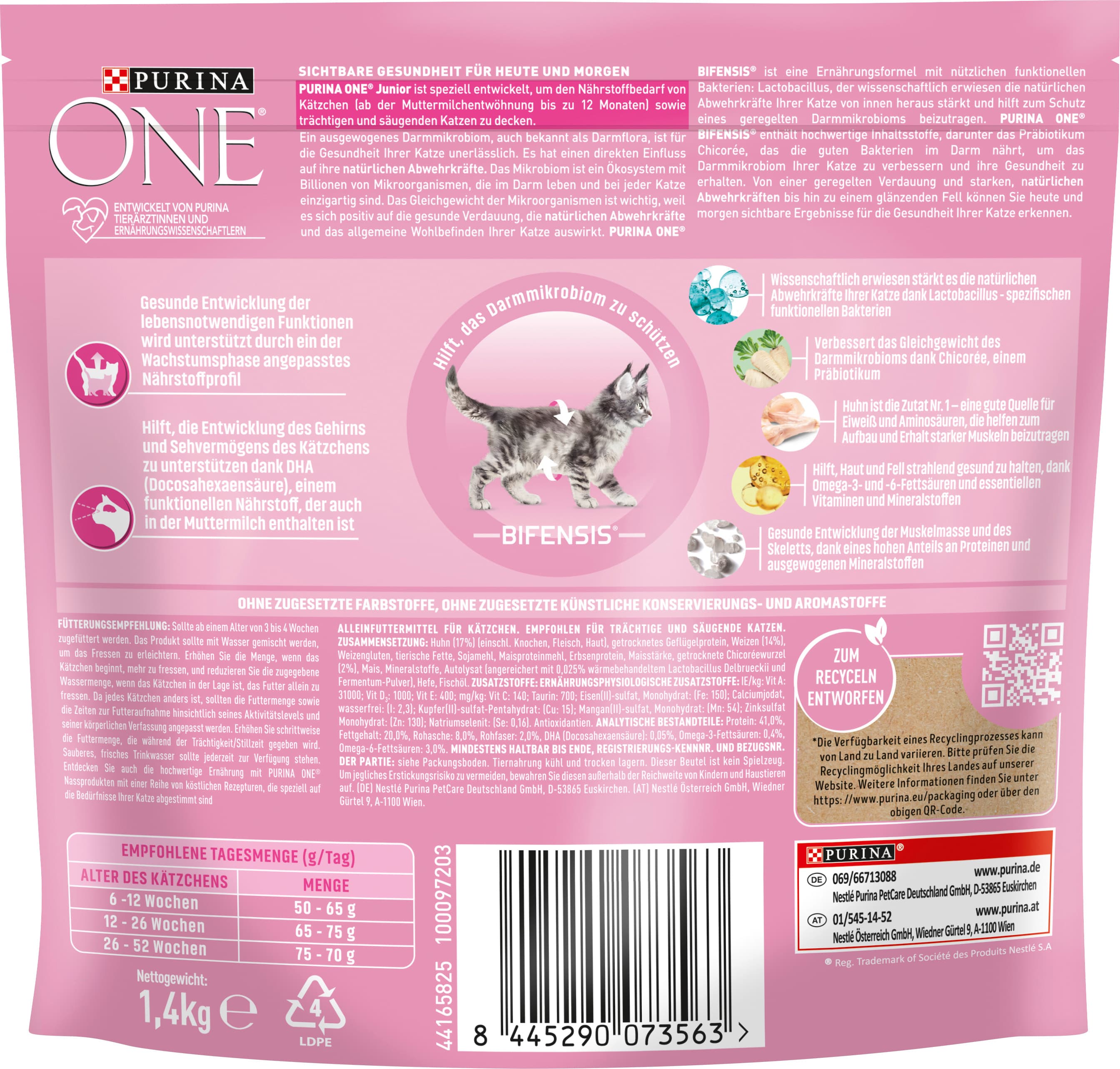 PURINA ONE® JUNIOR ist speziell entwickelt, um den Nährstoffbedarf von Kätzchen (ab der Muttermilchentwöhnung bis zu 12 Monaten) sowie trächtigen und säugenden Katzen zu decken.Ein ausgewogenes Darmmikrobiom, auch bekannt als Darmflora, ist für die Gesundheit Ihrer Katze unerlässlich. Es hat einen direkten Einfluss auf ihre natürlichen Abwehrkräfte. Das Mikrobiom ist ein Ökosystem mit Billionen von Mikroorganismen, die im Darm leben und bei jeder Katze einzigartig sind. Das Gleichgewicht der Mikroorganismen ist wichtig, weil es sich positiv auf die gesunde Verdauung, die natürlichen Abwehrkräfte und das allgemeine Wohlbefinden Ihrer Katze auswirkt.PURINA ONE® BIFENSIS® ist eine Ernährungsformel mit nützlichen funktionellen Bakterien: Lactobacillus, der wissenschaftlich erwiesen die natürlichen Abwehrkräfte Ihrer Katze von innen heraus stärkt und hilft zum Schutz eines geregelten Darmmikrobioms beizutragen. PURINA ONE® BIFENSIS® enthält hochwertige Inhaltsstoffe, darunter das Präbiotikum Chicorée, das die guten Bakterien im Darm nährt, um das Darmmikrobiom Ihrer Katze zu verbessern und ihre Gesundheit zu erhalten. Von einer geregelten Verdauung und starken, natürlichen Abwehrkräften bis hin zu einem glänzenden Fell können Sie heute und morgen sichtbare Ergebnisse für die Gesundheit Ihrer Katze erkennen.