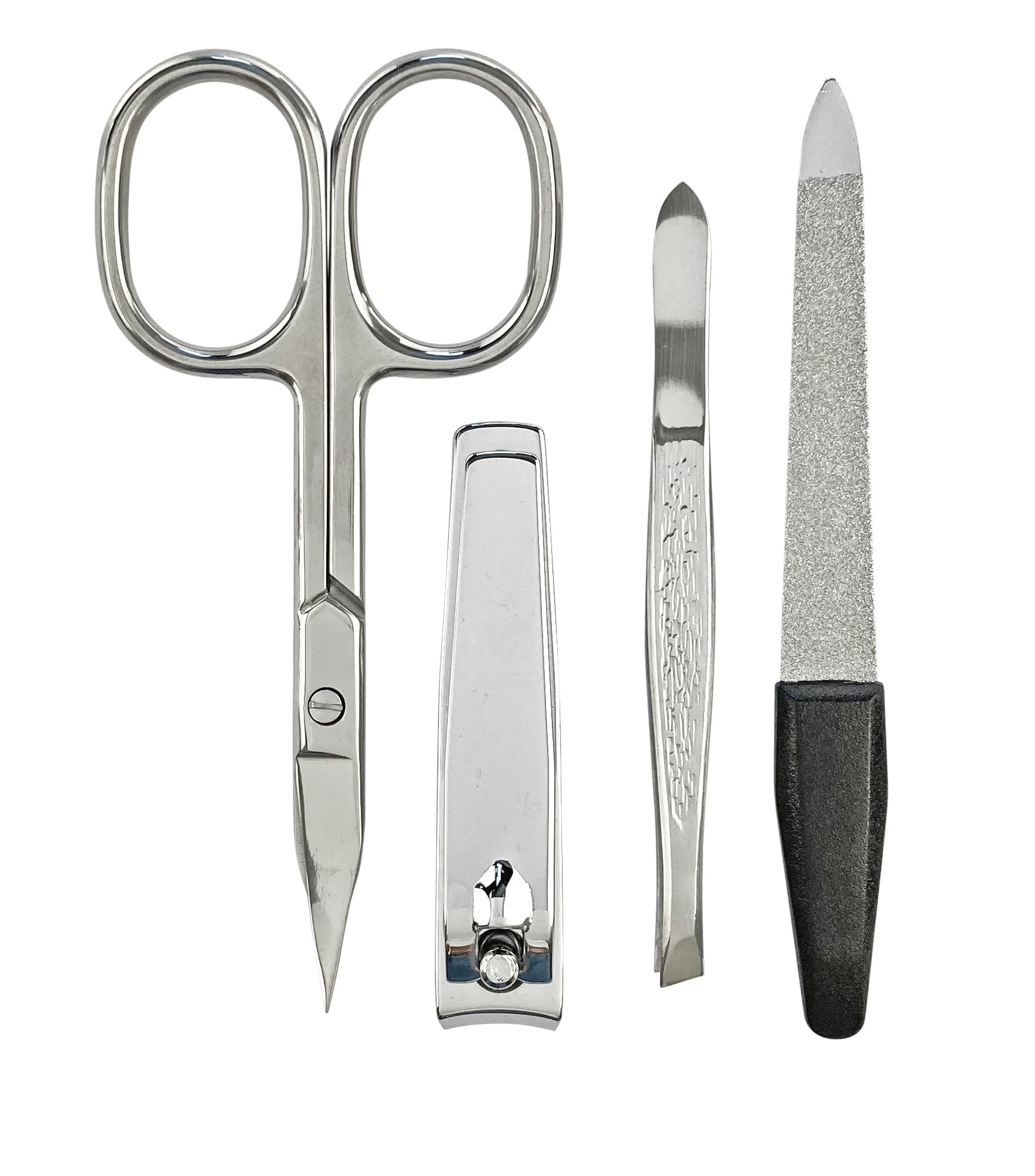Mit dem 4-teiligen Maniküre-Set im praktischen und stylishen Rahmen-Etui verfügen Sieüber hochwertige Instrumente für die perfekte Maniküre. Das Etui ist ausgestattet mit einer Saphirnagelfeile, Pinzette, Kombischere (Haut- und Nagelschere in einem) sowie einem Nagelknipser.