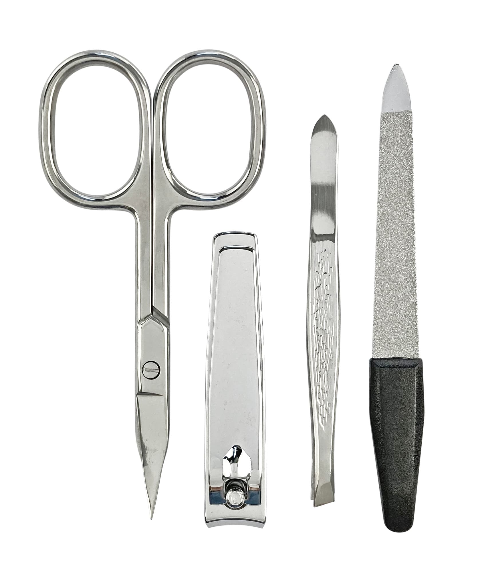 Mit dem 4-teiligen Maniküre-Set im praktischen und stylishen Rahmen-Etui verfügen Sieüber hochwertige Instrumente für die perfekte Maniküre. Das Etui ist ausgestattet mit einer Saphirnagelfeile, Pinzette, Kombischere (Haut- und Nagelschere in einem) sowie einem Nagelknipser.
