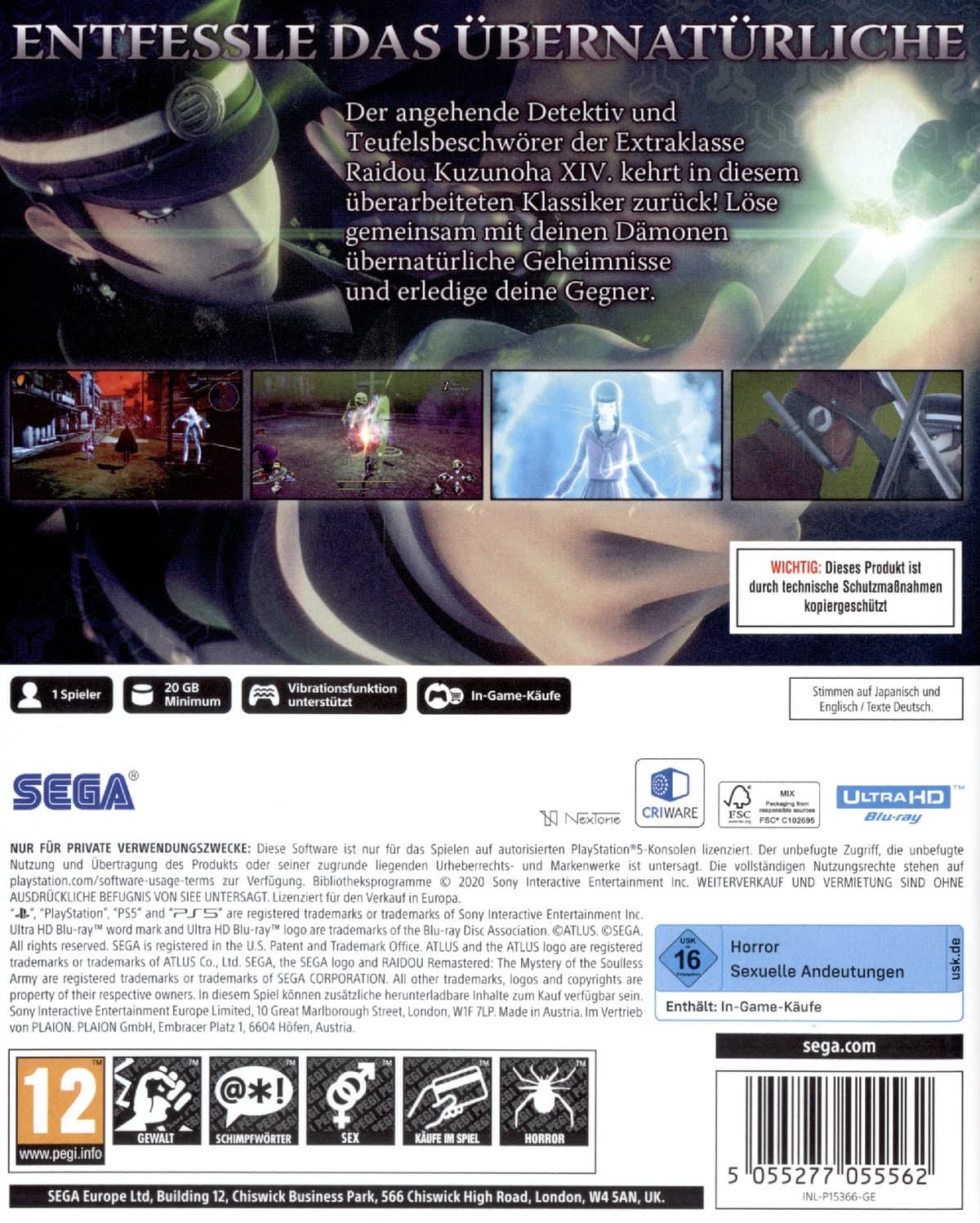 Entfessle das Übernatürliche Der angehende Detektiv und Teufelsbeschwörer der Extraklasse Raidou Kuzunoha XIV. kehrt in diesem überarbeiteten Klassiker zurück! Löse gemeinsam mit deinen Dämonen übernatürliche Geheimnisse und erledige deine Gegner. In diesem absoluten Klassiker von ATLUS löst du den Fall des Jahrhunderts. Das Studio hinter Shin Megami Tensei präsentiert "Devil Summoner: Raidou Kuzunoha vs. The Soulless Army" mit überarbeiteter Grafik, praktischen Verbesserungen, neuer Sprachausgabe und einem optimierten Kampfsystem! Taisho 20, in der Hauptstadt... Eine junge Frau tritt mit der bizarren Bitte an die Narumi-Detektivbüro heran... sie zu töten. Aber schon bald darauf wird das Mädchen entführt. Der als Teufelsbeschwörer aktive junge Detektiv Raidou Kuzunoha XIV. nimmt den Fall in Angriff. Seine Ermittlungen führen ihn durch die ganze Stadt, darunter auch ins Dunkle Reich, einem gefährlichen Ort zwischen der realen Welt und dem Dämonenreich. Werde zu Raidou Kuzunoha und löse gemeinsam mit deinen Dämonen die Geheimnisse auf deinem Weg. Was als Vermisstenfall beginnt, eskaliert schon bald zu einer Verschwörung, die nicht bloß die Hauptstadt, sondern die gesamte Nation erschüttert. FEATURES • Ein verbessertes, dem Original treues Remaster: Der Action-RPG-Klassiker im Zeichen des Übernatürlichen wurde in Sachen Grafik und Sound überholt und das Kampfsystem an moderne Konsolen angepasst, während der Stil des Originals erhalten blieb. Eine brandneue Benutzeroberfläche, Sprachausgabe, erweiterte 3D-Umgebungen und mehr versprechen für Veteranen wie Neulinge ein spannendes Spielerlebnis. • Ein übernatürliches detektivisches Abenteuer: Werde in einem packenden übernatürlichen Fall mit einer Reihe komplexer Charaktere zum Detektiv. Decke in der Hauptstadt die Wahrheit auf hinter einem Netz aus Intrigen, das überraschende Wendungen bereithält. Nutze deinen Verstand und die Macht deiner Dämonen, um alle Hebel in Bewegung zu setzen. • Ein fantastischer Fall aus der Taisho-Zeit: Wandere durch die wundersamen Straßen des historischen Tokio der 1930er oder tauche ein ins Dunkle Reich, in dem die Dämonen dich erwarten. Aus über 120 Dämonen solltest du deine Verbündeten weise wählen, um die Menschheit vor dem Sturz in die Dunkelheit zu bewahren. In der Erstauflage ist zusätzlich zum Spiel der "Raidous Brille" DLC als Code auf einem Flyer in der Box enthalten (kostenloser DLC bei Neukauf enthalten, einmalig verwendbar).