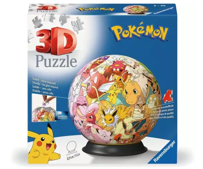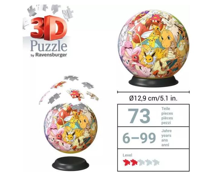 Für große und kleine Pokémon Fans ab 6 JahrenDieses coole Pokémon Motiv macht nicht nur Spaß zu puzzeln, sondern sieht auch toll aus in deinem Zimmer! Aus 72 gewölbten Kunststoff-Puzzleteilen, die dank Easyclick Technology perfekt zusammen passen, entsteht Stück für Stück dieser stabile 3D Puzzle-Ball, ganz ohne Kleben. Die Nummerierung der Teile auf der Rückseite erleichtert das Vorsortieren und ermöglicht einfaches Puzzeln nach Zahlen.Aus gewölbten Kunststoff-Puzzleteilen, die dank EasyClick Technology perfekt zusammen passen, entsteht Stück für Stück dieser stabile 3D Puzzle-Ball, ganz ohne Kleben. Die Nummerierung der Teile auf der Rückseite erleichtert das Vorsortieren und ermöglicht einfaches Puzzeln nach Zahlen.72 nummerierte Kunststoff-Puzzleteile + Aufsteller + AnleitungPuzzeln in der dritten Dimension! Die ideale Geschenkidee für alle Puzzle-Fans ab 6 Jahren. Hochwertige Kunststoffteile mit Easyclick Technology für passgenauen Zusammenhalt - stabil, ganz ohne KlebstoffAus 72 hochwertigen Kunststoff-Puzzleteilen entsteht Stück für Stück ein 3D Puzzle-Ball - ein echter Hingucker und die perfekte Deko auf jedem SchreibtischIdeale Beschäftigung mit Gelinggarantie - dank bebilderter, farbiger Anleitung und nummerierten Puzzleteilen. Fördert räumliches Denkvermögen und FeinmotorikOb für Jungs oder Mädchen, Erwachsene oder Kinder ab 6 Jahren - Spaß für alle 3D Puzzle Fans. Das ideale Geschenk zum Geburtstag oder zu WeihnachtenSchwierigkeitsgrad 2/5, Durchmesser des fertigen Balles ca. 13,00 cm , Verpackung kann abweichen