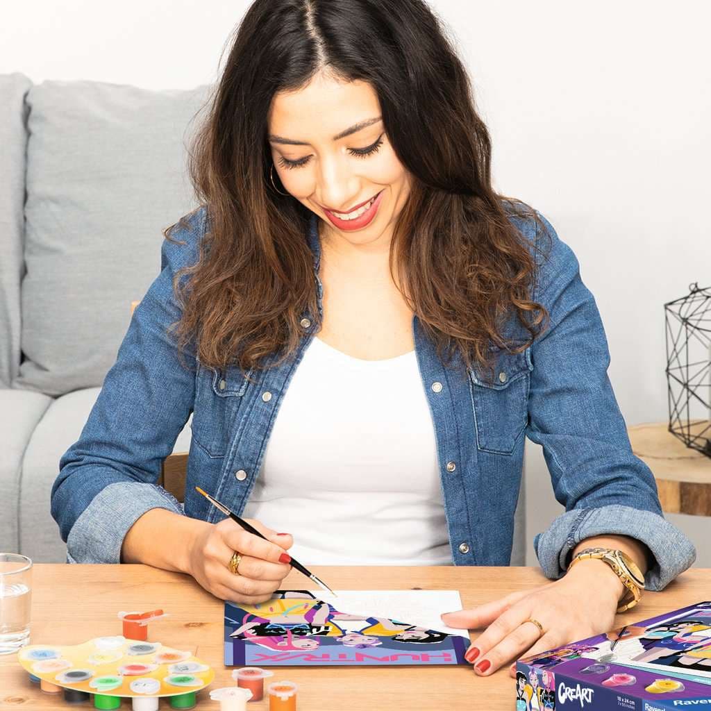 Coole Designs, leuchtende Farben und glänzender Lack für ein perfektes Finish. Das trendige Motiv HUNTR/X bietet großartigen Malspaß für Erwachsene ab 12. Die Motivlinien sind bereits vorgedruckt und nummeriert und müssen mit den fertig gemischten Acrylfarben ausgemalt werden. Das ist Malspaß mit Erfolgsgarantie für eine einzigartige Wanddekoration. Malen war noch nie so einfach!