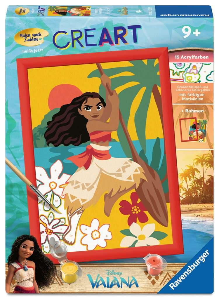 Bastelset für Kinder: Mit diesem kreativen Malset von Ravensburger Malen nach Zahlen ab 9 Jahren können die Kleinen direkt aus der Schachtel heraus loslegen und echte Kunstwerke schaffen Kreative Beschäftigung für Kinder: Die farbigen Motivlinien machen kleinere Fehler unsichtbar, erleichtern das Ausmalen und sorgen so für ein schöneres Endergebnis. Ganz ohne KI, dafür liebevoll von Hand gestaltet – jedes Motiv ein Unikat! Geschenkidee: Das Motiv Vaiana's Abenteuer lässt Kinderaugen leuchten und ist daher ein hervorragendes Geschenk für Mädchen und Jungen – ob zu Weihnachten, Ostern oder zum Geburtstag Kinderzimmerdekoration: Dank des mitgelieferten Rahmens eignet sich Malen nach Zahlen auch perfekt als Dekoration für das Kinderzimmer, sodass Ihre Kinder noch jahrelang stolz auf ihr Kunstwerk sein können Das Malset enthält 15 Acrylfarben in wiederverschließbaren, nummerierten Näpfchen, eine stabile Maltafel mit Rahmen im Format 18,30 cm x 25,00 cm und einen Pinsel. Die Farben trocknen schnell, sind auf Wasserbasis, geruchsneutral und benötigen keinen Pinselreiniger