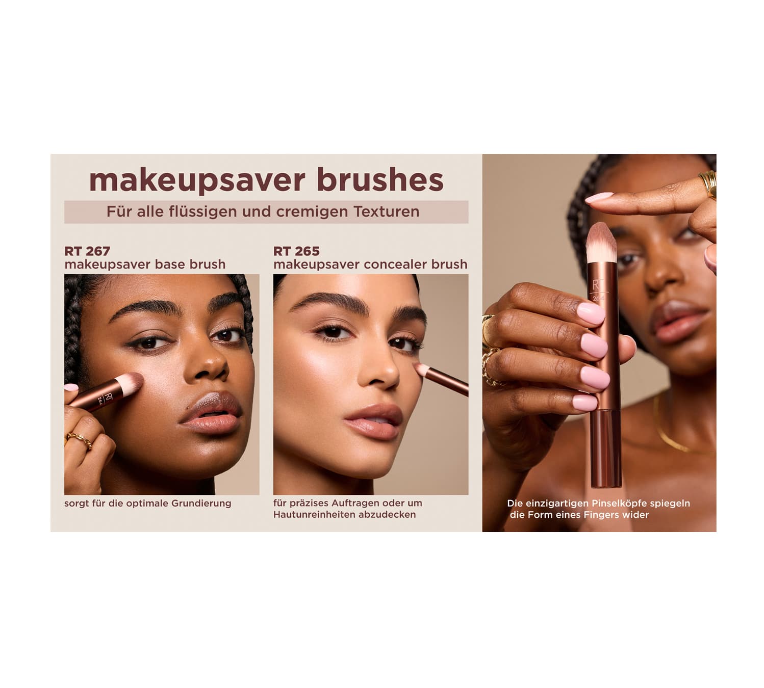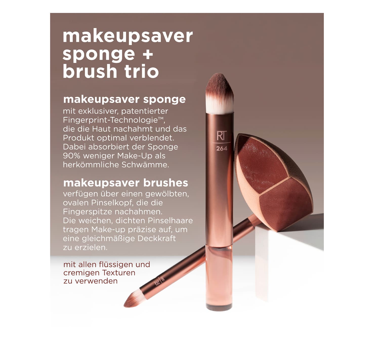 Lerne den neuen kleinen Makeupsaver kennen. Das Real Techniques Makeupsaver Sponge + Brush Trio besteht aus dem Makeupsaver Sponge und zwei Makeup-Pinseln, die die Form Deiner Fingerspitze widerspiegeln und ein präzises Auftragen mit einem natürlich aussehenden Finish ermöglichen. Das Makeup-Pinselset enthält den 267 Makeupsaver Base Brush, den 265 Makeupsaver Concealer Brush und den Makeupsaver Sponge. Der Makeupsaver Sponge wurde mit einer innovativen, Make-up-sparenden Technologie entwickelt, um die Aufnahme von Make-up zu reduzieren und gleichzeitig ein natürliches, streifenfreies Finish zu erzielen.