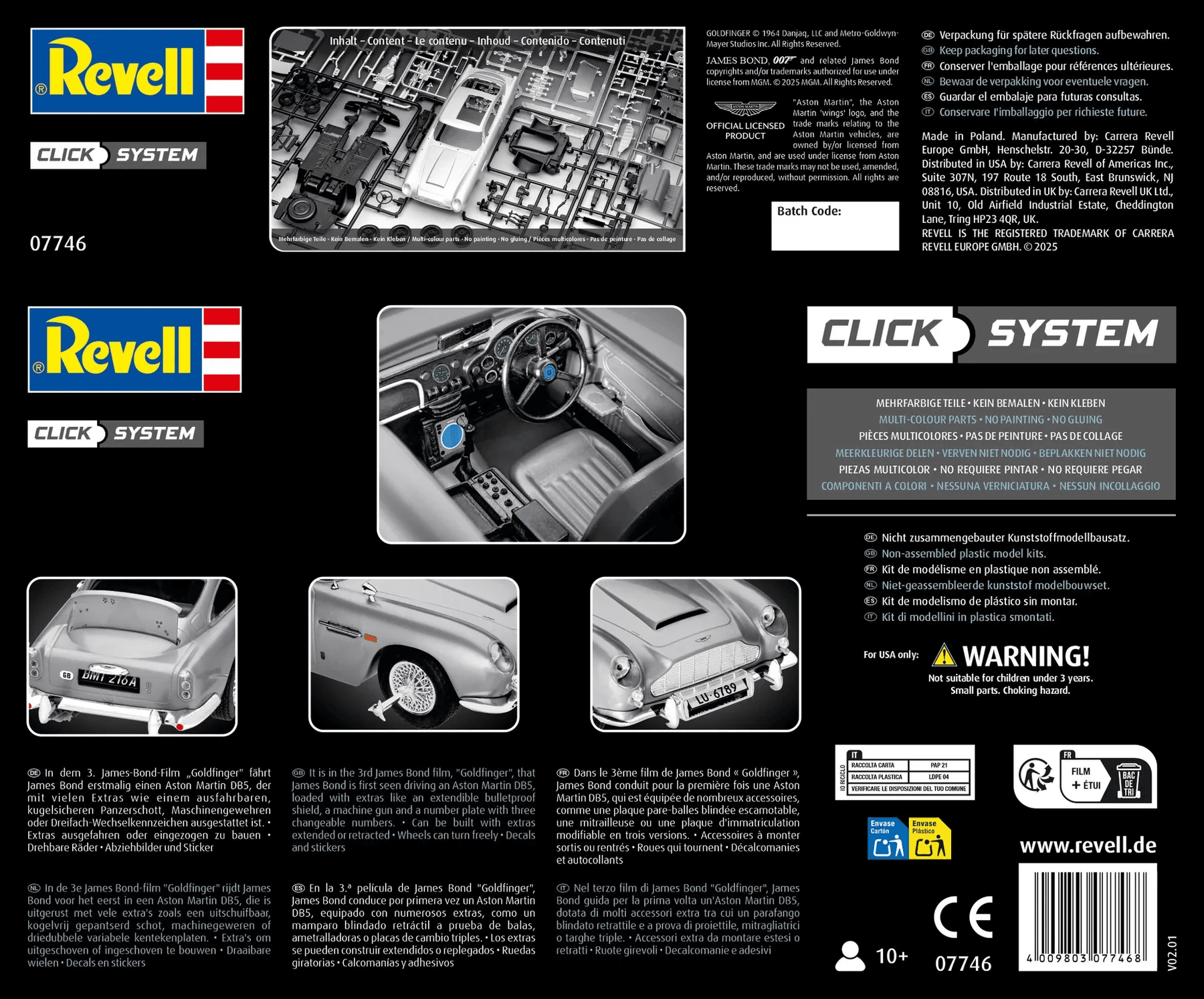Tauchen Sie ein in die Welt von 007 mit dem legendären Aston Martin DB5 aus den James-Bond-Filmen – jetzt als detailgetreuer Modellbausatz im praktischen Click-System von Revell! Ganz ohne Kleber entsteht ein echtes Kultobjekt, das Fans und Modellbau-Enthusiasten gleichermaßen begeistert.
