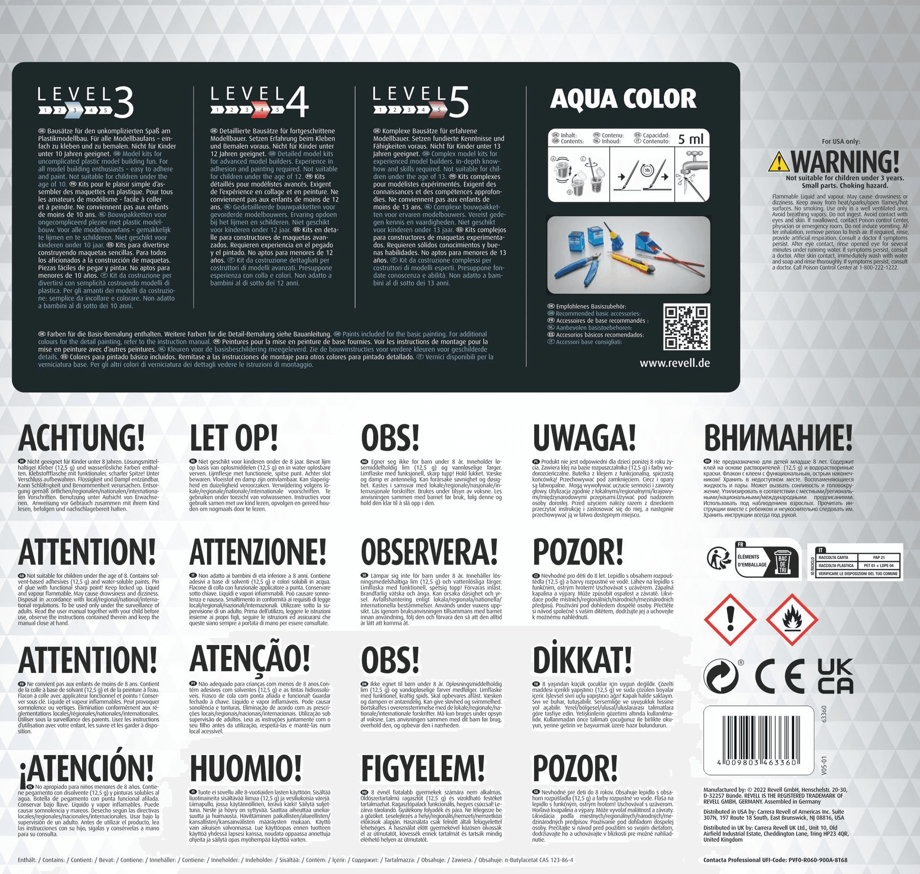 Benutzung unter Aufsicht von Erwachsenen. Anweisung vor Gebrauch zusammen mit ihrem Kind lesen, befolgen und nachschlagebereit halten. Achtung. Nicht geeignet für Kinder unter 8 Jahren. Lösungsmittelhaltiger Kleber (12,5 g) und wasserlösliche Farben enthalten. Klebstoffflasche mit funktionaler, scharfer Spitze! Nur für USA: WARNUNG! Nicht geeignet für Kinder unter 3 Jahren. Kleine Teile. Erstickungsgefahr. Kann Schläfrigkeit und Benommenheit verursachen Ist ärztlicher Rat erforderlich, Verpackung oder Kennzeichnungsetikett bereithalten. Darf nicht in die Hände von Kindern gelangen. Vor Gebrauch Kennzeichnungsetikett lesen. Einatmen von Staub/Rauch/Gas/Nebel/Dampf/Aerosol vermeiden. Unter Verschluss aufbewahren. Entsorgung des Inhalts / des Behälters gemäß den örtlichen / regionalen / nationalen / internationalen Vorschriften.