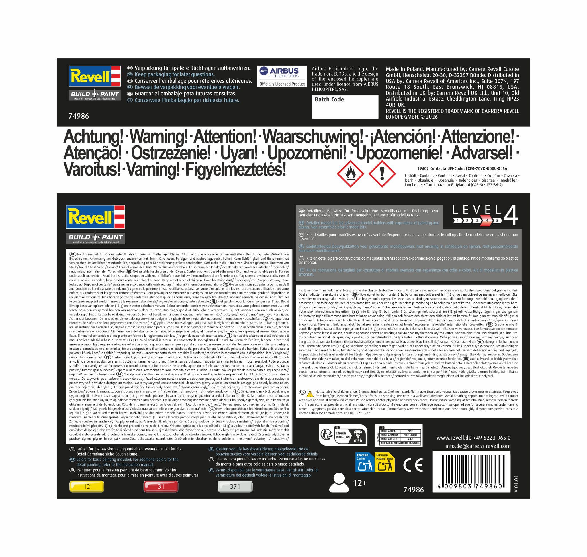 Modellbausatz des EC135 Air-Glaciers Rettungshubschraubers. Air-Glaciers ist das zweitgrößte Schweizer Helikopterunternehmen. Modelldetails: - Cockpit mit Instrumentenbord - Detaillierter Innenraum - Beweglicher Hauptrotor - Fenestron-Rotor Authentische Abziehbilder für folgende Version: - Airbus Helicopters EC-135, HB-ZRK Air Glaciers, 2015 Neben Basisfarben sind auch Kleber und Pinsel enthalten. Maßstab 1/72. 75 Einzelteile. 14,3 cm Länge.