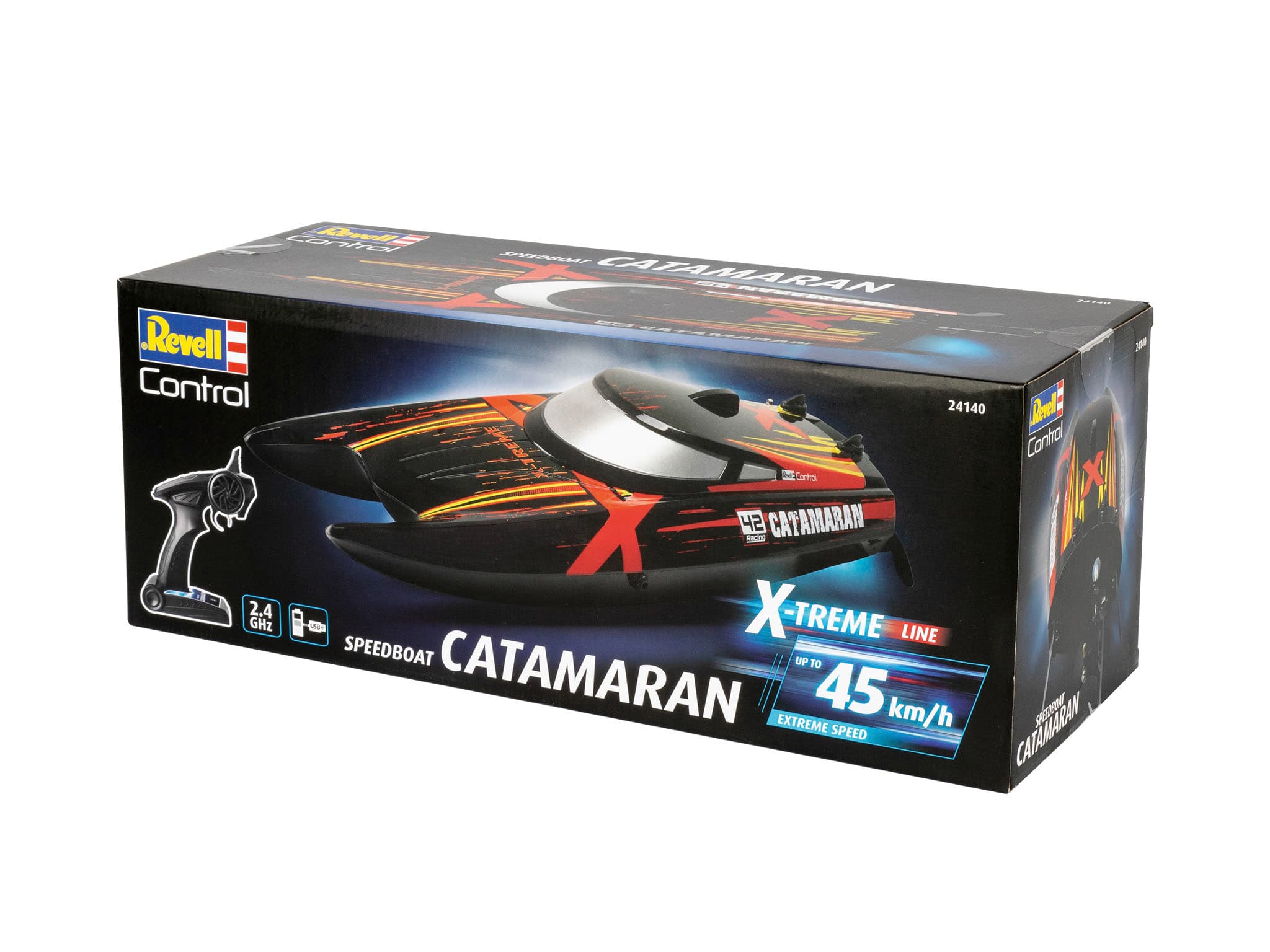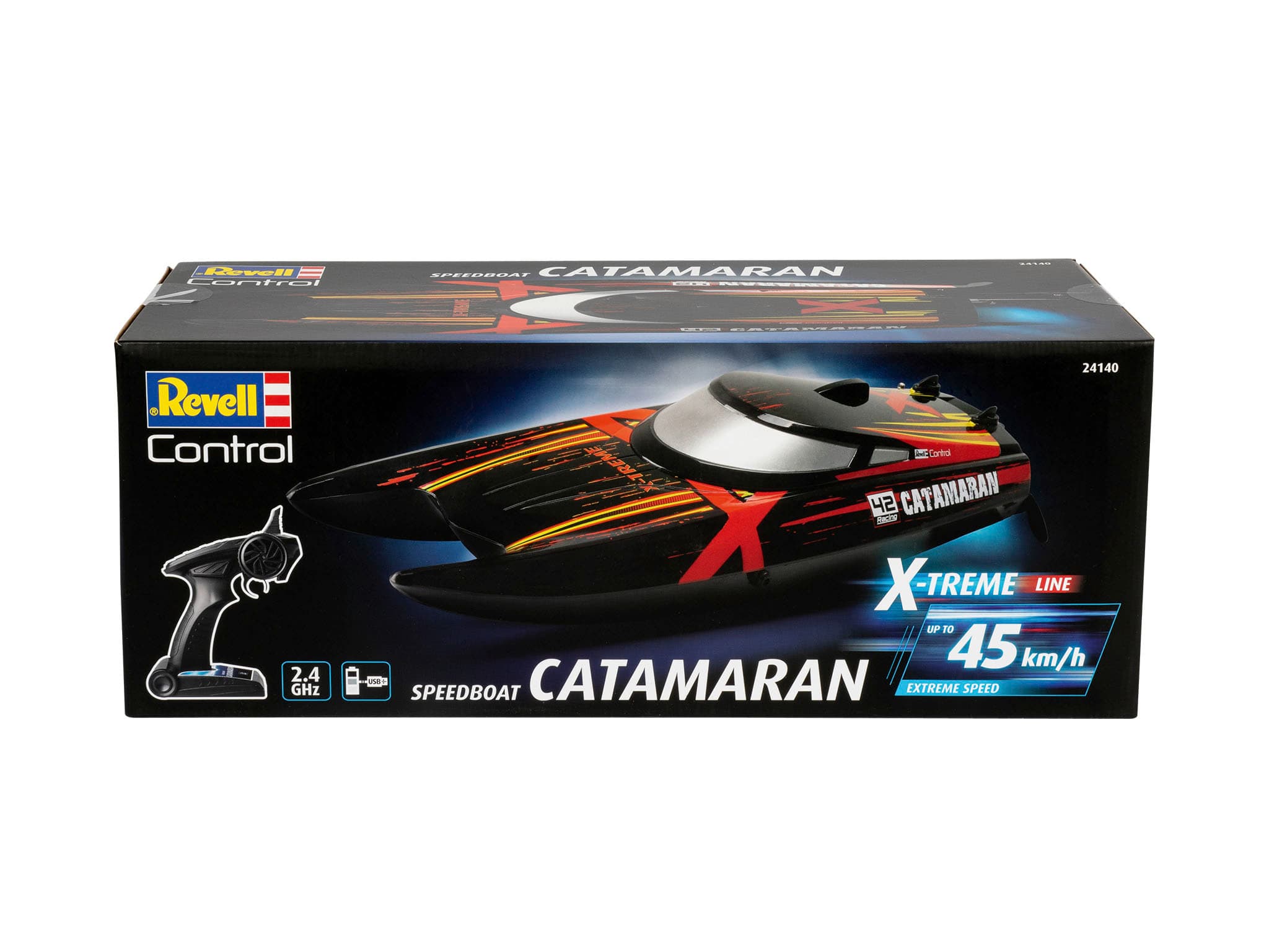 Die X-TREME Line von Revell Control steht für das ultimative Fahrerlebnis im RC-Bereich. DerX-TREME Catamaran bietet die Performance, die man sich wünscht. Mit dem robusten Rumpf, dem kraftvollen 7,4 V LiPo-Akku und der 2.4 GHz-Fernsteuerung wird der wassergekühlten Motor zuHöchstleistungen angetrieben. Mit bis zu 45 km/h rast der X-TREME Catamaran über das Wasser. DasBattery Warning System teilt mit wenn der Akku fast leer gefahren ist, so hat man immer noch genugAkkuleistung um in den Hafen zurück zu fahren. Außerdem verfügt der 44 cm lange Catamaran über eine „Anti Kenter Funktion“, so dass sich der schnittige Catamaran bei rasanten Manövern einfach wieder aufrichtet. Durch die 2.4 GHz Technologie können mehrere Boote gleichzeitig gesteuert werden, ohnegegenseitige Störungen. Die enthaltene Schutzschaltung verhindert das Anlaufen der Propeller, wenndas Boot an Land ist. So besteht keine Verletzungsgefahr. Inhalt: Modell, GHz-Fernsteuerung, USB-Ladegerät / USB-Ladekabel / Akku, Bedienungsanleitung,
