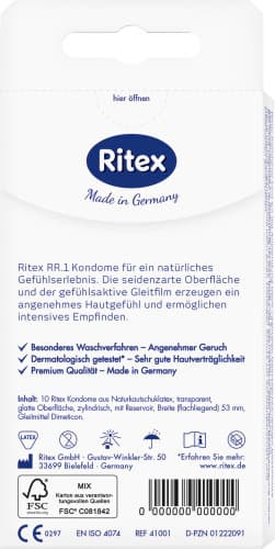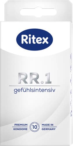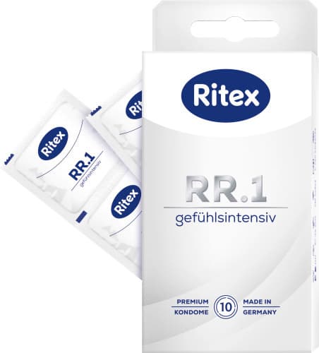 Die gefühlsintensiven Ritex RR.1 Kondome mit seidenzarter Oberfläche und gefühlsaktivem Gleitfilm erzeugen ein angenehmes Hautgefühl und ermöglichen intensives Empfinden.Ritex RR.1 10 Kondome aus Naturkautschuklatex, transparent, glatte Oberfläche, zylindrisch, mit Reservoir, Breite (flachliegend) 53 mm, Gleitmittel Dimiticon.