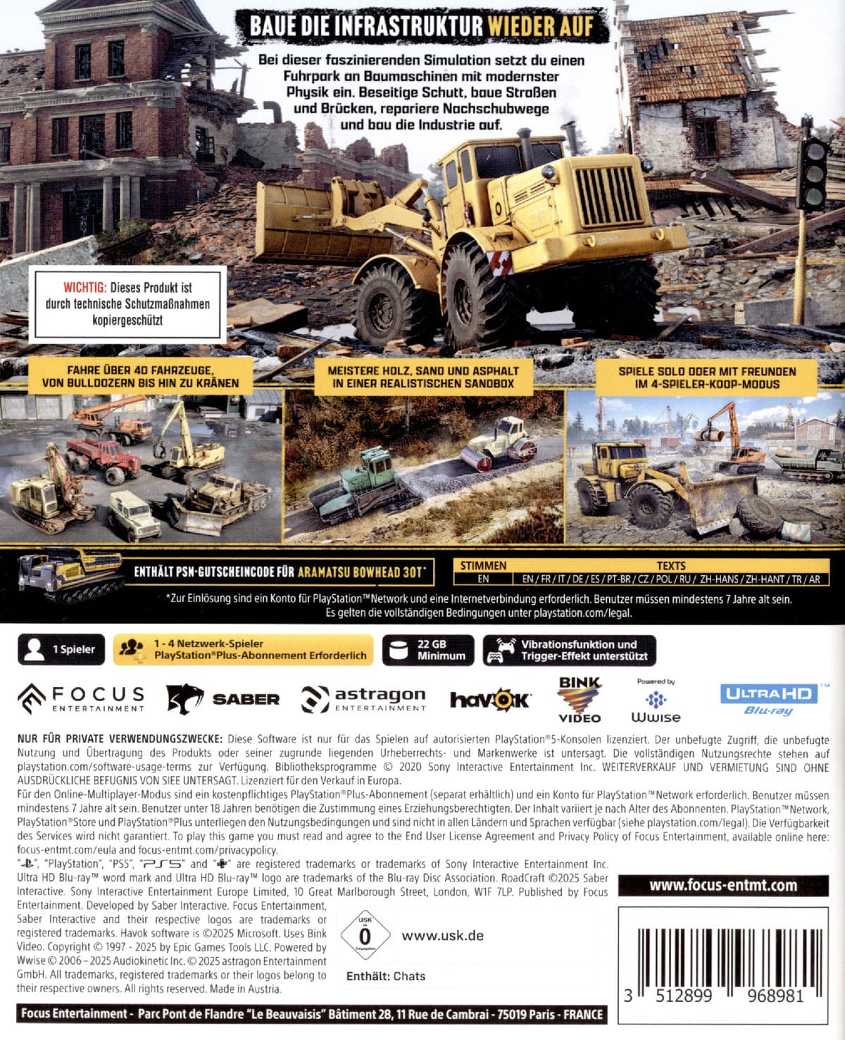 Erlebe eine neue Generation fortgeschrittener Simulation entwickelt von Saber Interactive, der Machern von MudRunner und SnowRunner. Du führst ein Spezial-Unternehmen zum Wiederaufbau von Standorten, die durch Naturkatastrophen zerstört wurden. Viele Aufgaben warten auf dich, um die örtliche Industrie wieder in Schwung zu bringen: Trümmer beseitigen, defekte Gerätschaften austauschen, Straßen und beschädigte Brücken neu bauen und vieles mehr! Wähle sorgfältig den Weg mit deinen Fahrzeugen durch verlassene Fabriken, überschwemmte Dämme oder Solarfelder, die außer Betrieb sind. Als Einsatzleiter planst du die Routen deiner Transportwagen auf der Karte und stellst sich, dass ihnen keine Hindernisse im Weg stehen! FEATURES • Bau zerstörte Gebiete allein oder im Koop-Modus mit bis zu 4 Spielern in einer Simulation mit fortschrittlicher Physik wieder auf. • Führe mehr als 40 Fahrzeuge, von Planierraupen bis zu Baukränen. • Schreite in verschiedenen Regionen auf der ganzen Welt auf 8 Karten ein, die jeweils 4 km² groß sind. • Manipuliere Elemente wie Holz, Sand und Asphalt durch Saber Interactives neue Physik-Engine. • Baue neue Straßen und Brücken, um einfacher durch schwieriges Gelände zu gelangen. • Plane Punkt-zu-Punkt-Verbindungen auf deiner Karte, um deine Logistik-Konvois zu führen, und recycle sämtliche Trümmer zu Baumaterial. Beim Kauf einer Hardcopy von RoadCraft erhältst du den Aramatsu Bowhead 30T, einen leistungsstarken Schwerlasttransporter mit einem um 360 Grad drehbaren Unterbau, der mit einer großen Mulde und Raupenketten ausgestattet ist, bis zu 30 Tonnen Sand schütten und als Sandauffüller für andere Transporter dienen kann.