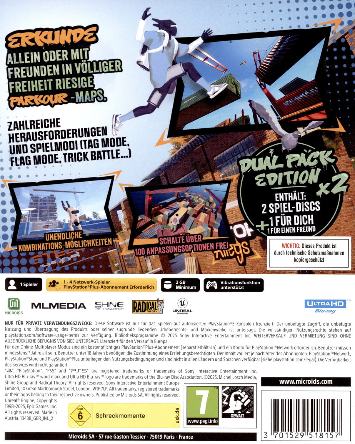 Erkunde allein oder mit Freunden frei riesige Parkour-Karten. Erreiche jeden Winkel des Spielplatzes, um versteckte Orte zu entdecken und spiele Zeitrennen, Trick-Herausforderungen und mehr! Tauche im Mehrspielermodus in Spielmodi wie TAG, Capture the Flag, Trick-Kämpfe oder in den Freerunning-Modus mit deinen Freunden ein!