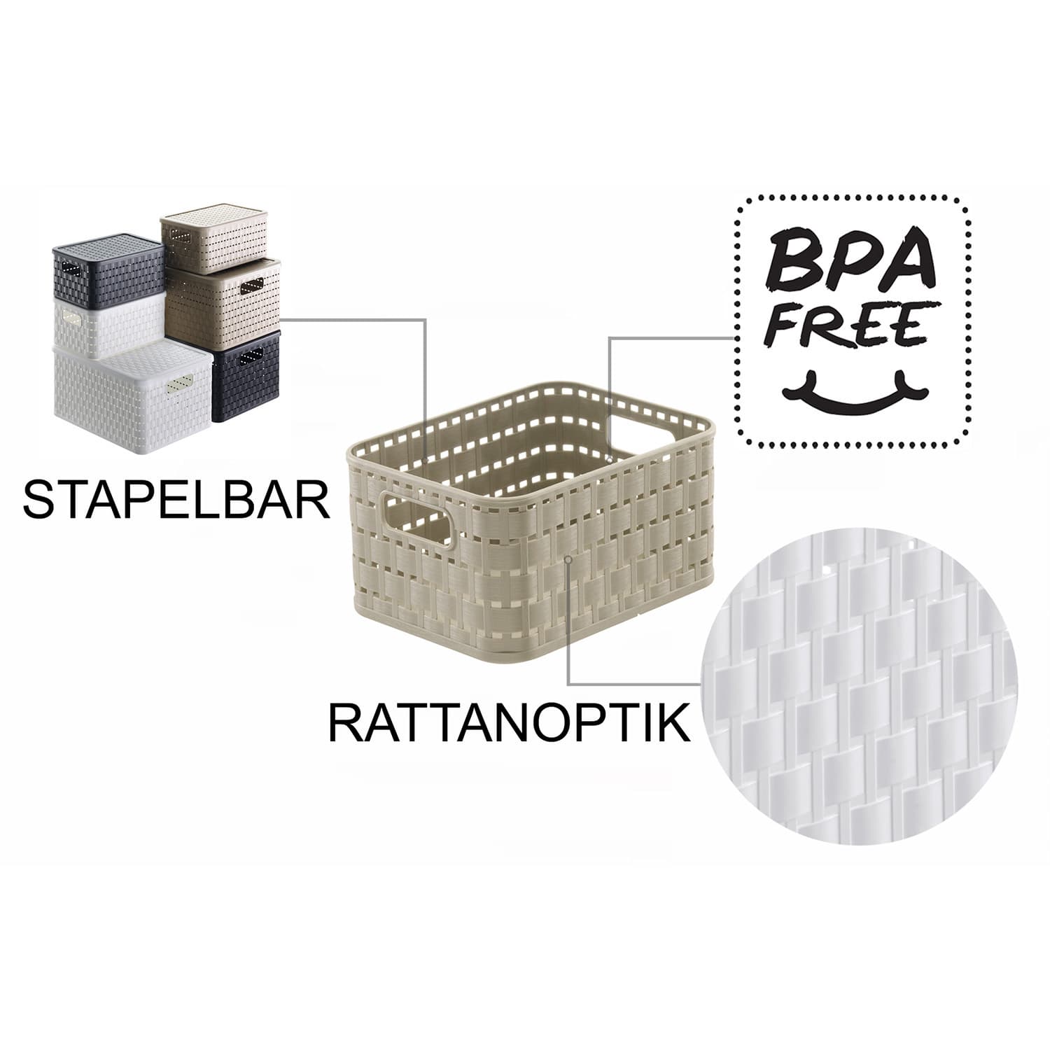 Der wohnliche Look der Aufbewahrungskörbe von Naturmaterialien verbunden mit der Pflegeleichtigkeit von Kunststoff - das ist die ideale Aufbewahrungslinie für den Wohnbereich! Die Körbchen Country sind mit oder ohne Deckel eine Augenweide. Sie fügen sich in ein naturnahes Wohnambiente im Landhausstil ebenso harmonisch ein, wie in eine moderne Umgebung. Die Dekokörbe im Rattan-Design können im ganzen Haushalt eingesetzt werden. Sie sind in vielen Farben und unterschiedlichen Größen erhältlich, Deckel können separat gekauft werden. Ob in Küche, Bad, Wohnzimmer oder als Spielzeugkiste im Kinderzimmer, sie sindüberall beliebte Ordnungsschaffer, da sie einfach abwaschbar und bei Bedarf sogar spülmaschinentauglich sind. - Aufbewahrungssystem im Rattan-Look - Aus hochwertigem Kunststoff (PP) - Einfach zu reinigen (spülmaschinengeeignet) - Sicher stapelbar - Hergestellt in der Schweiz