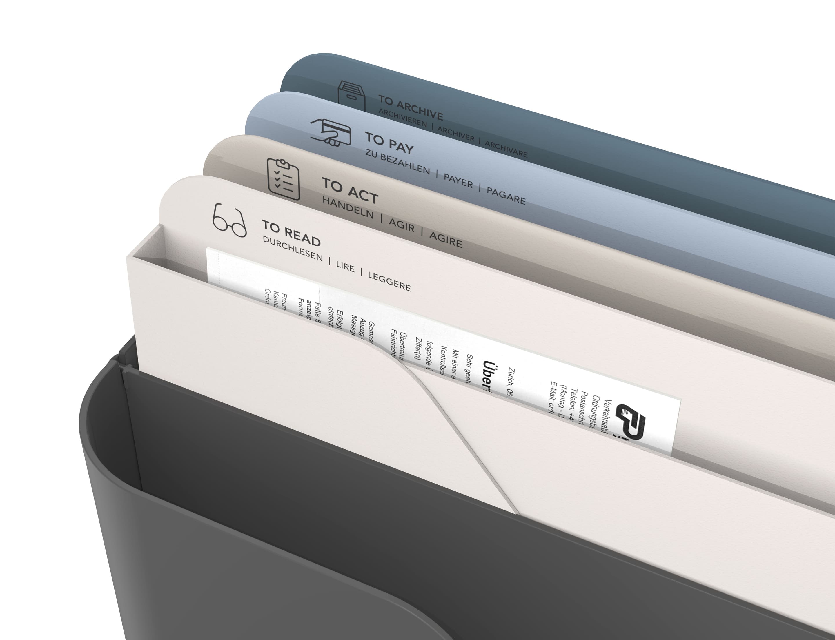 - Die Dokumentenbox ist perfekt, um eingehende Dokumente in verschiedene Kategorien zu sortieren: zu bezahlen, zu lesen, zu erledigen, zu archivieren
