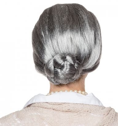 Graumelierte Großmutterperücke mit Mittelscheitel, deren Haare im Nacken zu einem verschlungenen Knoten gebunden sind.Inhalt:Unisex PerückeMaterial:100% Polyester