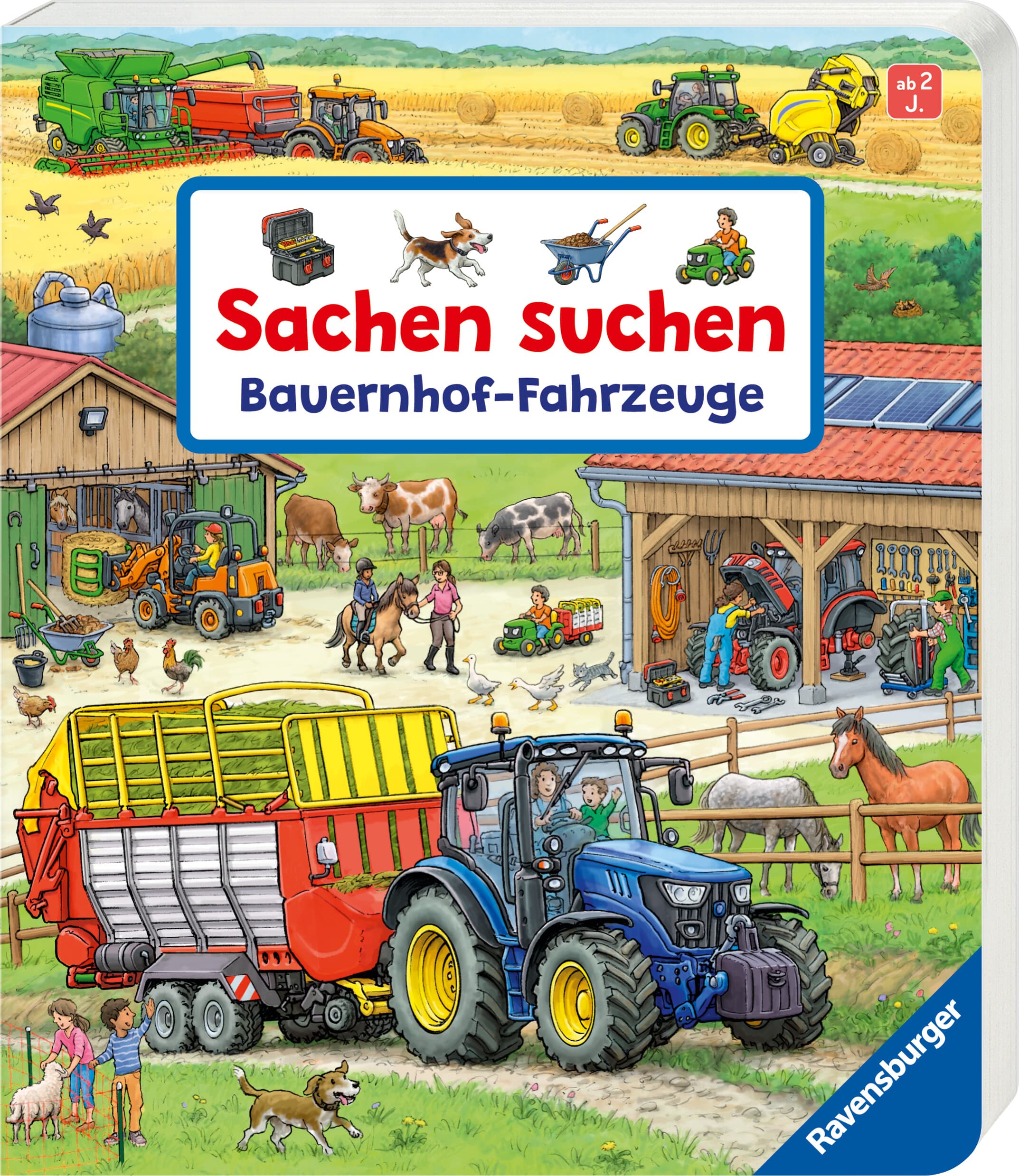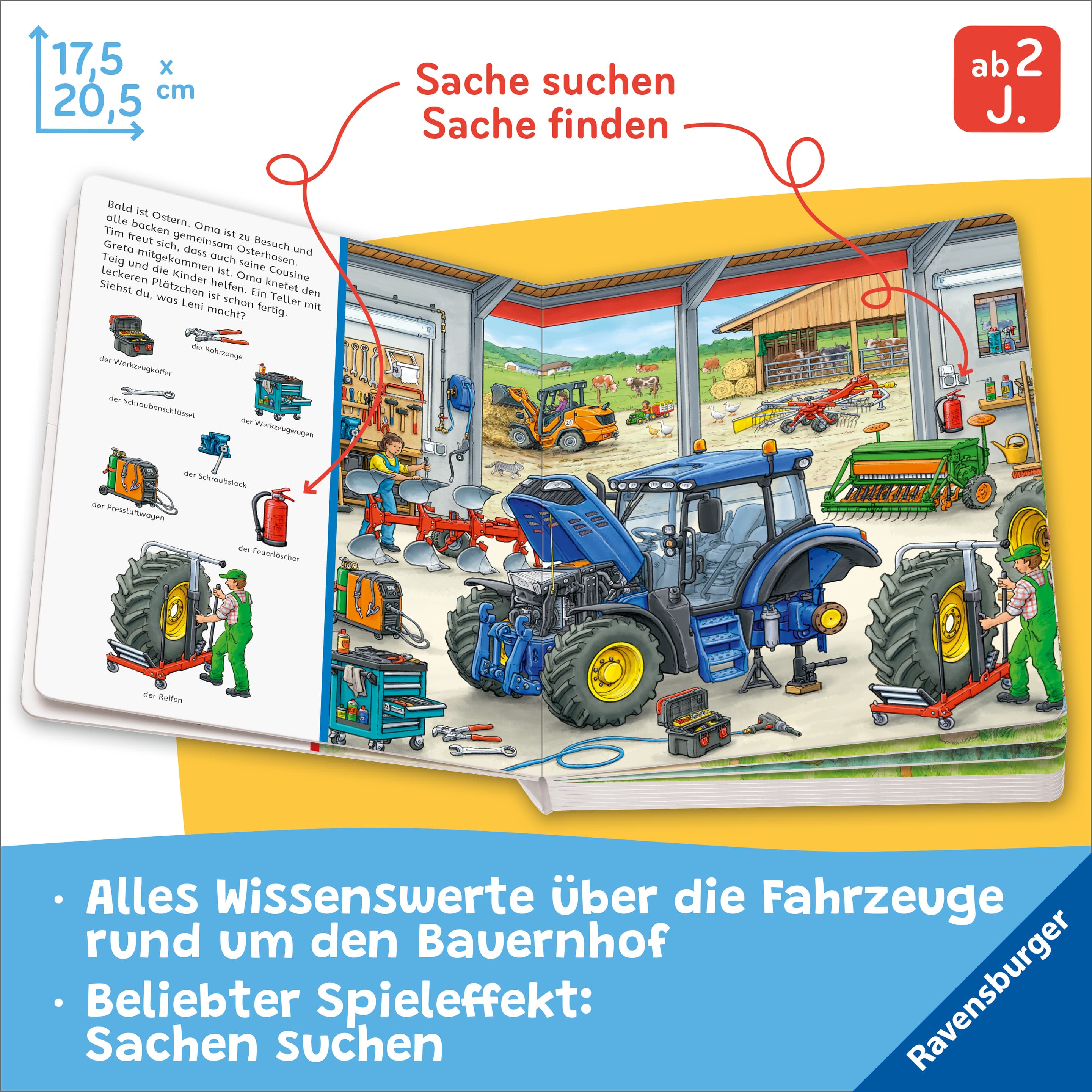 Mit "Sachen suchen" die Welt der Bauernhof-Fahrzeuge entdecken. Ob bei der Arbeit auf dem Feld, oder beim Füttern der Tiere: auf einem Bauernhof werden viele verschiedene, große und kleine Fahrzeuge gebraucht. Und die gibt es alle auch auf der Landmaschinenausstellung zu bestaunen: verschiedenen Traktoren für ihre unterschiedlichen Einsatzbereiche, Spezialgeräte für die Versorgung der Tiere auf dem Hof und natürlich die Werkzeuge die für die Reparaturen benötigt werden. Detailgetreue Illustrationen helfen dabei, die Neugier der kleinen Fahrzeugfans zu stillen und vermitteln erstes Wissen über die Technik auf einem Bauernhof. Ein Lieblingsbuch nicht nur für kleine Fahrzeugspezialisten.