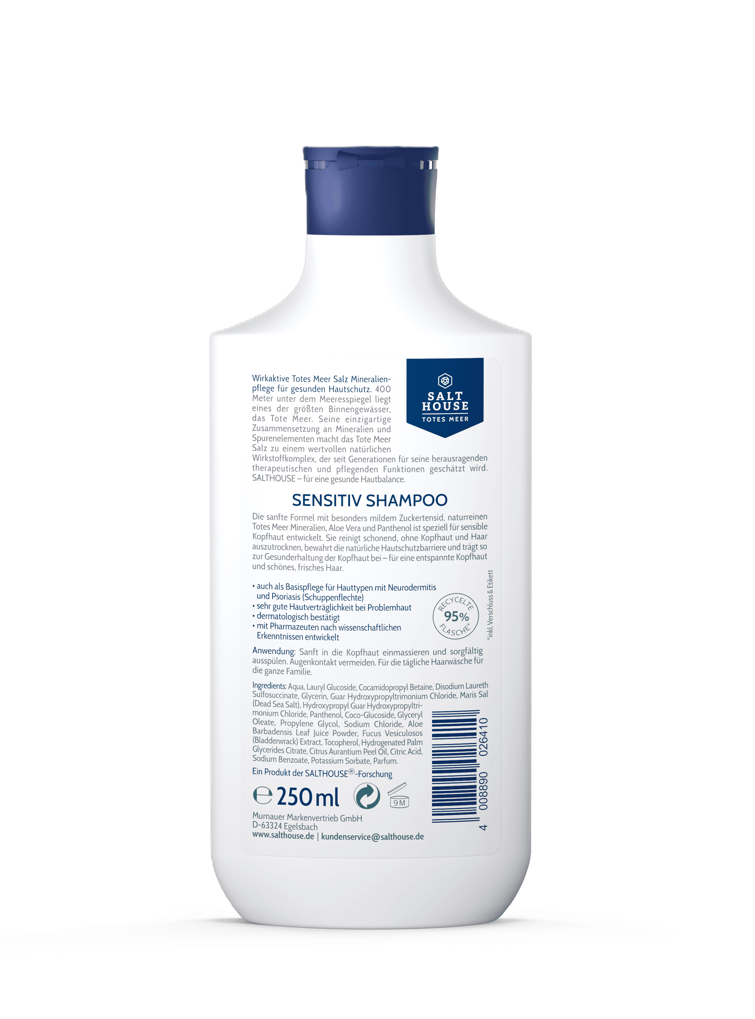 Die sanfte, pH-hautneutrale Formel des Sensitiv Shampoo enthält ein besonders mildes Zuckertensid, naturreine Totes-Meer-Mineralien, Aloe Vera und Panthenol und ist speziell für sensible Kopfhaut entwickelt. Sie reinigt sanft, ohne Kopfhaut oder Haare auszutrocknen, bewahrt die natürliche Hautschutzbarriere und trägt zur Gesunderhaltung der Kopfhaut bei. Das Shampoo sorgt für schön gepflegtes Haar und ist ideal für die tägliche Haarwäsche für die ganze Familie. Das Sensitiv Shampoo kann auch als Basispflege für Hauttypen mit Neurodermitis und Psoriasis verwendet werden. Es zeichnet sich durch eine sehr gute Hautverträglichkeit, auch bei Problemhaut aus und ist dermatologisch bestätigt.