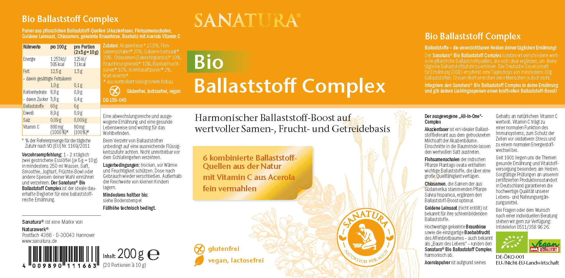 | Zutaten | Akazienfaser* 27,5%, Flohsamenschalen* 20%, Goldene Leinsaat* 20%, Chiasamen (Salvia hispanica)* 10%, Braunhirse gekeimt* 10%, Baobabfruchtpulver* 10%, Acerolasaftpulver* 2%, Maltodextrin*.* aus kontrolliert biologischem Anbau. |