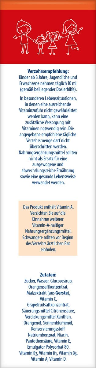 | Anwendungshinweis | Kinder ab 3 Jahren erhalten täglich 10 ml (gemäß beiliegender Dosierhilfe). Die gleiche Dosierung gilt für Jugendliche und Erwachsene. In besonderen Lebensituationen, in denen eine ausreichende Vitaminzufuhr nicht gewährleistet werden kann, kann eine zusätzliche Versorgung mit Vitaminen notwendig sein. Die angegebene empfohlene tägliche Verzehrmenge darf nicht übschritten werden. Nahrungsergänzungsmittel sollten nicht als Ersatz für eine ausgewogene Ernährung sowie eine gesunde Lebensweise verwendet werden. |