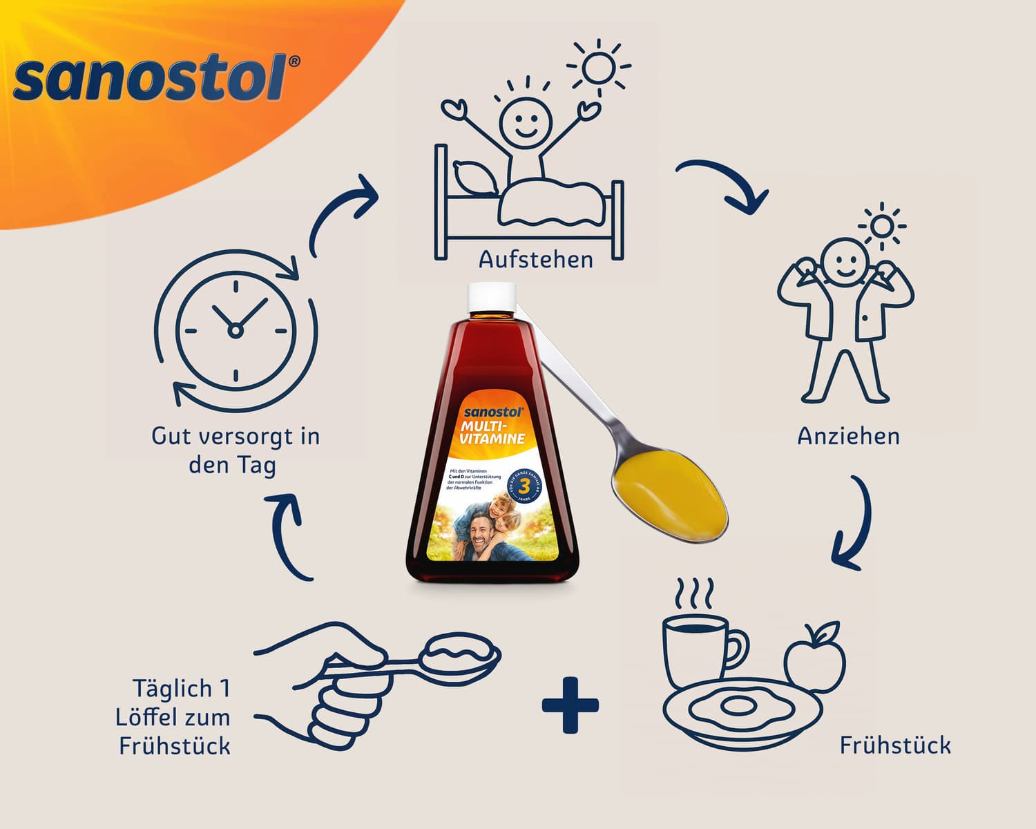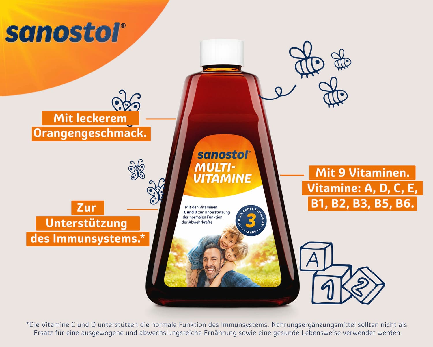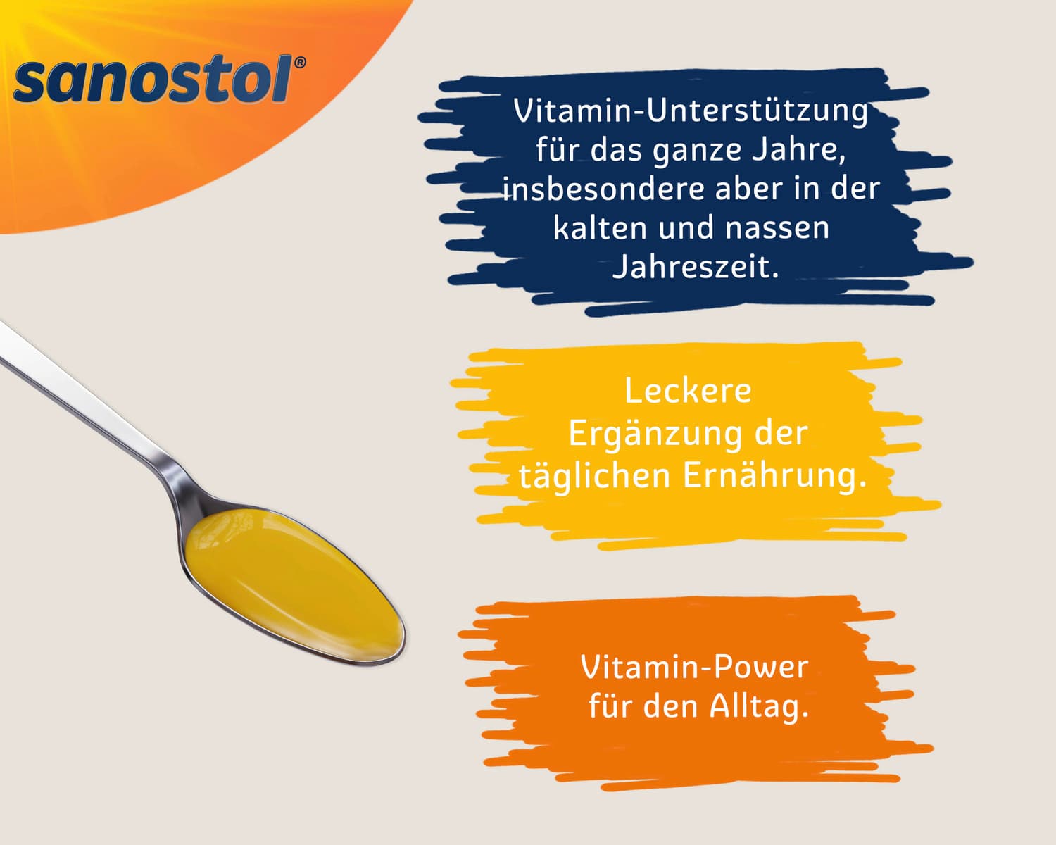 Mit dem leckeren Sanostol® können Sie die Ernährung mit einer Kombination von lebenswichtigen Vitaminen sinnvoll ergänzen und z.B. mit den Vitaminen A, D, B6 und C zu einer normalen Funktion des Immunsystems beitragen