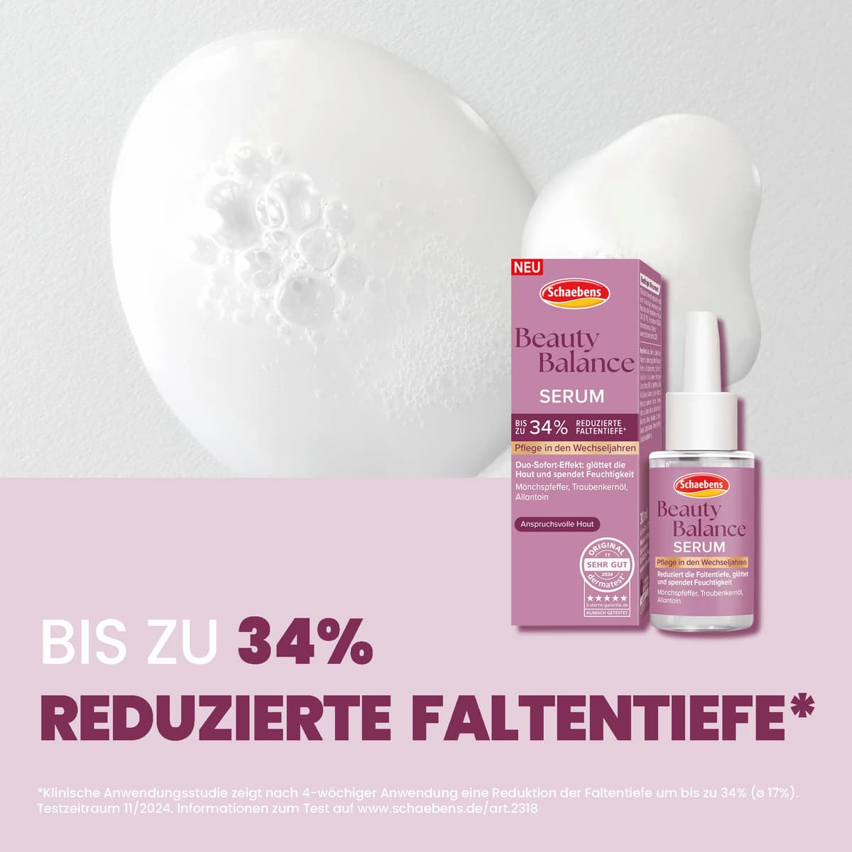Bestätigte Wirksamkeit *Klinische Anwendungsstudie zeigt nach 4-wöchiger Anwendung eine Reduktion der Faltentiefe um bis zu 34% (ø 17%). Testzeitraum 11/2024. Informationen zum Test auf www.schaebens.de/art.2318