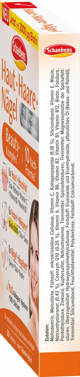 Unsere Haut, Haare und Nägel prägen unsere natürliche Schönheit, an der auch unsere Körperzellen beteiligt sind. Sie erhalten als kleine Regenerationswunder die Nährstoffe über den Blutkreislauf. Das heißt: Eine gesunde Lebensweise ist unumgänglich für schöne Haut, Haare und Nägel. Schaebens Haut ∙ Haare ∙ Nägel Beauty-Komplex mit seiner aufeinander abgestimmten 10-fach* Beauty-Formel ist eine wertvolle Nahrungsergänzung. Hochwertige Nähr- und Aufbaustoffe Für jeden Haut- und Haartyp glutenfrei laktosefrei Für Haut¹ + Hautbild¹ Die Haut¹ versorgt der Beauty-Komplex mit ¹Zink, ¹Vitamin A (Retinol), ¹Vitamin B2, ¹Niacin (B3) und ¹Biotin (B7), die zur Erhaltung normaler *Haut beitragen. ¹Vitamin C trägt zu einer normalen *Kollagenbildung für eine normale Funktion der Haut bei. Vitamin C, Vitamin E und Zink tragen dazu bei, die Zellen vor *oxidativem Stress zu schützen. Freie Radikale (z. B. durch UV-Strahlung, Zigarettenrauch) können das antioxidative Schutzsystem der Haut durch oxidativen Stress beanspruchen. Kupfer trägt zur normalen *Hautpigmentierung bei. Vitamin A unterstützt die *Zellspezialisierung. Folsäure (B9) hat eine Funktion bei der *Zellteilung. Für Haare² + Wimpern² Für die Haare², mitunter auch die *Wimpern, liefert der Beauty-Komplex das Haar-Vitamin ²Biotin sowie ²Selen und ²Zink, die zur Erhaltung normaler *Haare beitragen. Für Nägel³ + Nagelbett⁴ Für die Nägel³ tragen darüber hinaus ³Selen und ³Zink zur Erhaltung normaler *Nägel bei. ⁴Kupfer trägt zur Erhaltung des normalen Bindegewebes bei. Zum Bindegewebe zählt auch das *Nagelbett.