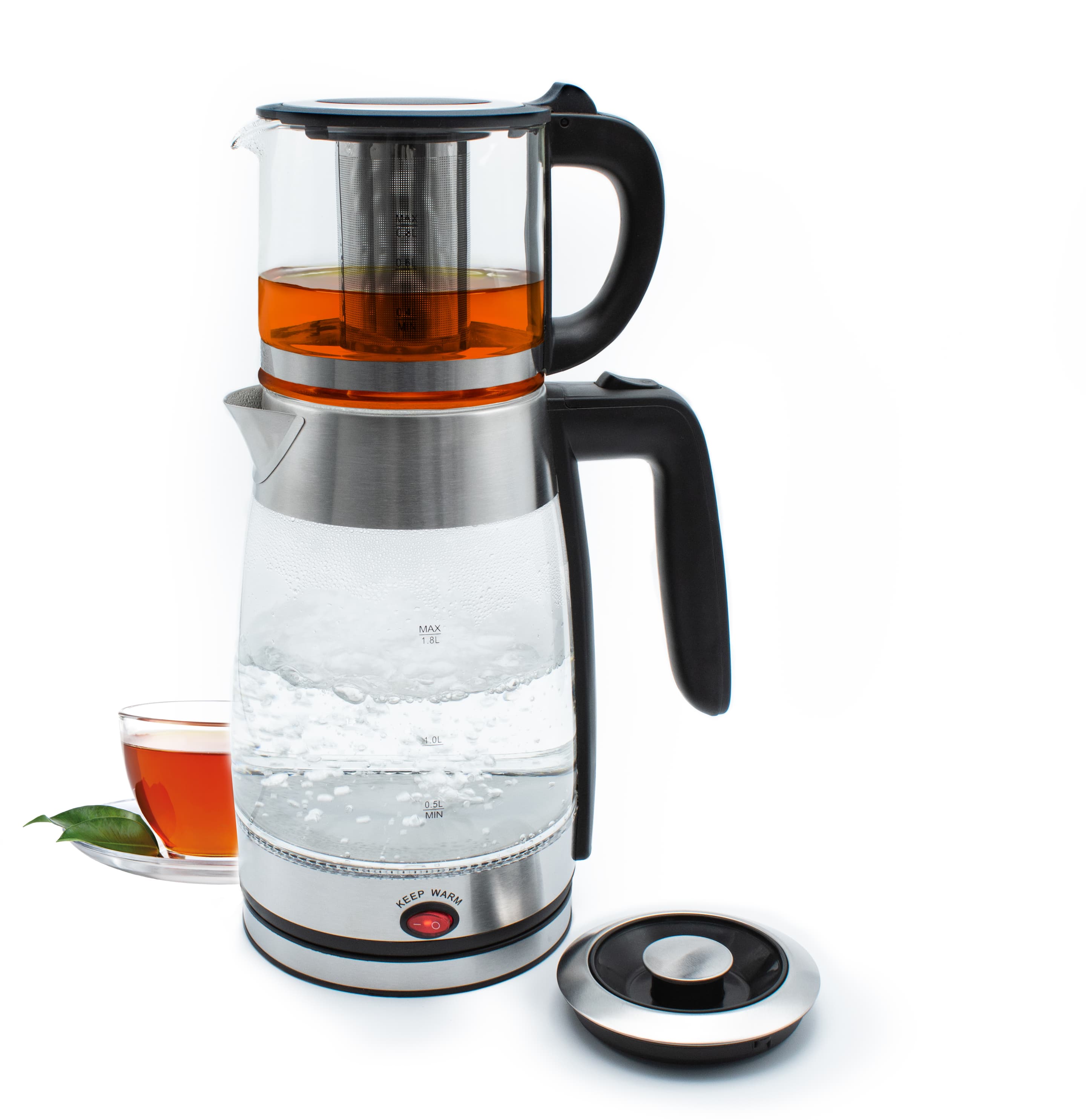 Wasserkocher mit robustem Borosilikatglas-Gehäuse, 1,8 L Fassungsvermögen und 0,8 L Teekanne. Mit 360°-Basis, Warmhaltefunktion bis 85 °C, verdecktem Edelstahl-Heizelement, Trockenlaufschutz sowie automatischer und manueller Abschaltung – sicher und komfortabel im Gebrauch.