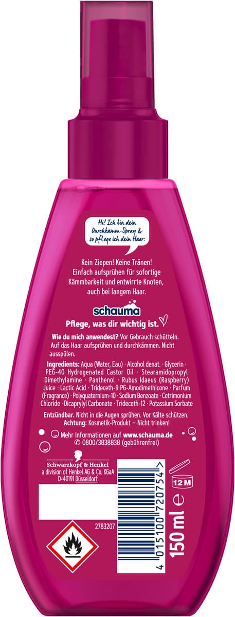 - Speziell für Kinder – Das Schauma Durchkämm-Spray wurde mit einer pflegenden Formel speziell für Kinderhaar entwickelt und duftet frisch nach Himbeeren