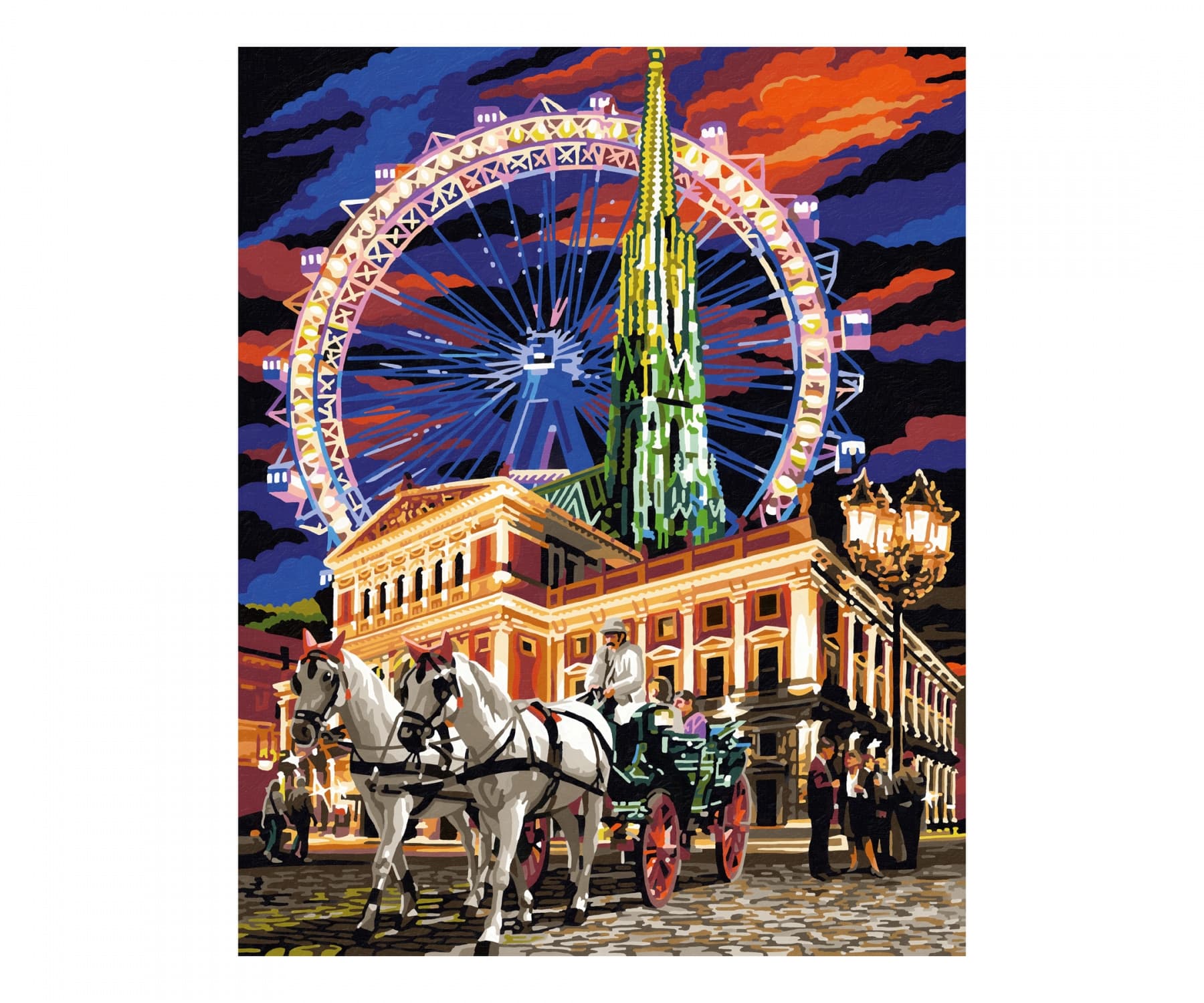Sie war jahrhundertelang kaiserliche Reichshaupt- und Residenzstadt der Habsburger und entwickelte sich in dieser Zeit zu einem kulturellen und politischen Zentrum Europas. Die beliebtesten Sehenswürdigkeiten und Wahrzeichen Wiens sind auf dieser Collage vereint: Der Stephansdom im Zentrum der Stadt, das Riesenrad im Prater und der Wiener Musikverein. Der Fiaker im Vordergrund lädt zu einer romantischen Stadtrundfahrt ein.