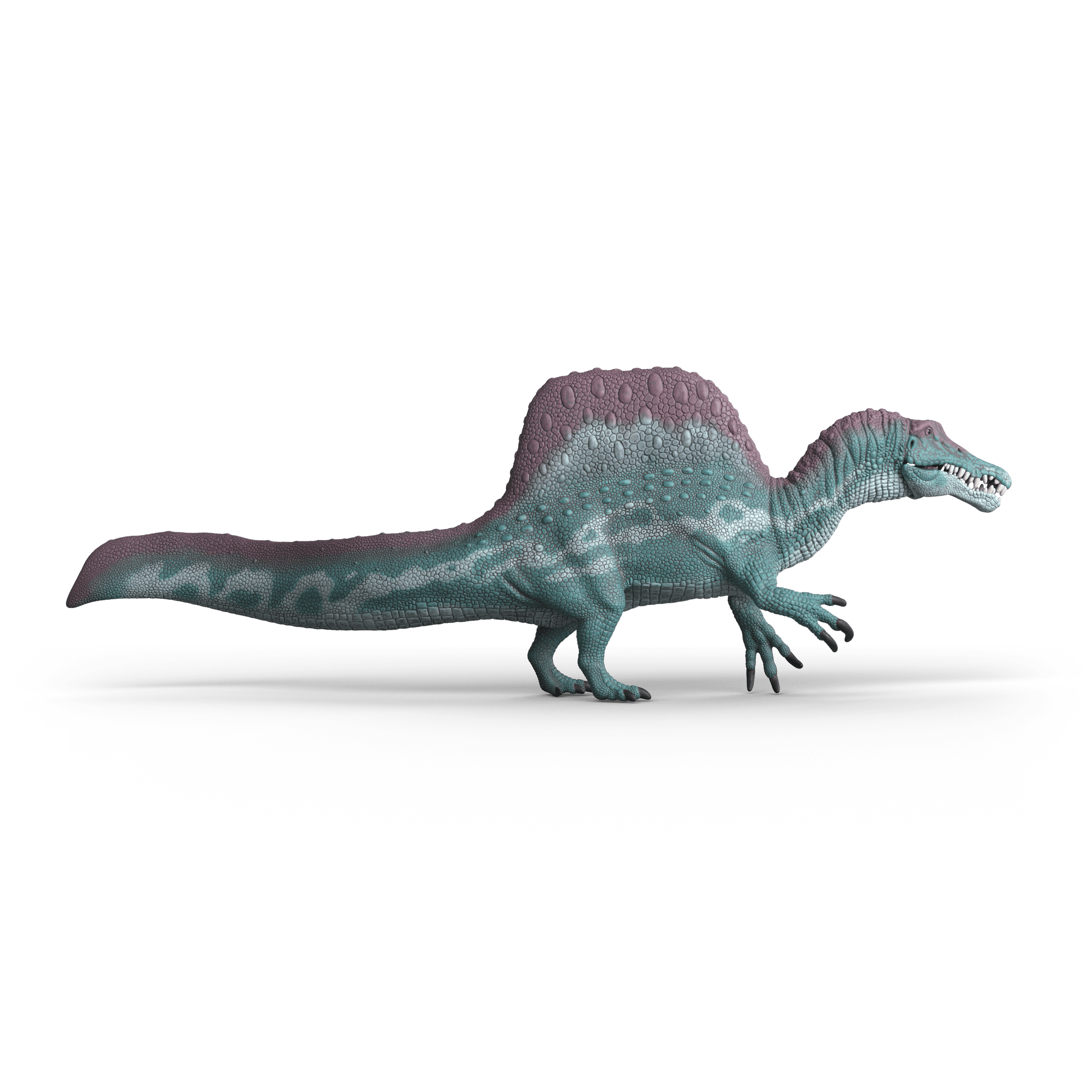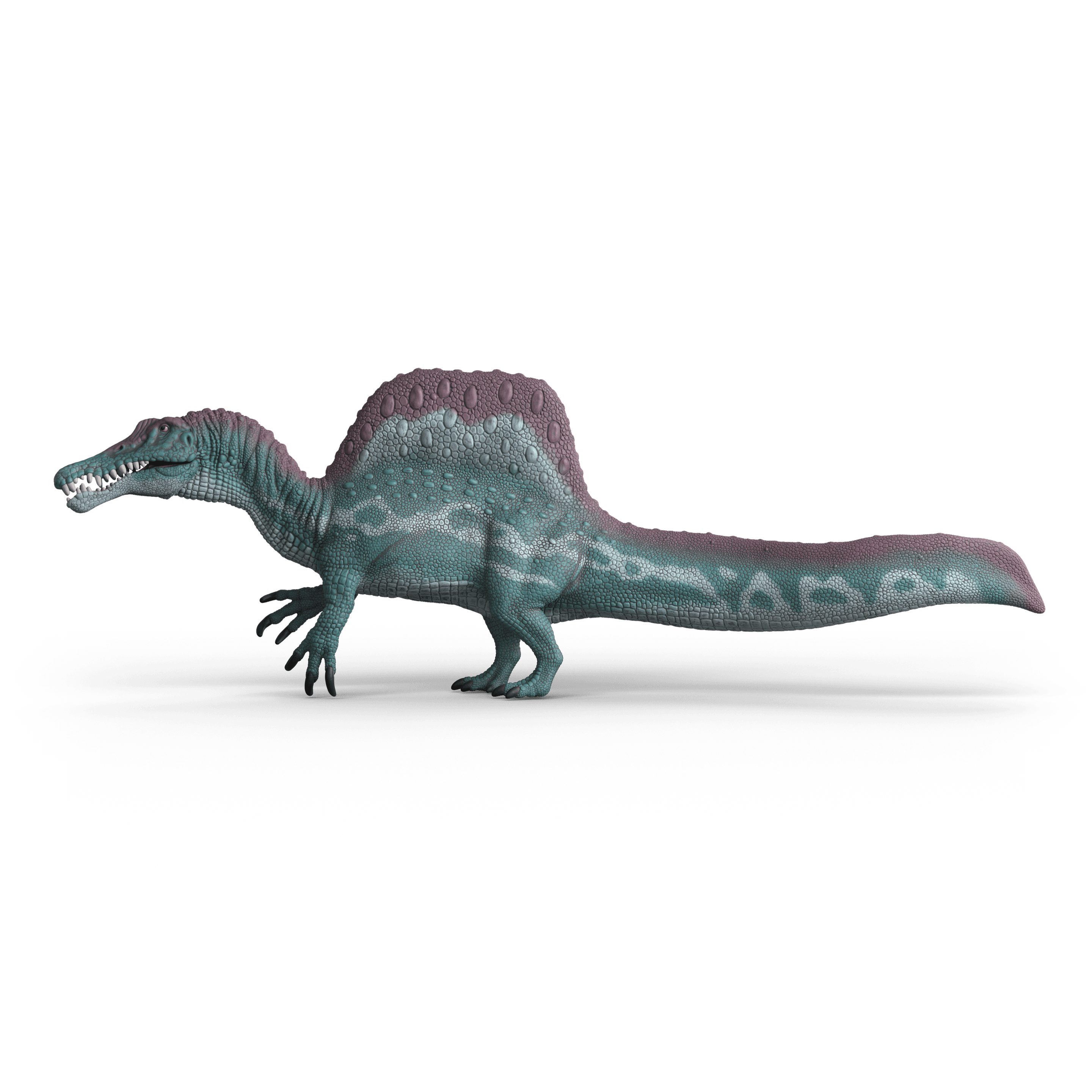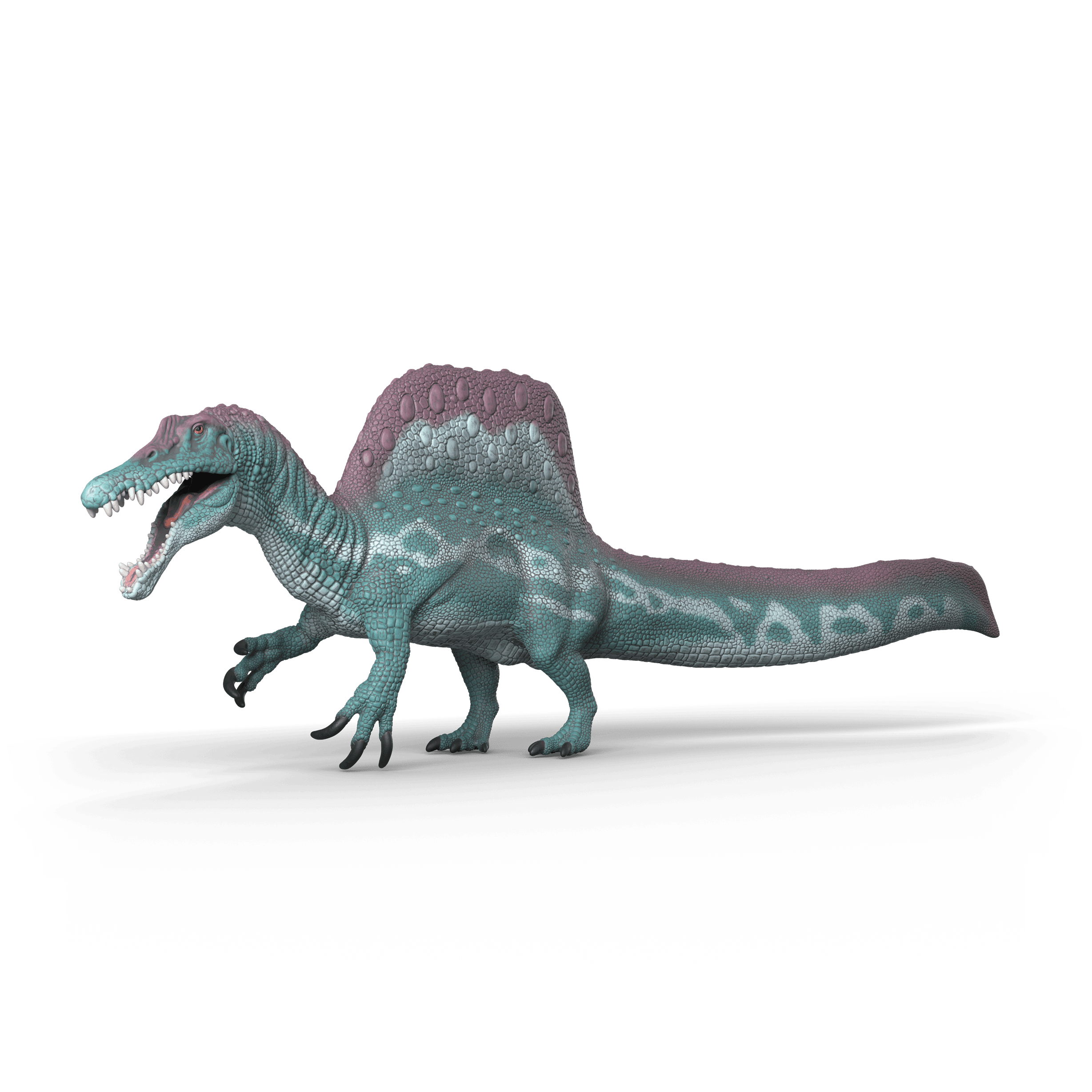 Der Spinosaurus sieht ziemlich beeindruckend aus. Mit seinem hohen Höcker auf dem Rücken ist er schon von Weitem zu sehen. Seine schöne Echsenhaut schiert dunkelgrün und schwarz mit einem hellen Muster auf der Seite. Man sollte dem Fleischfresser aber besser nicht zu nahekoen. Wenn er seinen Kiefer aufreißt, werden nämlich gefährlich scharfe Reißzähne sichtbar. Nichts wie weg!