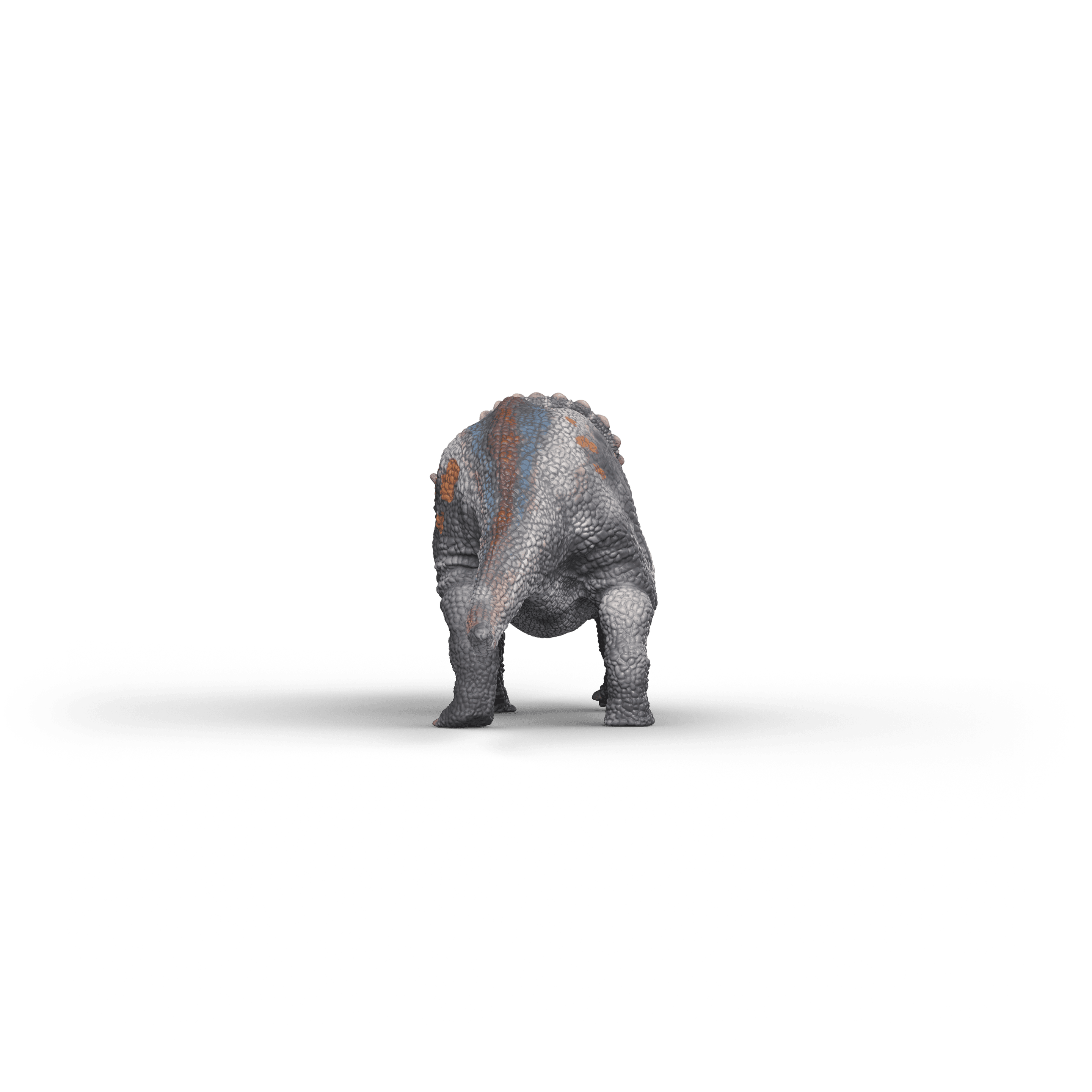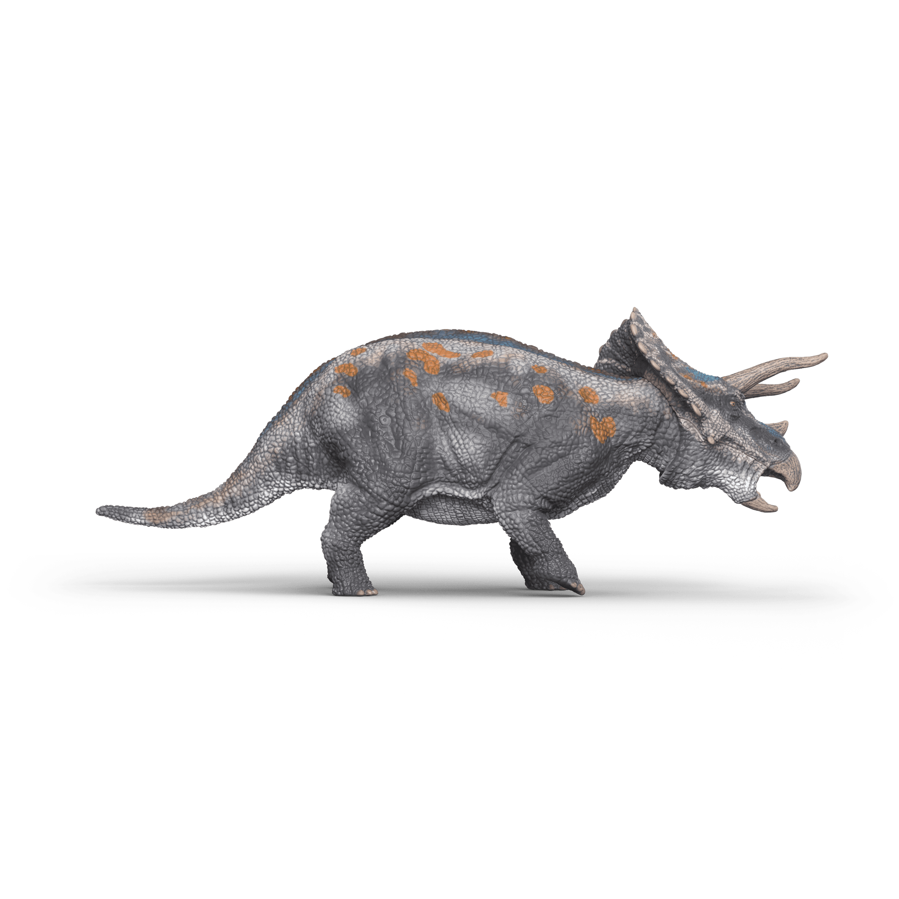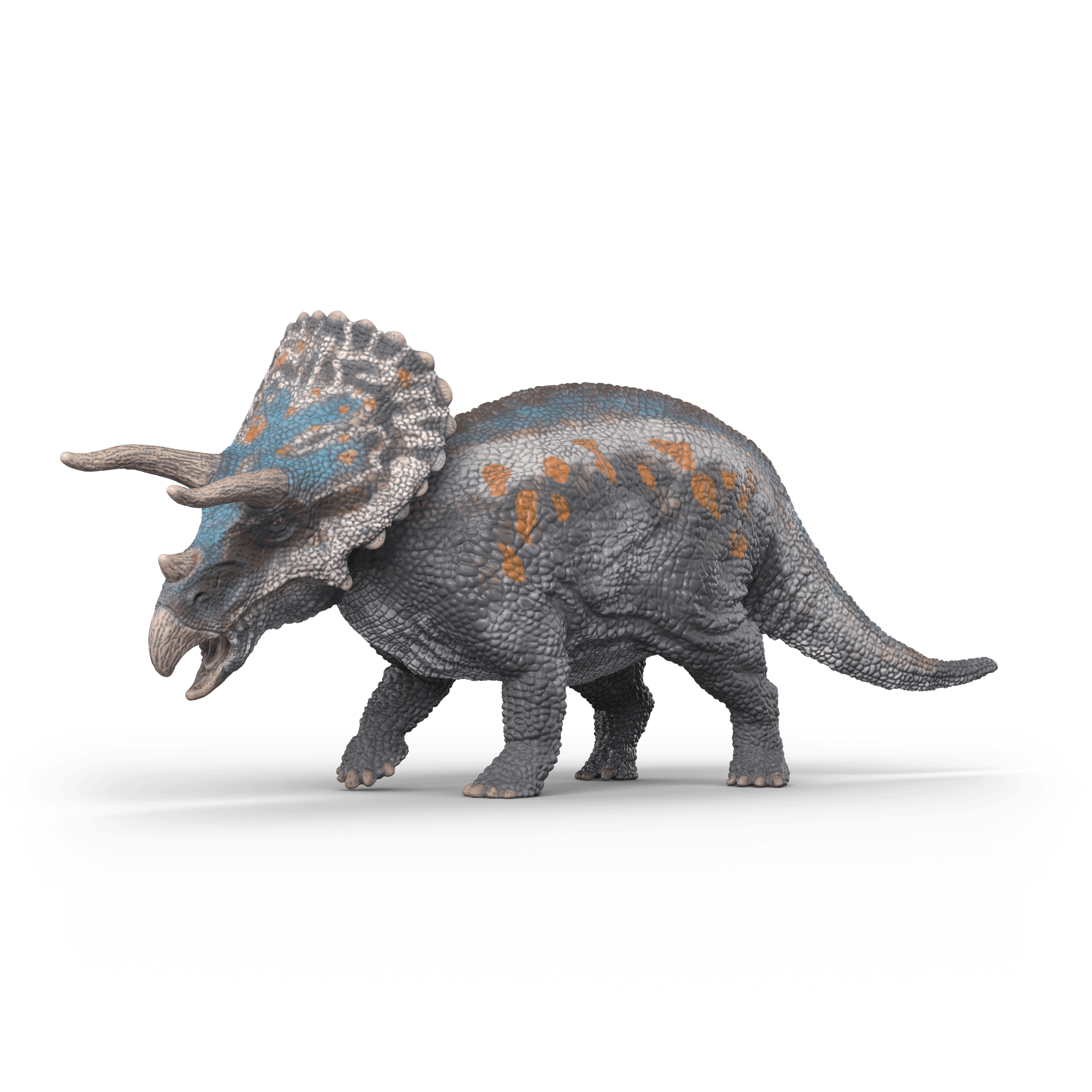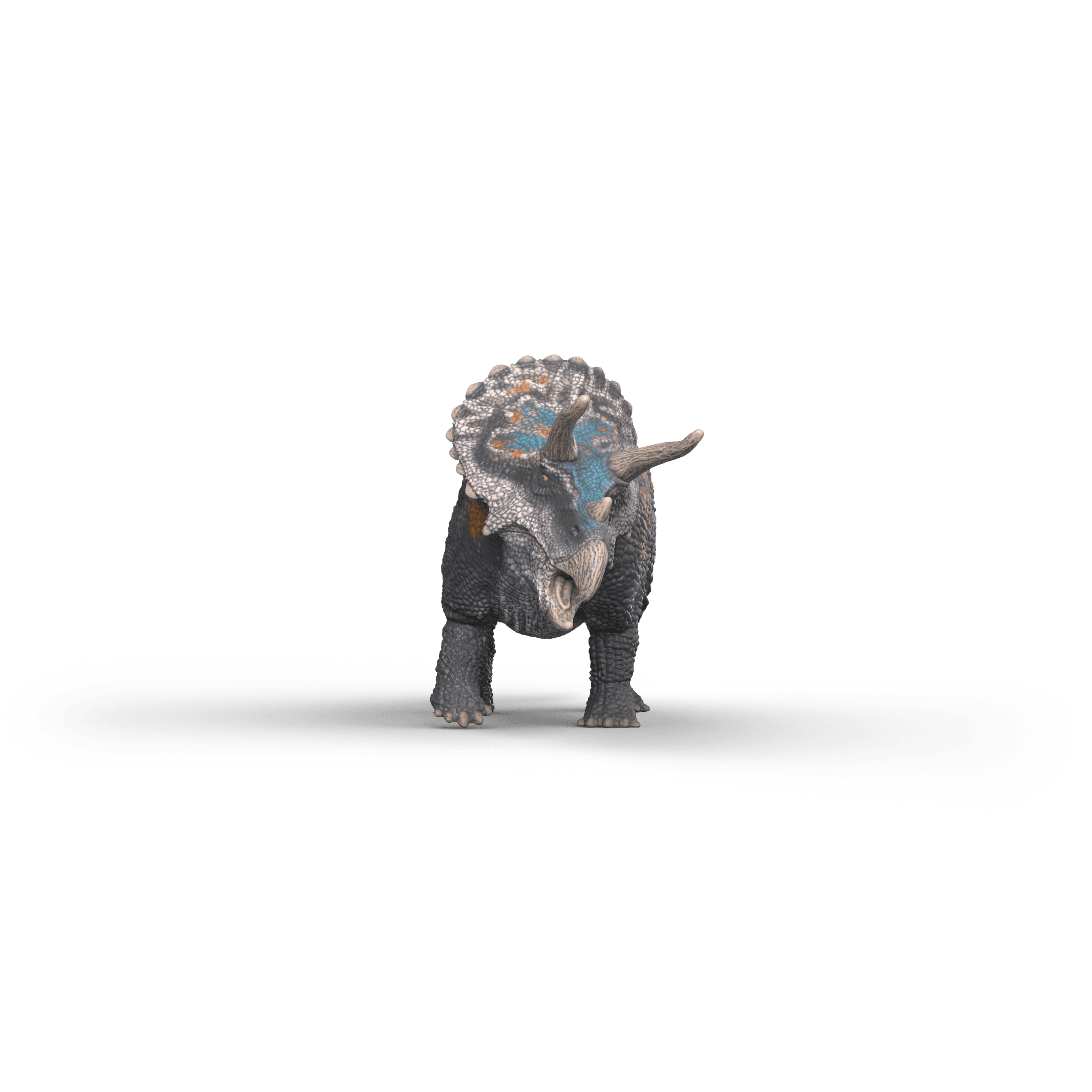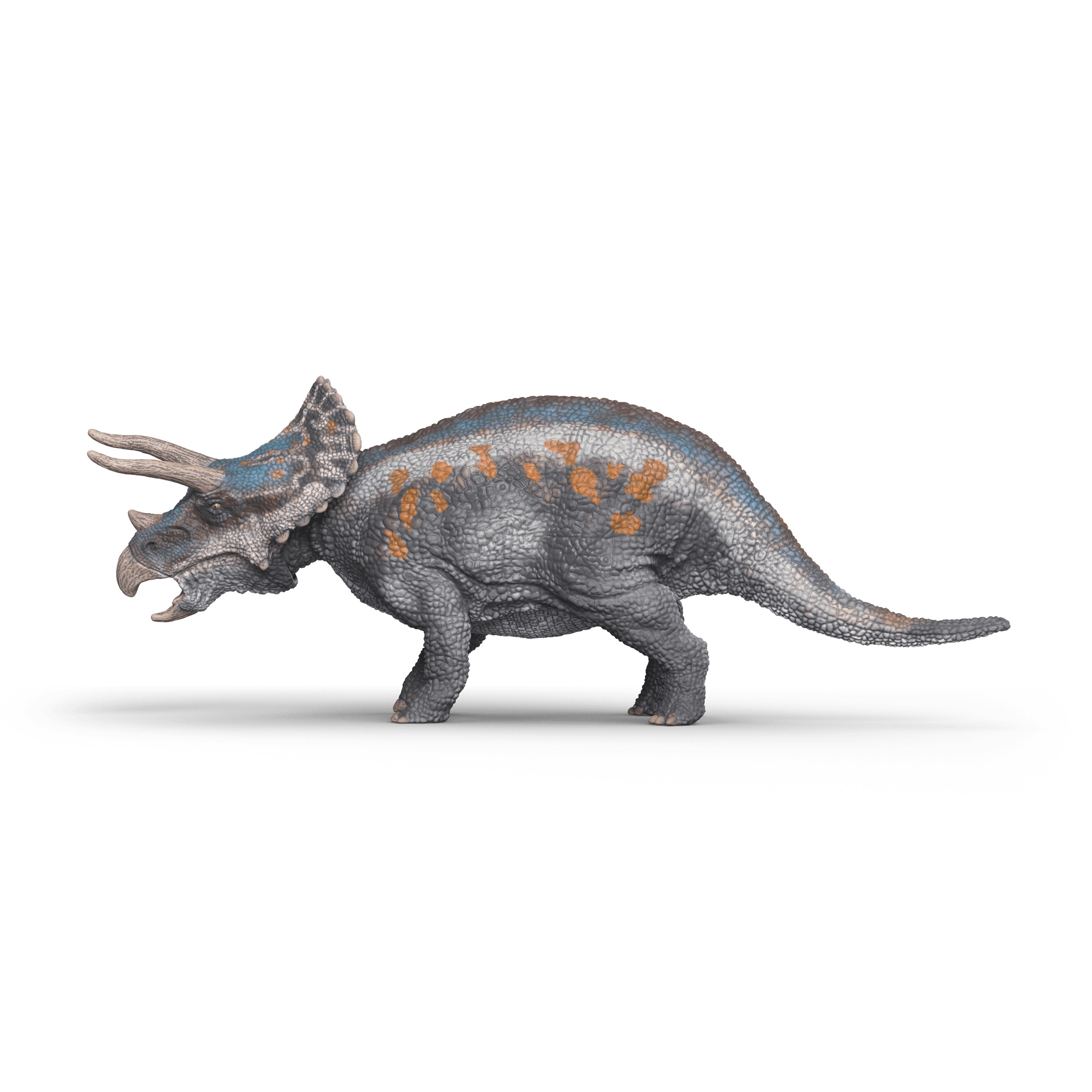 Den Triceratops erkennt man sofort an seinen langen Hörnern über den Augen und dem großen Nackenschild, das seinen beweglichen Kopf wie ein Kragen umgibt. Der Dinosaurier hat eine graue Echsenhaut, die bläulich-gelb gemustert ist. Besonders am Kopf und der Stirn ist der beliebte Koloss aus der Urzeit schön gezeichnet. Ein echter Hingucker!