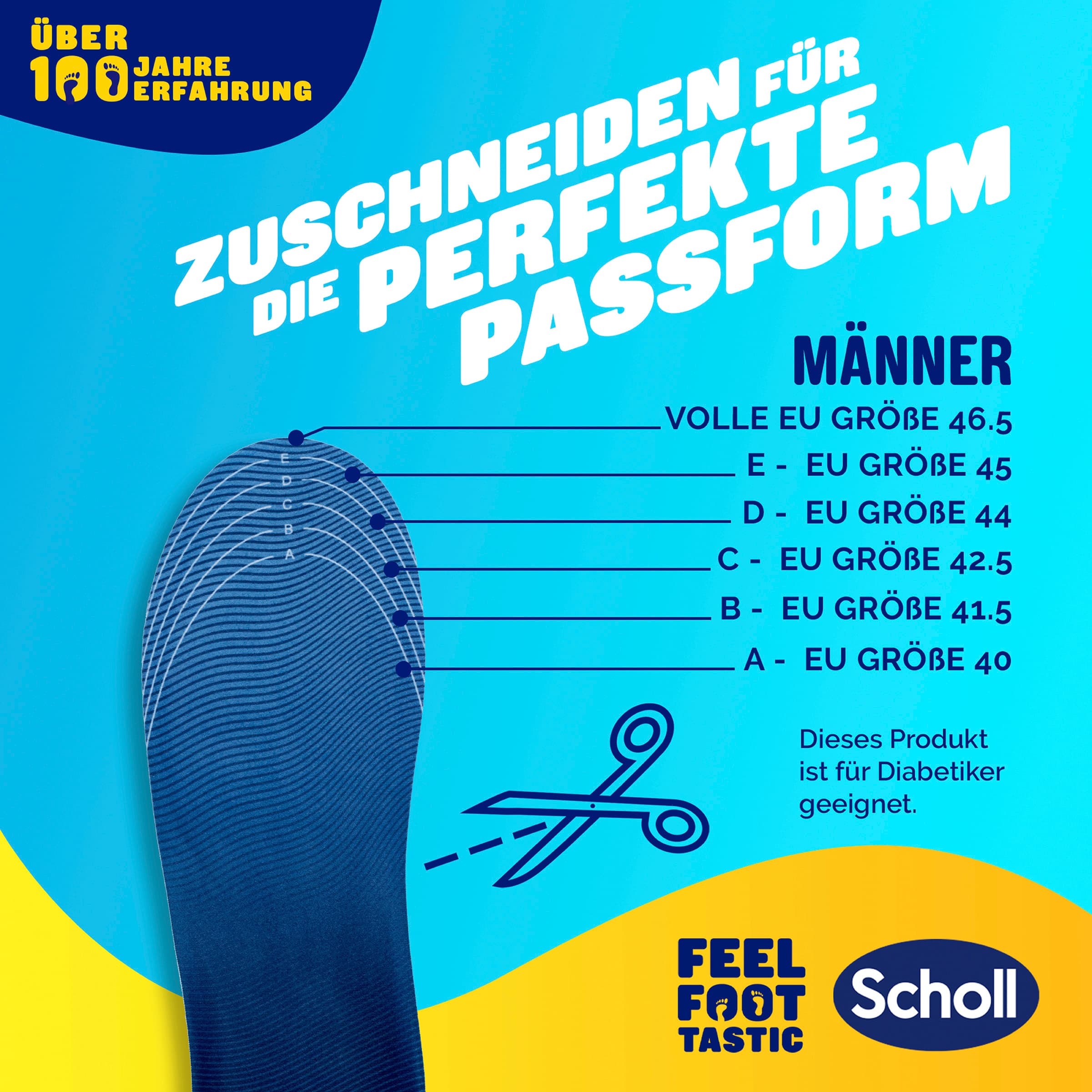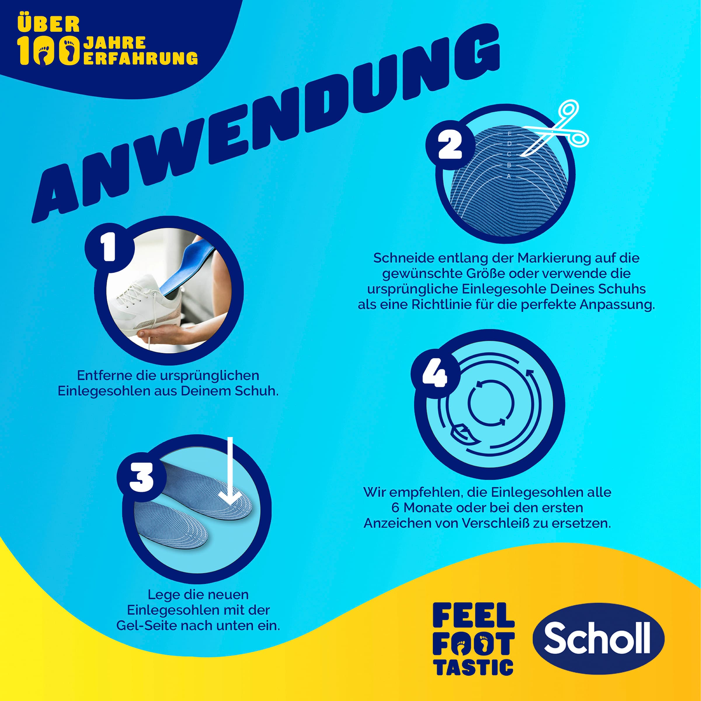 AnwendungshinweisEntferne die ursprünglichen Einlegesohlen aus Deinem Schuh. Schneide entlang der Markierung auf die gewünschte Größe oder verwende die ursprüngliche Einlegesohle Deines Schuhs als Richtlinie für die perfekte Anpassung. Wir empfehlen, die Einlegesohlen alle 6 Monate oder bei den ersten Anzeichen von Verschleiß zu ersetzen.