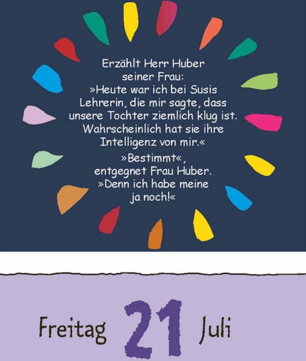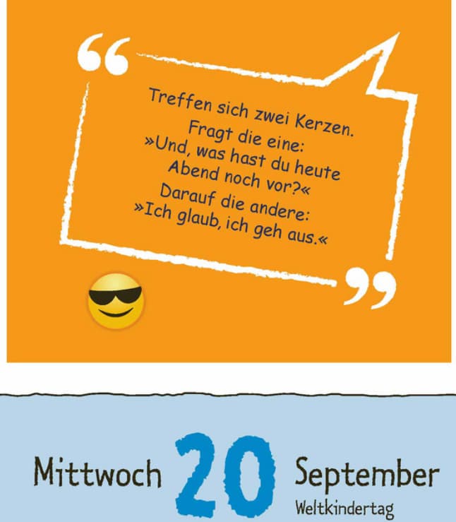 Über 300 geniale Witze zum Weitererzählen und natürlich, um sich jeden Tag selbst vor Lachen wegzuschmeißen. Kalender zum Aufstellen oder Aufhängen. Je Wochentag ein Kalenderblatt, Samstag/Sonntag auf einem Blatt.