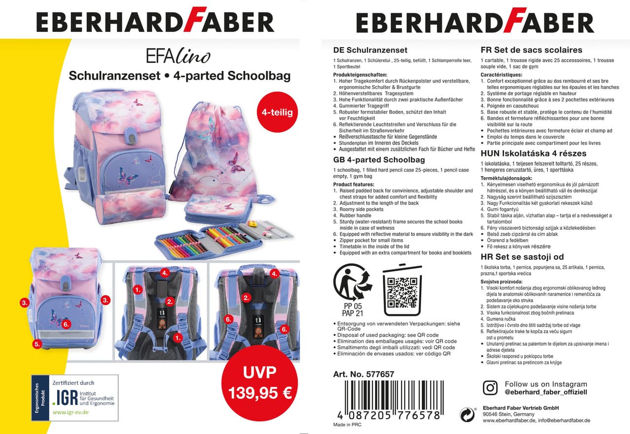 Die vierteiligen Schulranzensets beinhalten neben dem passenden Sportbeutel und Schlamperrolle auch ein befülltes Schüleretui; Alle Ranzen sind höhenverstellbar und wachsen mit den Kindern mit; Durch die Höhenverstellbarkeit, das gepolsterte Rückenteil und die verstellbaren Schultergurte genügt der Ranzen den höchsten ergonomischen Ansprüchen und bietet gleichzeitig einen hohen Tragekomfort; Der Brustgurt verhindert das Abrutschen des Ranzens; Der Schulranzen bietet viel Stauraum, und hat ein geringes Tragegewicht; Der stabile Boden ist unkaputtbar und wasserabweisend; Reflektoren an den Vorder- und Seitentaschen sorgen für Sichtbarkeit und Sicherheit der Kinder